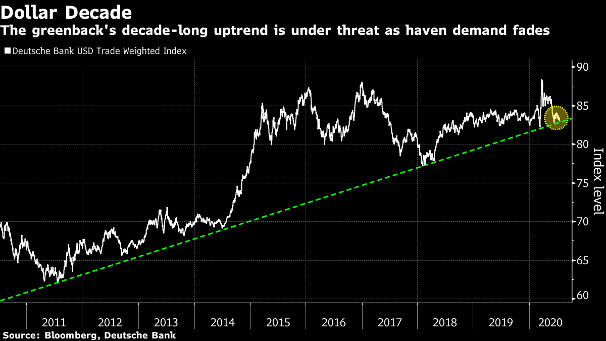 | Want the lowdown on what's moving European markets in your inbox every morning? Sign up here. Good morning. China's economy returned to growth, a Twitter hack targeted politicians and business leaders, and it's ECB day. Here's what's moving markets. Looking Up The Chinese economy returned to growth in the second quarter, marking a significant milestone in the global struggle to recover from the Covid-19 pandemic. Even so, the economy is still 1.6% smaller than at the end of the first half in 2019 and retail sales shrank more than expected. Asian stocks slipped along with European and U.S. equity futures, as virus hotspots in the U.S. remained a focus. California's surge in infections continued, with the largest U.S. state reporting near-record increases in cases and deaths, while Los Angeles had record hospitalizations. And adding to concerns, data showed that the virus also appears to be spreading in Asia in unknown ways. Cryptic Tweets Twitter accounts of some of the most prominent U.S. political and business leaders, from Barack Obama and Joe Biden to Jeff Bezos and Warren Buffett, were hacked in an apparent effort to promote a Bitcoin scam. The attacks were stunning in scope and almost certainly coordinated. Others whose accounts were caught up included Bill Gates, Elon Musk, Kanye West, Uber Technologies Inc., Apple Inc. and Michael Bloomberg, the founder and majority owner of Bloomberg News parent Bloomberg LP. The accounts sent out tweets promising to double the money of anyone sending funds via Bitcoin within 30 minutes. As the hack unfolded, verified Twitter accounts suddenly lost the ability to post new tweets. Within hours, Twitter said access has been restored for most accounts. ECB Day While the ECB is expected to hold interest rates and asset purchases steady this afternoon, there is an off-chance it could tweak rules on cash deposits to help lenders cope with the pain of negative interest rates. Investors are also looking for clarity on whether the central bank plans to spend all of its 1.35 trillion euro emergency asset-purchase program, or exit early if Europe's recovery outpaces expectations. Executive board member Isabel Schnabel and governing council member Klaas Knot have suggested that the ECB may not exhaust the full amount. Most economists surveyed by Bloomberg expect the purchase program to grow by another 500 billion euros this year. Data Drama A day after Apple Inc.'s victory against an EU tax order, fellow tech behemoth Facebook Inc. is bracing for a landmark EU top court ruling on trans-Atlantic data transfers. The case was brought by an Austrian privacy activist who has challenged Facebook's handling of EU citizens' data ever since Edward Snowden's spying revelations in 2013. A ruling against the existing mechanism could upend the handling of cross-border data by Facebook and thousands of other companies, who would need to scramble for a replacement or suspend the transfers. In 2015, when the same court ruled in the same activist's favor and threw out a previous data transfer framework, the disruption enraged affected companies. This time, the EU has done its homework to prevent a repeat of the turmoil, the bloc's Justice Commissioner told Bloomberg. Coming Up… Online retailer Zalando SE and lab equipment maker Sartorius AG -- both stock market outperformers throughout the virus crisis -- were the latest European companies to boost 2020 forecasts overnight. Luxury group Richemont's first-quarter sales fell by nearly half, a worse decline than analysts had expected. Still to come, industrial group Atlas Copco AB and credit tracker Experian Plc are among other companies set to release quarterly updates, and we'll get a glimpse into Britain's employment recovery. Highlights in the afternoon include the ECB's monetary policy decisions and U.S. initial jobless claims. What We've Been Reading This is what's caught our eye over the past 24 hours. And finally, here's what Cormac Mullen is interested in this morning The slump in the dollar is threatening to bring to an imminent end its near-decade-long uptrend against major peers. Deutsche Bank's Trade-Weighted Dollar Index -- a gauge of the currency against the U.S.'s most important trading partners -- has fallen to test the trendline in place since 2011, a break of which would be an important signal for dollar bears. The index has dropped more than 1% so far this month amid weakening demand for havens, an ongoing rally in risk assets and a shift in sentiment toward currencies like the euro and yuan. Dollar strength has been a feature of much of the last 10 years. The trade-weighted basket climbed over 40% from the 2011 low to its recent peak in March, at the height of coronavirus fears. Yet a growing chorus of commentators is calling for the currency to decline, as the global economy attempts to recover from the impact of the pandemic. A breach of the uptrend would confirm this bearish bias and could give a fresh boost to assets which benefit from dollar weakness -- the euro and emerging market securities to name just two. A rebound from here could lead to a renewed bout of risk-off sentiment for global markets. Cormac Mullen is a cross-asset reporter and editor for Bloomberg News in Tokyo. Like Bloomberg's Five Things? Subscribe for unlimited access to trusted, data-based journalism in 120 countries around the world and gain expert analysis from exclusive daily newsletters, The Bloomberg Open and The Bloomberg Close. |