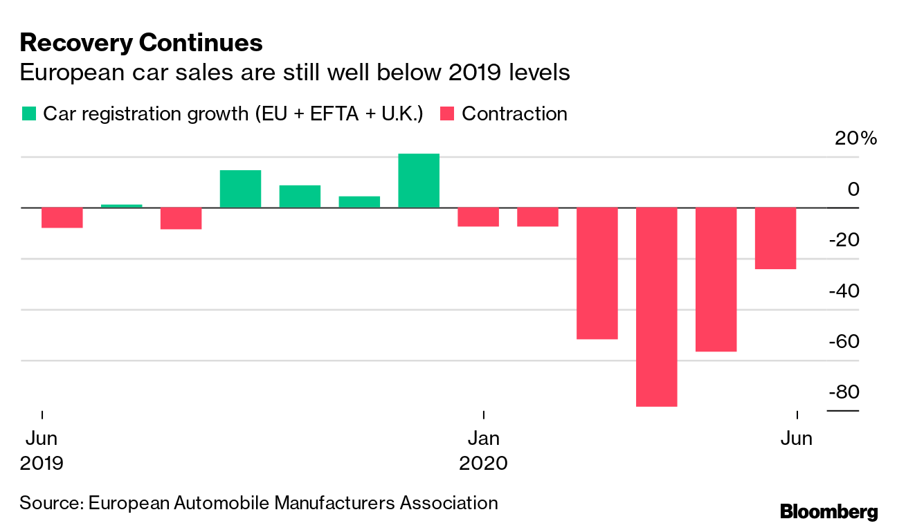 | Welcome to the Brussels Edition, Bloomberg's daily briefing on what matters most in the heart of the European Union. After months of virtual summits, EU leaders will today meet in person for the first time since February to try and settle their differences over a radical 750 billion-euro fund designed to help the bloc's economies recover from the worst recession in living memory. The meeting is expected to run into the weekend and it's anyone's guess when or how it will end. And while leaders agree on the need for action, they're still deeply divided over key issues, including the size and makeup of the fund and, crucially, its governance. With all that's at stake, a swift agreement would be welcome. But given the amount of money on the line, it's unlikely any side will compromise without first putting up a fight. — Viktoria Dendrinou What's Happening Still Talking | Brexit negotiators have been informally discussing the biggest sticking points in Brussels this week, like state-aid rules and the role of the European Court of Justice. There's pressure on both sides to show signs of progress in talks taking place in London next week. Alexa, Stop | Voice assistants such as Siri and Alexa face scrutiny after the EU opened an antitrust inquiry into how Silicon Valley uses data to tighten its grip on growing markets. Regulators say they see signs that tech giants may be working to keep competitors out. Vaccine Update | Pressure is growing on AstraZeneca to deliver positive results from early tests for the coronavirus vaccine it's developing with University of Oxford researchers. Data expected on Monday will be closely scrutinized as governments seek to end the destructive pandemic. Science Theft | Meanwhile, Russia is hacking international research centers developing a Covid-19 vaccine, according to the U.K., U.S. and Canada. The intelligence bombshell comes at a delicate time with a U.S. election in November and the world economy plunging into recession. In Case You Missed It Data Trouble | The EU's top court issued a stinging rebuke of potential U.S. surveillance, striking down the so-called Privacy Shield, a key method to transfer data across the Atlantic. Thousands of companies that ship commercial data to the U.S. risk turmoil in their day-to-day activities. Holding Steady | ECB President Christine Lagarde said she won't let monetary policy be constrained as she fights to support the euro area's economic recovery from the pandemic. With coronavirus cases in check, the ECB kept its emergency monetary stimulus unchanged. Trading Reprieve | EU-based investors should have an easier time trading the world's equities on foreign markets, including possibly in the U.K. after Brexit, according to the bloc's markets regulator ESMA. The EU has indicated that it's not ready to open access to many parts of London's financial markets. Swedish Defense | Swedish Prime Minister Stefan Lofven said he's in no doubt his country's highly controversial strategy for fighting Covid-19 remains appropriate. That's even as immunity remains elusive there in spite of much higher rates of exposure. Chart of the Day Europe's car industry extended a tentative recovery for a second straight month, leaving manufacturers and dealers hoping state subsidies will help spur a stronger rebound. New passenger-car registrations fell 24% in June, the European Automobile Manufacturers Association said yesterday. That's an improvement on May's 57% drop and April's 78% slump. Today's Agenda All times CET. - Special EU summit to discuss EU's next long-term budget, jointly-financed recovery plan