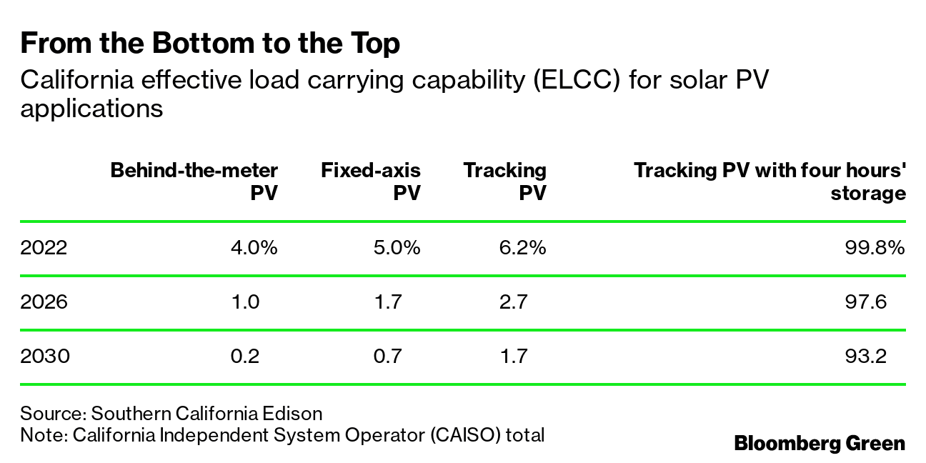 But add four hours of energy storage and solar's capabilities change dramatically. A solar project with four hours of storage in 2022 will have a 99.8% effective load carrying capability—essentially a total ability to ensure the grid remains reliably supplied with power. That value declines slightly over time, as more solar comes on line, but by not much.