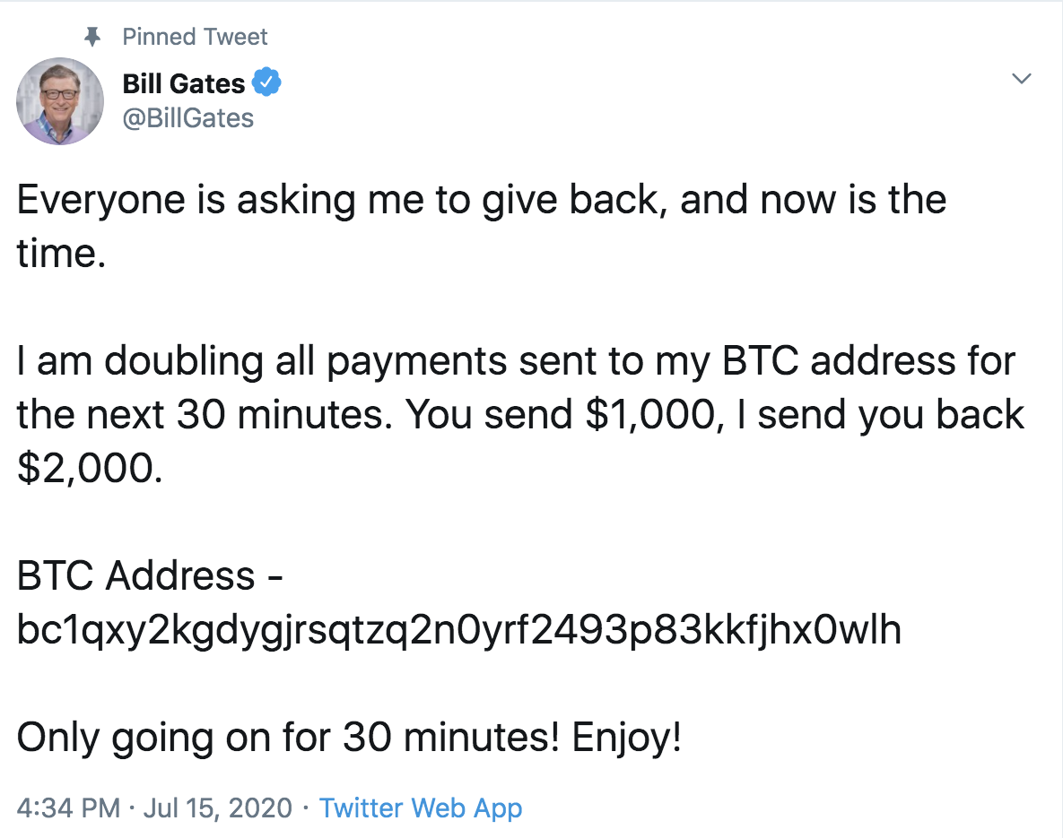 And finally … Twitter accounts of top U.S. political and business leaders, from Barack Obama and Biden to Bill Gates, Jeff Bezos and Warren Buffett, were hacked yesterday in an apparent attempt to promote a Bitcoin scam. The hack, which sent out tweets promising to double the money of anyone sending funds via Bitcoin within 30 minutes, also hit Elon Musk, Kanye West, Uber, Apple and Michael Bloomberg, the founder and majority owner of Bloomberg News parent Bloomberg LP. Twitter said it's investigating the security breach. The address tweeted by the hackers received more than $110,000 in Bitcoins. |