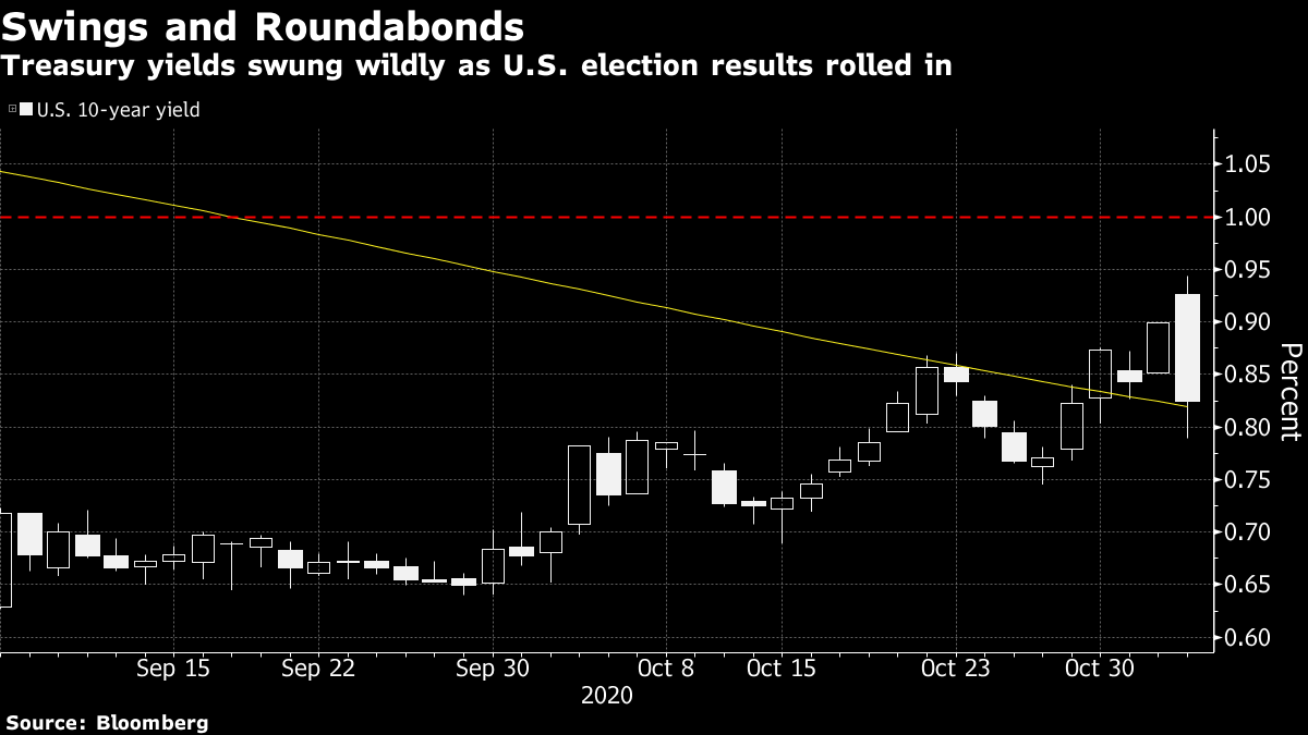 | Good morning. The U.S. election is keeping traders on edge, China is cracking down on Ant Group and the U.K. parliament will vote on lockdown measures. Here's what's moving markets. Election In BalancePresident Donald Trump's strong showing across the Sun Belt in early results appeared to significantly shrink Democratic nominee Joe Biden's path to the White House, with Trump victorious in the key battleground state of Florida. Elsewhere, the president won Ohio and Biden won Minnesota, states that each candidate had sought to take from the other but wound up politically unchanged from 2016. "We believe we're on track to win this election," Biden said on stage in Delaware, while Trump said on Twitter "we are up big," adding that he'll also be making a statement. Battleground states including North Carolina, Georgia, Pennsylvania, Wisconsin and Michigan remain undecided. Follow Bloomberg's live blog here. Long Night Markets are in limbo after a long night for traders, with U.S. equity futures volatile ahead of a potentially long and disruptive vote count. Nasdaq 100 contracts rose fast enough to trigger an exchange halt that pauses especially rapid swings. European futures are fluctuating, while away from equities, gold fell and oil pared gains as tight races in battleground states shook initial faith in a decisive outcome. Treasuries jumped and the dollar climbed. China Targets AntTuesday's shock suspension of Ant Group's $35 billion initial public offering is just the beginning of a renewed campaign by China to rein in the fintech empire controlled by Jack Ma. Authorities are now setting their sights on Ant's credit platforms that funnel loans from banks and other financial institutions to millions of consumers across China, according to people familiar with the matter. Ant has faced scrutiny in Chinese state media after Jack Ma criticized regulators for stifling innovation, and for their policies toward the young. Ma's Alibaba Group Holding, an Ant shareholder, saw its own stock slump after the suspension news. U.K. Lockdown VoteU.K. Prime Minister Boris Johnson will hope to push fresh coronavirus lockdown rules through parliament later, facing down rebels in his own Conservative Party who reject the measures. Graham Brady, chairman of the influential 1922 committee of rank-and-file Tory lawmakers, and his deputy, have said they'll vote against the regulations, though the rules appear certain to go through because the opposition Labour party is set to back them. England is due to enter a second lockdown on Thursday. Coming Up…Today's busy earnings schedule includes carmaker BMW, retailer Marks & Spencer Group and lender Danske Bank. Elsewhere, China Caixin services PMI topped estimates overnight and we'll get U.S. ADP employment numbers later along with an interest-rate decision from Poland. Save the date | Join Bloomberg on Nov. 5 for an exclusive virtual event with Volkswagen CEO Herbert Diess to discuss his plans to transform the world's largest carmaker and build the biggest electric-car fleet globally. Get the details and sign up here. What We've Been ReadingThis is what's caught our eye over the past 24 hours. And finally, here's what Cormac Mullen is interested in this morningWhile early post-election trading has seen some decent price swings, at least in terms of asset classes flipping between gains and losses, the more interesting moves have been in Treasuries. Benchmark yields jumped first through 0.9% on a surge of reflation bets before slumping back through 0.8% as initial results suggest a closer contest than might have been predicted. The closer yields move to 1%, the more the chatter will grow about when the Federal Reserve will likely step in to push them down again. That -- and the paltry yields available in many non-U.S. markets -- should lead to a decent amount of buying interest at those levels, as we got a first glimpse of on Wednesday. Meanwhile, yields found a floor just around their 200-day moving average, which was breached a few sessions ago for the first time since 2018. That suggests an area where sellers are happy to make a stand. Treasuries will likely remain under pressure whoever ends up the winner as a stimulus bill is expected to come sooner rather than later. But if 10-year yields move back up toward 1%, it will take a brave bond bear to go toe-to-toe with the Fed.  Cormac Mullen is a Cross-Asset reporter and editor for Bloomberg News in Tokyo. Like Bloomberg's Five Things? Subscribe for unlimited access to trusted, data-based journalism in 120 countries around the world and gain expert analysis from exclusive daily newsletters, The Bloomberg Open and The Bloomberg Close. |