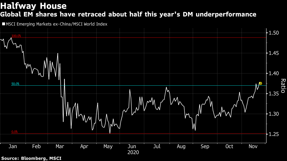 | Want the lowdown on what's moving European markets in your inbox every morning? Sign up here. Good morning. The transition process in the U.S. takes a step forward, the debate on vaccine efficacy rages and governments continue to contend with virus responses. Here's what's moving markets. Biden's TeamU.S. President-elect Joe Biden continues to fill up posts in his administration, with former Federal Reserve Chair Janet Yellen set to be nominated as Treasury Secretary. That news was welcomed by Wall Street, with investors cheered by the prospect of her working effectively with the central bank to help the economy bounce back. Elsewhere, former Secretary of State John Kerry is to be appointed climate czar, a key policy area likely to attract much attention from a booming global renewable-energy industry. President Donald Trump, meanwhile, faces increasing calls from allies across the spectrum to concede and move on, a development which came a step closer as Biden's team won their battle to trigger the formal transition process. Vaccine VarietyAnother week gets underway, another vaccine candidate produces early results to be pored over, turning everyone into amateur epidemiologists. The shot from AstraZeneca and Oxford University appears to work, though some analysts took a skeptical view of the initial trial results. Now the scramble to get hold of it begins in earnest -- and the challenge of ramping up production, both for this vaccine as well as the inoculations from Pfizer and Moderna, will come into sharp focus. An experimental treatment from Regeneron will also be shipping this week. Meanwhile, Merck splashed out on a deal to buy OncoImmune in order to get hold of a possible therapy for severe Covid infection. Bleak OutlookThe impact of Covid-19 on the U.S. continues to worsen, with the Centers for Disease Control and Protection warning that another 30,000 people could be killed by the virus by Christmas. New York has opened an overflow ward to cope with the rush of patients and a study has tied a significant number of infections early in the pandemic to meatpacking plants. Elsewhere, the U.K. will end its national lockdown on schedule on December 2 but confirmed that the next phase will be tougher regional restrictions. An easing of tourist quarantine restrictions, however, could help the beleaguered travel sector. Meanwhile, Hong Kong is shuttering more indoor entertainment venues and Japan too is eyeing tighter regional rules. Market OptimismEuropean and U.S. equity-futures are trending solidly higher going into Tuesday's session, buoyed by the ongoing vaccine optimism, Yellen's appointment and the triggering of the formal transition process to Biden. Oil prices are at the highest level since March on hopes that demand will bounce back. The dollar touched the lowest since 2018 on Monday before gaining ground and gold is at a four-month low amid the risk-on mood. Still, global leaders are warning that a vaccine will not be a quick-fix, and a fresh downturn in 2021 is still on the cards. A wave of defaults has sent shockwaves through the Chinese credit market. In Europe, fears about the implications of a debt binge are coming into focus. Coming Up…European Central Bank President Christine Lagarde is due to speak on Tuesday along some of her colleagues. One of them, Olli Rehn, has already criticized the "irresponsible" political standoff over virus relief for the European economy. It's a quiet day for economic data but a few stock sector bellwethers and lockdown winners will report in Europe. This includes catering group Compass and Irish building materials firm CRH, along with high-flying pet products retailer Pets at Home, a big beneficiary of consumers spending on cats and dogs during lockdown. What We've Been ReadingThis is what's caught our eye over the past 24 hours. And finally, here's what Cormac Mullen is interested in this morningA third effective vaccine courtesy of AstraZeneca has given a further boost to the global 2021 economic re-opening trade but attention may soon shift to the next phase of the recovery process — logistics. That could take the wind out of the sails of the pro-emerging market investment case, at least in the short-term. While developed countries have snapped up the 95% effective shots from Pfizer and Moderna, Astra's one accounts for more than 40% of supplies going to lower- and middle-income nations. Its efficacy data wasn't quite as good as its two peers and Pfizer and Moderna may have an initial advantage in dealing with production challenges, as their novel messenger RNA technology can be scaled up relatively simply. That could lead to a two-speed vaccine rollout, one which favors wealthier economies. An MSCI gauge of emerging market stocks excluding China has risen 65% since its March low, pulling ahead of the 59% rebound in the MSCI World developed markets index. That's enough to retrace about half of EM's underperformance against developed market stocks this year. There are solid reasons to bet on developing country shares to continue to push higher as the global economic recovery continues. But traders will focus on vaccine logistics at some point, and that might provide a speed bump for what may have looked like an open road ahead for emerging market stocks.  Cormac Mullen is a cross-asset reporter and editor for Bloomberg News in Tokyo. Like Bloomberg's Five Things? Subscribe for unlimited access to trusted, data-based journalism in 120 countries around the world and gain expert analysis from exclusive daily newsletters, The Bloomberg Open and The Bloomberg Close. |