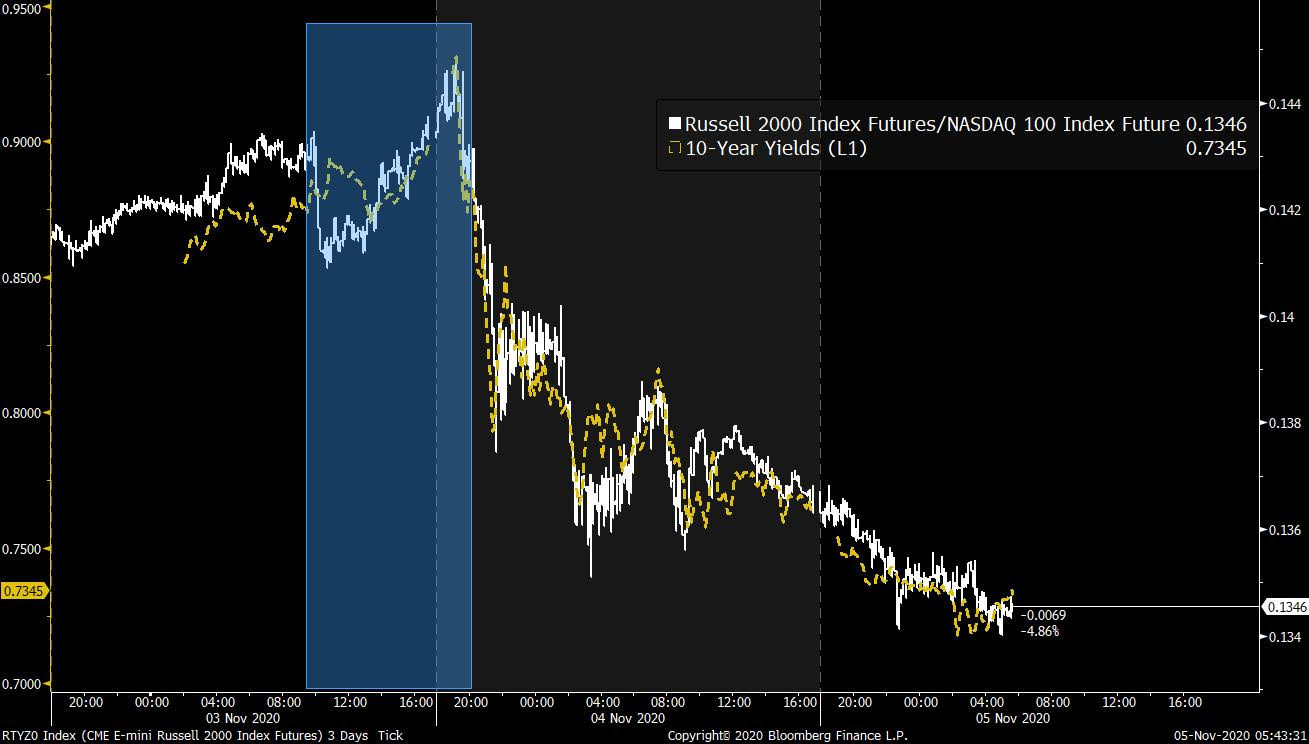 Here's a chart showing the ratio of Russell 2000 futures (small caps) to NASDAQ 100 futures (composed mostly of megacap tech) in white. The yellow dashed line is 10-year yields.