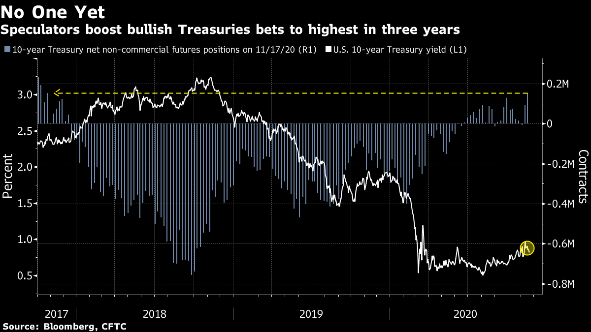 | Good morning. Dollar weakness continues amid vaccine optimism and the U.S. reportedly plans to ban exports to some Chinese tech firms. Here's what's moving markets. Dollar's DeclineThe dollar dropped to a two-and-a-half year low as fast-tracked plans to roll out a Covid-19 vaccine in the U.S. bolstered appetite for risk assets. An index tracking the currency slipped 0.2% after U.S. officials said vaccinations may start in less than three weeks, while Asian stocks began the week with gains alongside European and U.S. equity futures. Global equities remain within a whisker of the all-time high set earlier this month. Still, JPMorgan Chase said rebalancing flows may lead to an exodus of around $300 billion from global shares by the end of the year. Astra AwaitedAfter trial successes from Pfizer and Moderna, findings from the final stage of vaccine studies by AstraZeneca and the University of Oxford are next on the agenda. The stakes for lower- and middle-income nations are immense, as the shot accounts for more than 40% of the supplies going to those countries. Elsewhere, there was positive news on the treatment front, as Regeneron Pharmaceuticals's antibody cocktail received an emergency-use authorization from U.S. drug regulators for treatment of early symptoms. Trump's China Tech PlansThe White House is close to issuing a list of 89 Chinese aerospace and other companies that would be unable to access U.S. technology exports due to their military ties, Reuters reported. A spokesman for the U.S. Department of Commerce declined to comment, the news agency said. Such a move would restrict the companies from buying American goods and technology, Reuters added. It could also fuel already-heightened tensions between the two nations as President-elect Joe Biden prepares to take over from Donald Trump. G20 Discusses ClimateWorld leaders urged countries not to lose sight of climate goals in the coronavirus pandemic, endorsing the aims of the Paris agreement amid hopes that Biden will rejoin the accord. Participants at a virtual Group of 20 summit discussed climate change in a session hosted by Saudi Arabia. "G-20 members should strengthen the fight against climate change, and continue to play a leading role to achieve full, effective implementation of the Paris agreement," Chinese President Xi Jinping said. The U.S. formally exited the accord, which pledges limits on fossil-fuel pollution, earlier this month. Coming Up…We'll get purchasing managers' index data from several regions, while here's what else to look out for on the economy this week. Meanwhile, keep an eye on Bitcoin again as price forecasts soar. Elsewhere, watch cruising stocks after the U.S. escalated its warning for cruise travel to the highest level. Finally, note that Elliott Advisors confirmed it made a proposal to Swiss baking company Aryzta. What We've Been ReadingThis is what's caught our eye over the weekend. And finally, here's what Cormac Mullen is interested in this morningBenchmark Treasury yields are backing further and further away from the 1% level and fast money accounts are betting they will stay that way. Speculative net long positions have jumped to their highest in three years, according to the latest Commodity Futures Trading Commission data. After threatening briefly to hit the closely-watched psychological 1% barrier earlier this month, the U.S. 10-year yield fell back to the 0.82% level on Friday, as investors weighed the impact of tougher virus restrictions against the prospect of a vaccine rollout in the months ahead. Fading hopes for additional fiscal support have also boosted expectations that the Federal Reserve will step in with further monetary support by year-end that will likely include a focus on bond purchases at longer-dated maturities. Policy makers' next decision is scheduled for Dec. 16 and some market commentators have even called for earlier action. The most successful advice for traders so far this year has been don't fight the Fed and the hedge funds look to be back following it after briefly considering lacing up their gloves.  Cormac Mullen is a Cross-Asset reporter and editor for Bloomberg News in Tokyo. Like Bloomberg's Five Things? Subscribe for unlimited access to trusted, data-based journalism in 120 countries around the world and gain expert analysis from exclusive daily newsletters, The Bloomberg Open and The Bloomberg Close. |