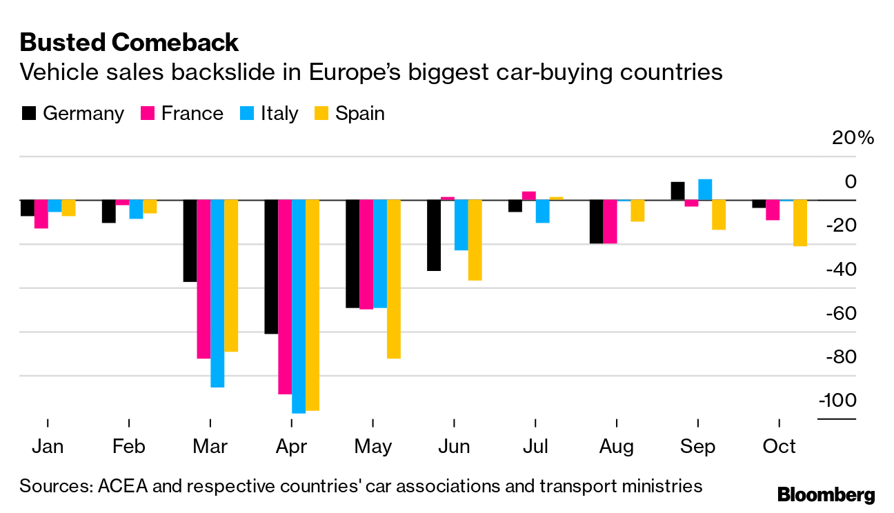 | Welcome to the Brussels Edition, Bloomberg's daily briefing on what matters most in the heart of the European Union. The EU will get a much needed update on the economic outlook today when the Commission presents its latest forecasts. The numbers come shortly after wide swaths of the bloc imposed strict new curbs — like Italy's latest clampdown that hits industrial and financial hubs — to slow a spike in coronavirus infections, quickly rendering previous forecasts out of date. While the economy had bounced back strongly from the first round of restrictions, it could now be headed for another contraction in the final months of the year. That would serve as a remainder to negotiators in Brussels why it would be wise to quickly agree on the outstanding details of their recovery fund. The projections could also strengthen the European Central Bank's resolve to prepare new stimulus, which is already in the works. — Alexander Weber and John Ainger What's HappeningU.S. Election | You can be forgiven for having one eye on the U.S. election. While the outcome isn't final and legal challenges await, Joe Biden won Michigan and Wisconsin, putting him on the cusp of taking the White House from President Donald Trump. Follow the latest here. Brexit Grind | Trade talks between Britain and the EU are still making progress at a snail's pace, with the bloc's chief negotiator Michel Barnier telling ambassadors of the remaining 27 member states that solutions on access to British fishing waters and a level playing field for business continue to be elusive. Time is quickly running out. Final Hurdles | EU lawmakers and governments resume talks today on the rule-of-law mechanism, a key outstanding issue in negotiations over the bloc's 1.8 trillion-euro budget and recovery fund. A breakthrough would be welcome given the rapidly deteriorating economic outlook, and officials say the two sides are close to an accord. Still, disagreements over the contentious issue of top-ups to the budget persist. Lockdown 2.0 | From German beer taverns to al fresco dining in Italy and even yodeling classes in Switzerland, the latest lockdown measures are hitting the things Europeans love most. They're also bringing the specter possibility of a double-dip recession. Read more on the measures being taken here and the latest on the virus's spread here. Taking the Mink | In a fresh blow to vaccine efforts, Denmark has found a new strain of Covid-19 after an outbreak in the country's mink population led to a mutation of the virus. All animals will now be culled — roughly 16 million are raised each year. In Case You Missed ItParis Exit | It marks one year since Trump moved to withdraw the U.S. from the Paris climate accord, and now the country is officially out. Should Biden triumph, rejoining the pact would take only 30 days once he gives notice to the UN. So mark your diaries for Feb. 19, assuming he wins of course. Hungarian Exception | Hungary reported both record coronavirus cases and deaths — the third highest per capita in the EU — yet Prime Minister Viktor Orban's new measures are falling short of those laid out elsewhere in the bloc. To compound matters, two cabinet members have now also tested positive. Green Island | The Greek island of Astypalea is set to embark on a green mobility project, with a little help from German carmaking giant Volkswagen. Car- and ride-sharing offerings will help reduce traffic, and vehicles on the island will switch to electric powertrains that will recharge mostly with locally-produced renewable energy. Hydrogen Boost | Investors backed by the EU launched a program that will harness private investment including from Bill Gates's Breakthrough Energy Ventures fund to jump-start the region's green hydrogen industry. Here's how the gas became the hottest thing in green energy. Chart of the Day Car sales fell in Europe's four largest auto markets last month, signaling the relapse of a demand slump as another wave of the coronavirus cases hit the region. German new-car registrations dropped 3.6% in October, while sales plunged by more than a fifth in Spain, slumped 10% in France and slipped 0.2% in Italy. The figures suggest the industry will be unable to maintain the surprise growth seen in September. Today's AgendaAll times CET. - 11 a.m. Eurostat to release retail trade reading for September