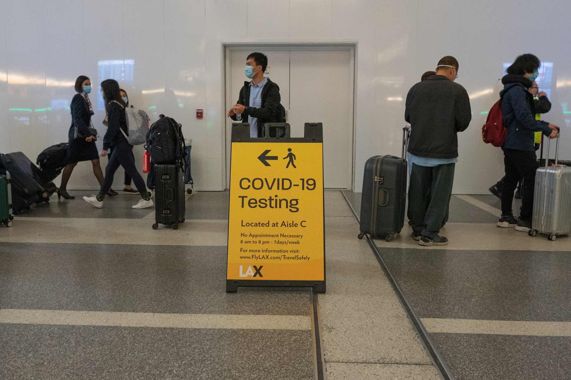 A sign for Covid-19 testing in Terminal B at Los Angeles International Airport.