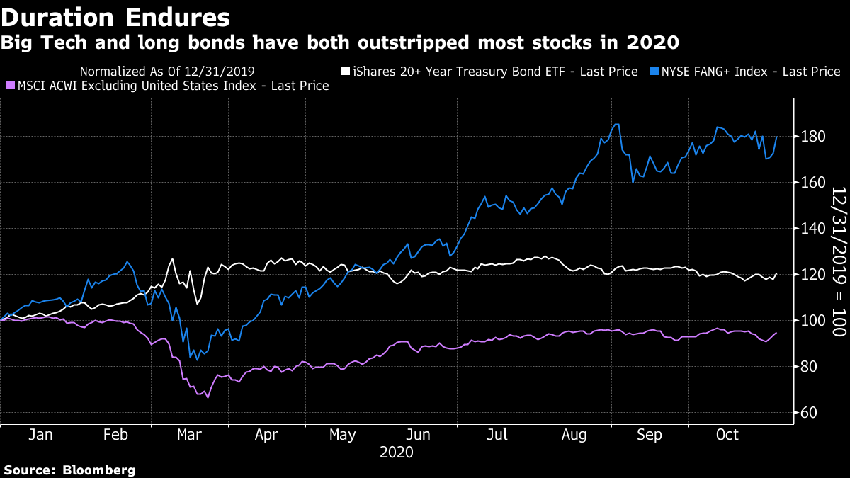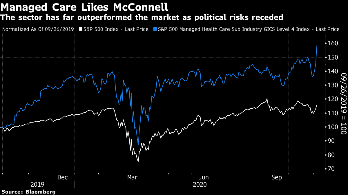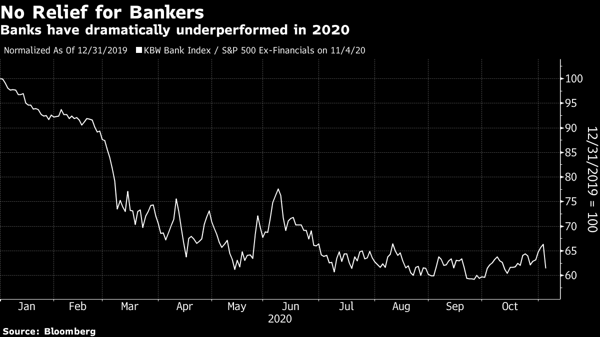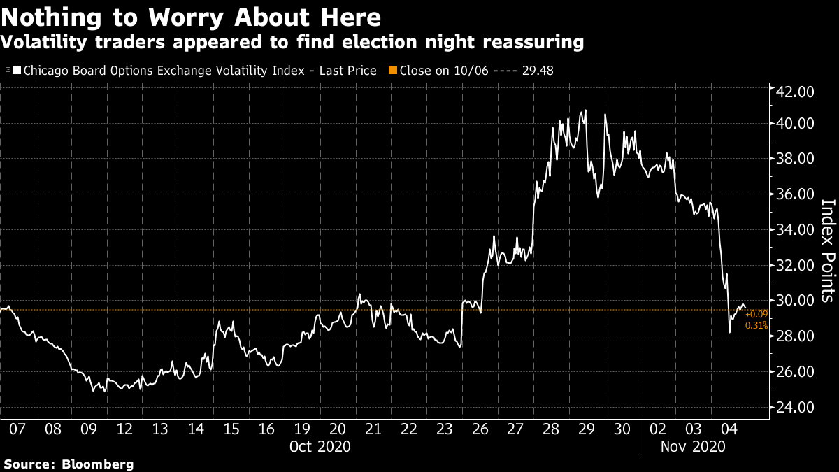 This isn't what was expected Monday evening, although markets apportioned a significant possibility to all these outcomes. Hence the day after the night before has seen much activity, but not a major dislocation or crisis. You can read elsewhere about the facts behind all these assumptions. The Democrats failed to win Maine in the Senate, a devastating blow given the antipathy many liberal activists have to the state's Republican senator Susan Collins, and at present appear to have a net pickup of only one seat. There are one and perhaps two run-offs to come in Georgia, and votes still to be counted in some states, but the odds that Republicans keep at least 51 seats are above 90%. For the presidency, Biden has his nose ahead in Arizona (which is tightening as more votes are counted) and Nevada at the time of writing. If he wins these states he wins the electoral college. Period. Pennsylvania is still opaque but it's quite likely he will win there as well. He might even, it now appears, win Georgia. Overall, betting and prediction markets at the time of writing put his chances of taking the presidency at 85%, and that's about right — it's possible that Biden has lost, but much more likely that he has won. The third assumption, that Trump fails to get traction in a dispute of the votes, is by far the most tenuous. If the eventual results are closer than they appear at present, and particularly if they are as close as they were in Florida 20 years ago, then there is the possibility of serious conflict. There is a concerted but rather desperate attempt afoot to cast doubt on the counting processes in the states where a winner hasn't yet been declared, and this risks triggering civil disorder. At the time of writing, this hasn't happened. Meanwhile, the president's chances of persuading the Supreme Court to help him look slim, as my colleague Noah Feldman explains. So, that's my story, and I'm sticking to it until events intervene to change it. Now for the markets' story: Changing the NarrativeMarkets run on narratives. So do human minds; it's easiest to think in terms of stories. What makes markets in general, and stock markets in particular, so special is (first) their ability to shift from one narrative to another in a nanosecond and (second) the ability to make sure that any prevailing narrative is good news for stocks. Four years ago, markets suddenly decided that President Trump would be good news; and although stocks have prospered under him, this piece I wrote in the aftermath of that shock shows most of the narrative was incorrect. The Blue Wave emerged as a narrative when Democratic senatorial candidates began to take the lead in a number of normally Republican states in the early fall. A decisive shift from monetary dominance to fiscal policy was seen as just the right thing to jolt the U.S. out of its increasingly Japanified low-rates state. Infrastructure spending was great. Higher taxes to pay for it would come later and could be dealt with in due course. (Incidentally, exactly the same arguments were made for Trump four years ago.) We now know that there will be no Blue Wave, and so there is a new narrative, that markets love gridlock (which has been a Wall Street staple for generations), and that the risk of higher taxes and more onerous regulations under a Biden administration has been averted. With Mitch McConnell's Republicans in the Senate acting as a check on profligacy, markets don't have to worry about higher taxes (they weren't), or deeper deficits (which they were actively hoping for a week ago). With cabinet secretaries facing confirmation by a Republican Senate, the Treasury secretary will be Lael Brainard of the Federal Reserve, and not Senator Elizabeth Warren. (It was always extremely unlikely that Biden would have given her the job, but again it's a reason to buy stocks.) Also, whispered rather more quietly, the new arrangement will be good because there will no longer be a need to worry about the capricious and unpredictable Trump. His bizarre interventions into negotiations over an extension of the CARES Act was just one example of the kind of behavior investors won't miss. Biden will also turn down the heat with China, which is fine by Wall Street. How well does the new narrative work? History suggests that stock markets actually prefer periods of harmony, when the White House and Congress are controlled by the same party. That is when things get done. It is only bond markets that like gridlock, because there is far less risk of excessive spending — and it is a while since excessive deficits deterred anyone from buying bonds. The Story So FarThis new narrative shouldn't, therefore, have been such great news for stocks. And of course, there was a lashing of uncertainty thrown in. So, of course, the S&P 500 had its best post-election Wednesday performance in history, with a gain of 2.2%. (My Bloomberg News colleague Ye Xie also reveals that the worst-received president in history was FDR in 1932, with a 4.4% fall in the S&P; William McKinley still holds the record for the most positive reception, with an increase in the Dow of 4.6%). Meanwhile, despite the very real continued risk of a contested election, volatility has shot down. This is what has happened to the VIX index — it rose as the risk of contested election appeared to grow, and then fell all the way back when election night left that scenario looking very possible:  This seems premature, but it is also fair to point out that the VIX had only once before been anything like as high entering election day — and that was in 2008, in the midst of the Global Financial Crisis. This chart is from SunTrust:  Meanwhile, bonds responded exactly as might be expected if gridlock is truly good for them. Yields dropped sharply, while the curve flattened. But this was less about relief from bond vigilantes worried about default risk, and more about a bet that the Fed will continue to be the only game in town.