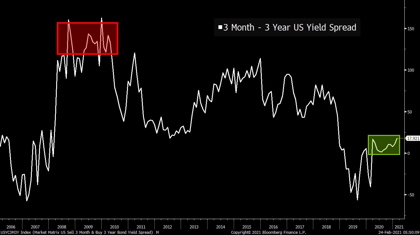| Powell's second day, the Wood effect, and predictions of $100 oil. House call The volatility in global bond and equity markets is easing today after Fed Chair Jerome Powell's reassuring comments to the Senate Banking Committee yesterday. He signaled that the central bank is nowhere near pulling back its economic support measures, saying there was still a long way to go to reach their inflation and employment goals. Powell will give testimony to the House Financial Services Panel today. Wood effectArk Investment Management's Cathie Wood snapped up shares in Tesla Inc. as the continuing selloff wiped out the company's share gains for the year. Tesla pared losses to end the session 2.4% lower and is more than 4% higher in premarket trading this morning. The Wood effect was also seen in Bitcoin, which is firmly back over $50,000 for much of the Asian session after she commented positively on the token in a Bloomberg interview. This doesn't mean her flagship funds have escaped the plunge in tech, with ARK Innovation ETF seeing its biggest outflow on record. $100 oil?Continued fiscal and monetary support, coupled with the rapid rollout of vaccines, mean investors are increasingly confident in a strong economic recovery over the horizon. For the oil market this means forecasts of $100 a barrel crude are emerging, less than a year after the commodity traded in negative territory. Goldman Sachs Group Inc. strategists said that the recovery in demand will outpace supply when they increased their third-quarter forecast for the commodity to $75 a barrel. In the market this morning West Texas Intermediate was trading at $62. Markets quietGlobal equites were showing few signs of the recent volatility this morning, with the exception of shares in Hong Kong where a trading tax hike saw shares drop. The MSCI Asia Pacific Index was down 1.8% while Japan's Topix index closed 1.8% lower. In Europe, the Stoxx 600 Index had gained 0.3% by 5:50 a.m. Eastern Time. S&P 500 futures pointed to a small gain at the open, the 10-year Treasury yield was at 1.367% and gold was slightly higher. Coming up... MBA mortgage applications data is at 7:00 a.m., with January new home sales numbers at 10:00 a.m. U.S. crude inventories data are at 10:30 a.m. as well as Powell, we also hear from Fed Governor Lael Brainard and Fed Vice Chair Richard Clarida later. International Petroleum Week continues. Nvidia Corp., Lowe's Cos Inc., ViacomCBS Inc. and TJX Cos Inc. are among the companies reporting results. What we've been readingThis is what's caught our eye over the last 24 hours. And finally, here's what Joe's interested in this morningRates on Treasuries have been rising lately, and with Jerome Powell up on the Hill, there's growing chatter on whether there's some problem emerging. Is the Fed losing control of the curve in some way? Is the market testing the Fed's credibility in its fight for higher inflation and maximum employment? There are lot of takes out there, so be careful. In the meantime, here's one chart that shows how the Fed's strategy is largely working, and that it's easily maintaining the credibility of the market. It also shows how radically different this Fed is than the Bernanke Fed in the wake of the Great Financial Crisis. The three month-three year U.S. yield spread is basically a measure of how fast the market expects the Fed to raise rates over the next three years. When the number is high, the market is pricing in several hikes. When the number is low, the opposite. In the wake of the Great Financial Crisis (the red shaded area in this chart), the spread got as high as around 150 basis points.  Think about what this means. In the midst of a historic collapse, the market was pricing in numerous hikes between 2009 and 2012. Now we know, in retrospect, that the Fed didn't start hiking post-GFC until the end of 2015. So there was just an incredible mismatch between expectations for what the Fed would do post-Lehman and what it actually did in practice. Now, fast forward to today, and the spread is less than 20 basis points. Which means there's not even a full quarter-percent hike expected. Maaaayyyybe we'll get one hike over the next three years according to the market. Maybe. But also again, consider that we're expected to have blazing fast growth this year and next. Goldman has us growing at around 7%, which would be the fastest pace in years.