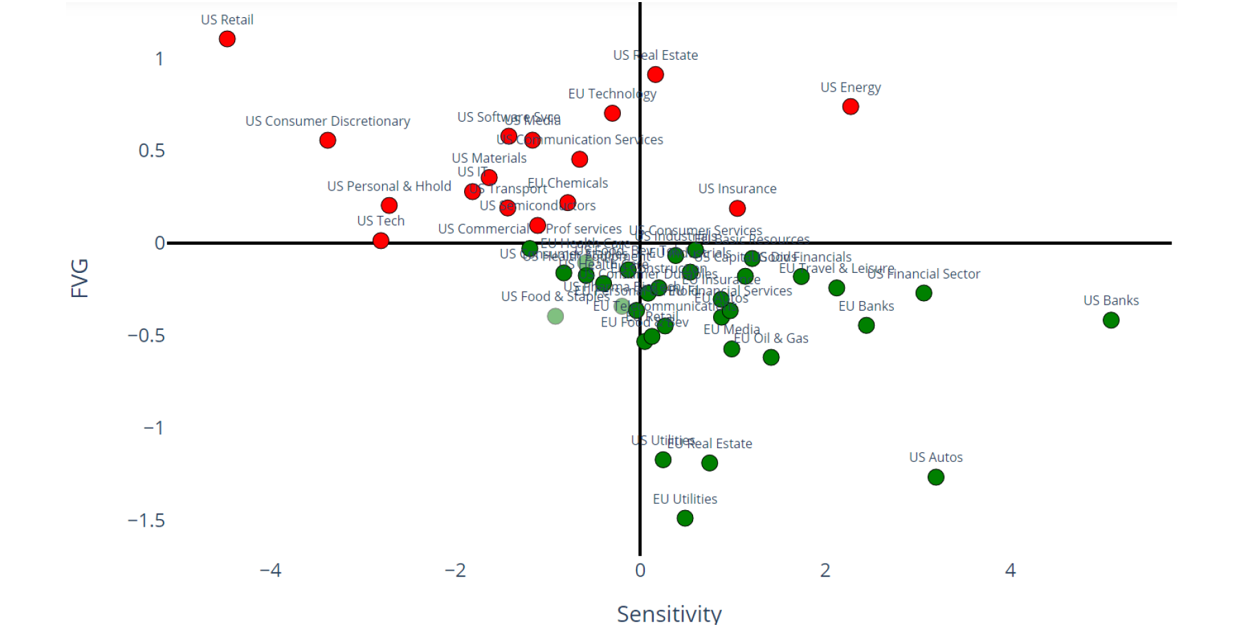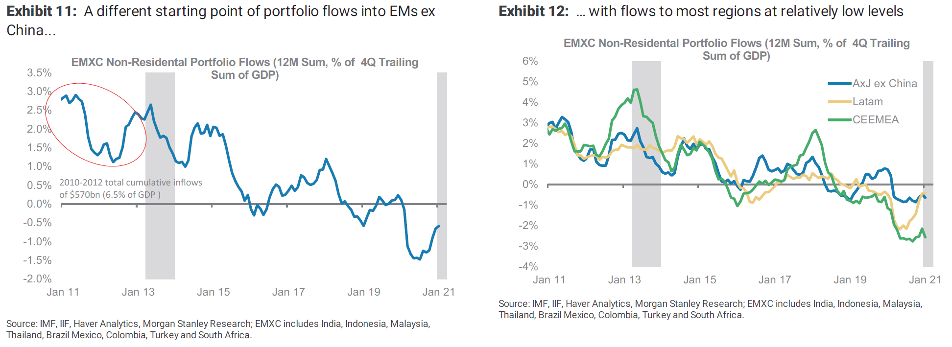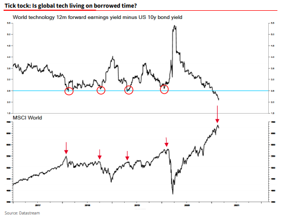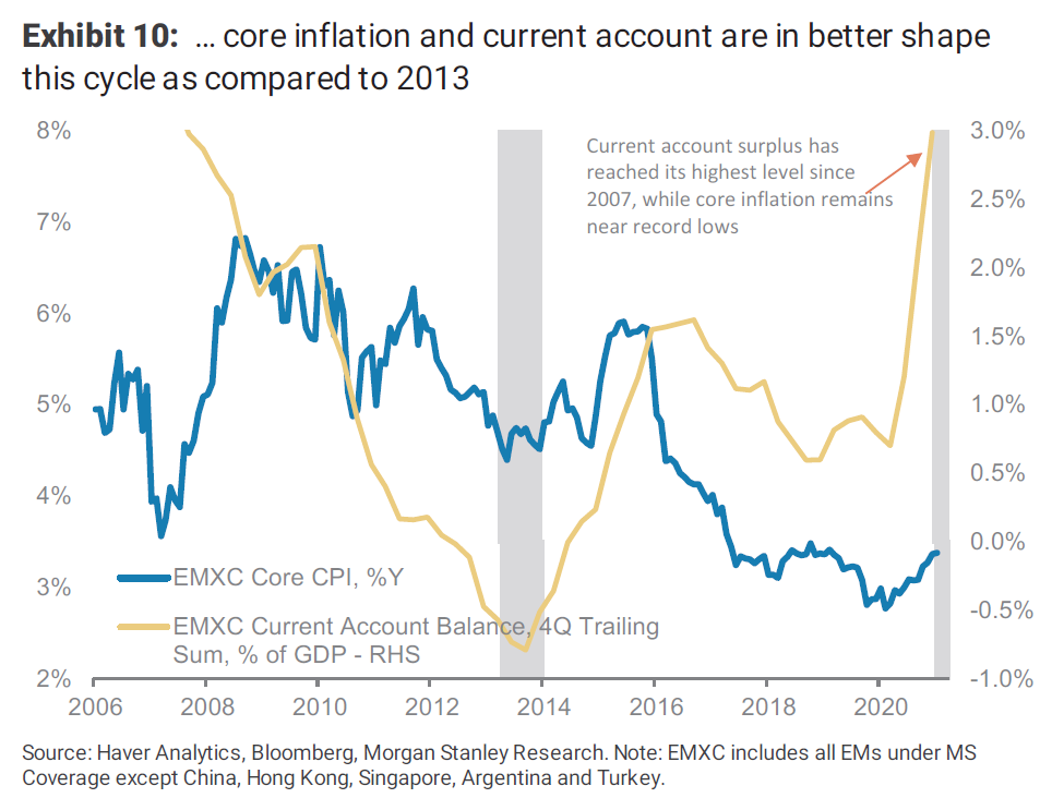 To illustrate Saravelos's prediction about Australia's central bank, which has already come true, the RBA announced that it would buy A$3 billion ($2.35 billion) of bonds to keep the three-year security to its targeted yield. This is what has happened to that yield, with an initial sharp reaction followed by a rebound. The test is ongoing, but central banks can win it if they really want to:  Emerging MarketsThe 2013 taper tantrum had a minimal impact on developed market stocks. It had a briefly cataclysmic effect on emerging market currencies, particularly those of the five large countries with big deficits that went by the now long-forgotten acronym of the BIITS — Brazil, India, Indonesia, Turkey and South Africa. This chart shows why the impression has taken hold that emerging markets need very low Treasury yields to prosper, comparing real 10-year yields to the relative performance of MSCI's emerging and developed market stock gauges:  Could this happen again? Thankfully for emerging markets, there is evidence that it won't, or at least not with full force. The following chart from Morgan Stanley shows core inflation and current account deficits for the emerging markets excluding China since 2006. The tantrum came just as they looked vulnerable; on both measures they look far more resilient now:  Another critical point is that the 2013 tantrum came shortly after the peak of a historic bull market for emerging markets that brought capital flowing in. There was plenty of foreign money ready to exit, and it did. This time the opposite is true:  The sell-off in emerging markets foreign exchange on Thursday shows that EM investors are on the alert for another tantrum. This isn't good news for emerging markets. But the stakes are nowhere near as high as they were eight years ago. Developed Stocks For developed stock markets, the question is whether a spike in bond yields can upset valuations. Tech, which has benefited tremendously from the conditions of the last year, is obviously the source of greatest concern (although to be fair, investors are sitting on fat profits in the sector). SocGen's Edwards, a well-known bearish commentator, offers this chart, which is an update of research by Dhaval Joshi of BCA Research. Over the last five years, the MSCI World as a whole has shown a tendency to hit a plateau and decline when tech earnings yields drop too far compared to 10-year Treasury yields. That choke point was passed a week ago, and has been followed with this week's exciting events:  This is decent evidence that bond yields have reached a high enough level to thwart further advances in the stock market. It isn't yet clear that they would on their own drive a major fall. Which sectors are most sensitive? The following work by Quant Insight sheds some interesting light. The vertical axis shows their measure of whether a sector is over-or under-valued compared to current macroeconomic conditions. The lower on the chart, the cheaper. The horizontal axis shows sensitivity to higher yields; the further to the right, the better news high rates will be. You want to avoid anything in the top left quadrant, which is expensive and due to be harmed by higher bond yields.  On this basis, investors might want to fill up on U.S. banks, U.S. automakers, and European utilities. Banks in particular are already doing well. U.S. retail is, by a country mile, the sector you most want to avoid. This chart was produced before Thursday's excitement but investors seem to be acting in line with its suggestions so far. Those, I think, are the best guidelines for now. In the longer term, the questions over whether bets on reflation are justified will rest on fascinating and profound issues of macroeconomics (and epidemiology). A true bond tantrum could yet turn into the fixed-income bear market that many of us have been bracing for. For now, this is a big market test of the central banks. It's their move next. Survival TipsI never even had the chance to mention that GameStop Corp. rallied again on Thursday. Plenty of you had suggestions for songs for Redditors who are long GameStop. Try Don't Let the Sun Catch You Crying by Gerry and the Pacemakers, We are the Champions by Queen (because there's "no time for losers"), Eve of Destruction by Barry McGuire, Crash by the Primitives (one of my favorites), and Stop in the Name of Love by the Supremes. Then there's Debaser by the Pixies, and Working for the Clampdown, Revolution Rock and Should I Stay Or Should I Go by the Clash. There was also a vote for Life on Mars by David Bowie. I think we can infer from that playlist that Points of Return readers are skeptical about the continued buying interest in GameStop. I would also add as a useful warning It's No Game, also by Bowie. I hope you survive your Friday, which could be a very interesting one, and have a good weekend. Like Bloomberg's Points of Return? Subscribe for unlimited access to trusted, data-based journalism in 120 countries around the world and gain expert analysis from exclusive daily newsletters, The Bloomberg Open and The Bloomberg Close. |