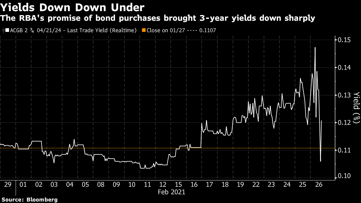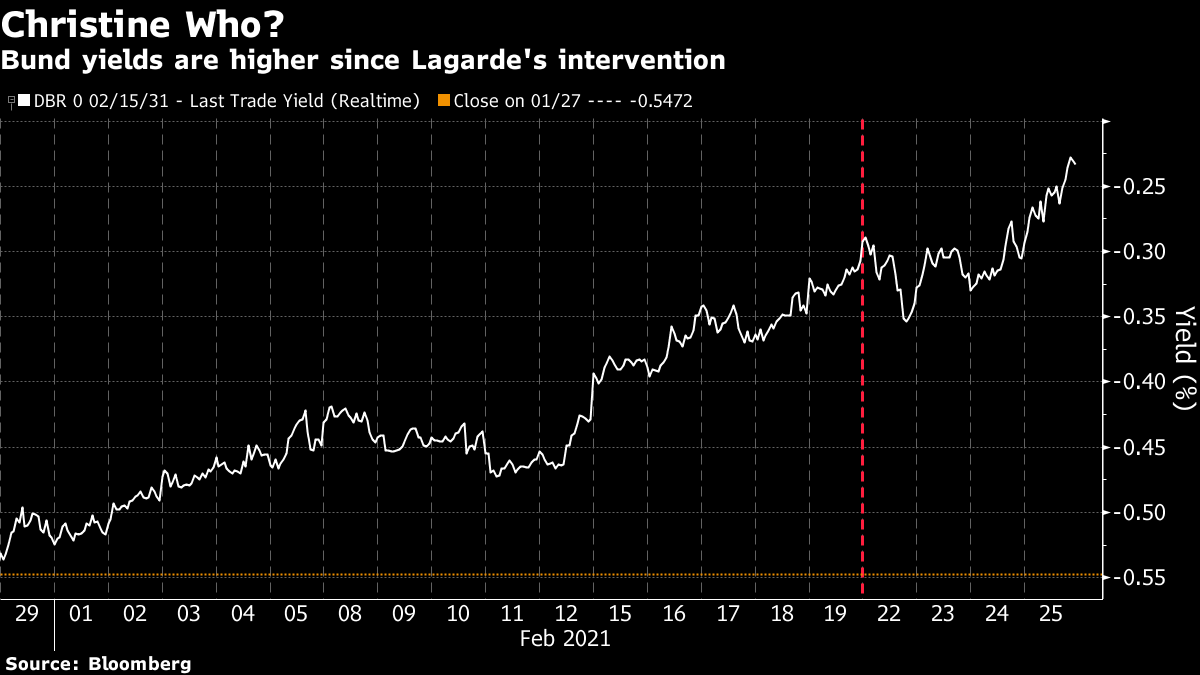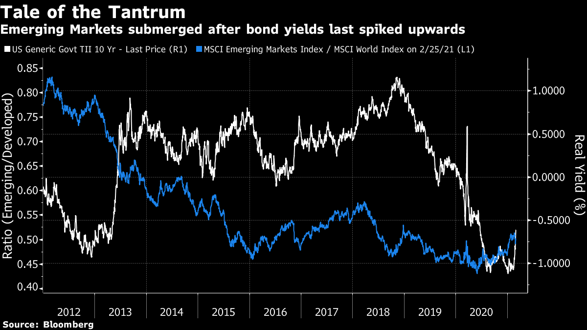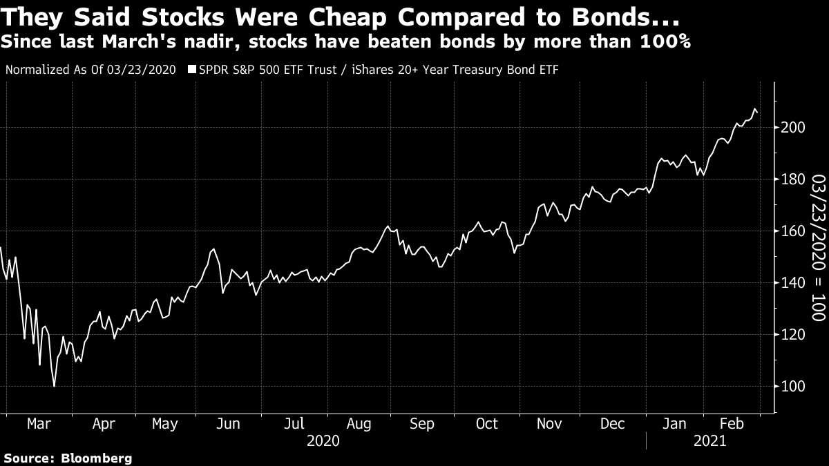 The critical question at what point bond yields become too high for stocks to bear, and cause them to fall. The mantra for the last year, as equities have enjoyed their remarkable post-Covid rally, is that stocks remain cheap compared to bonds. This is true, but the people excitedly buying stocks on this basis might be forgetting that the situation can also be corrected by a fall for bonds, and not just by a rise for equities. The rally in stocks has run out of steam for now, but compared to long bonds (proxied by the relative performance of the popular SPY and TLT exchange-traded funds) their outperformance has now exceeded 100% since last March's nadir.  Betting on stocks to beat bonds has been a good and well-supported bet. It doesn't mean we can be guaranteed a stonking equity bull market into the middle distance. It might instead mean watching stocks follow bonds into a vicious bear market. That is the risk of over-reliance on equities' cheapness compared to bonds when choosing to buy them despite their extreme high valuations compared to their own fundamentals. Just saying. That risk, to be clear, hasn't transpired as yet. It might never. Which brings us to the need to explain why all of this is happening. Tantrums in StoreThe great concern is the impact that further rises in bond yields could have on other asset classes, especially U.S. equities and emerging markets. There is one great prior example of a bond market "tantrum," which followed comments by then Fed Chairman Ben Bernanke about "tapering" bond purchases in May 2013. The effect on real yields, unprecedentedly negative at the time, was immediate. The following graph compares 10-year real yields in that incident with 10-year real yields over the last six months:  The pattern is obviously very similar to the pattern in May 2013 — but we have far further to go to match the tantrum of eight years ago. What would cause this tantrum to go further? Plainly, the market is discounting a lot of reflation ahead, given the strength of the economic recovery that has already been priced in by stocks. All else equal, we would expect bond yields to go up and bond prices to fall, as the expansion to back up these high equity valuations comes to pass. The reason yields aren't much higher already is that markets assume central banks will act to keep them under control. Lagarde, Jerome Powell and a battalion of other central bank governors have all made that clear over the last week. For the remainder of this year, and with the market left to its own devices, the trajectory of bond yields depends above all on the course of the pandemic and the vaccination program to combat it. But for now, the issue to the exclusion of all else is to find out what central banks will do to back up their words on keeping yields low. The following comments from a note by Deutsche Bank AG's currency strategist George Saravelos put it well: central banks are not impotent. This is not an attack on a currency peg with a self-fulfilling depletion of foreign currency reserves. Central bank pockets are literally infinitely deep in their own currency. The most straightforward response to today's price action would be for the Reserve Bank of Australia to come in even more aggressively overnight to defend its 3-year yield target. [Which is exactly what has happened.] Similarly, for the ECB, where we have already seen the three most influential executive board members expressing concern. Even for the Fed, it is worth remembering that guidance is couched in terms of current QE of at least $120bn per month, providing in-built flexibility for an increase. The current volatility - unaccompanied by improving inflation expectations and directly challenging central bank reaction functions - resembles a VaR shock for the market and risks leading to a broader tightening of financial conditions. How much it runs will ultimately be determined by how deep into their pockets central banks are willing to reach. We will find out over the next few days.