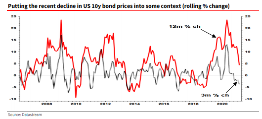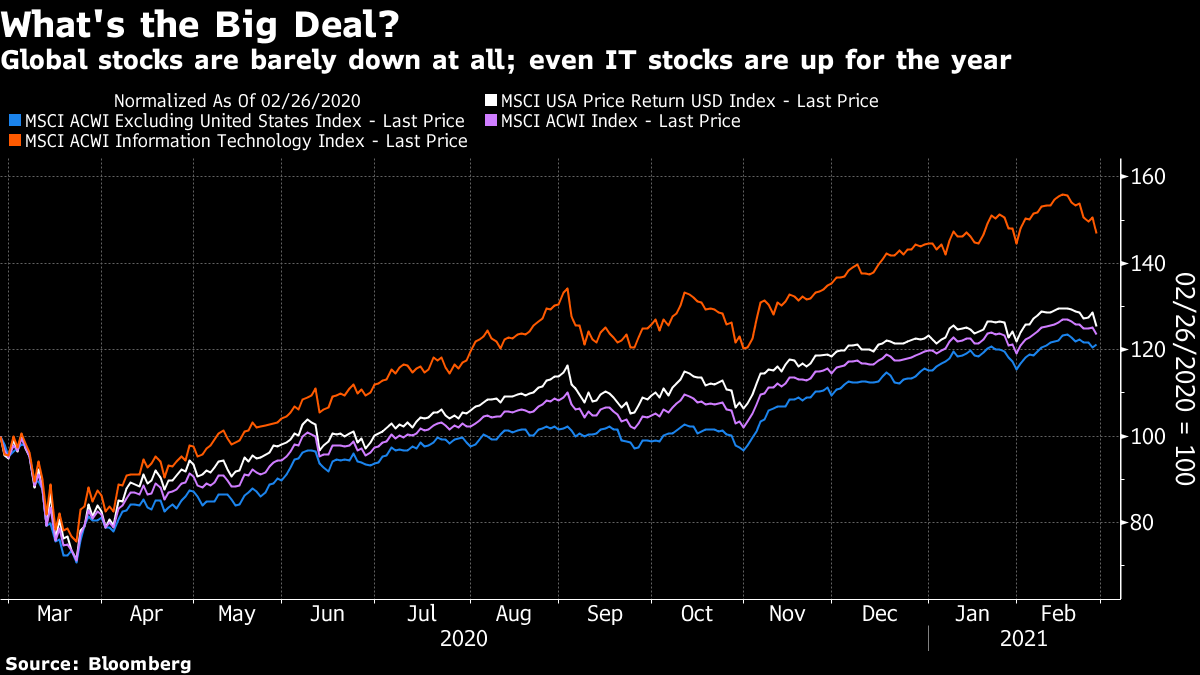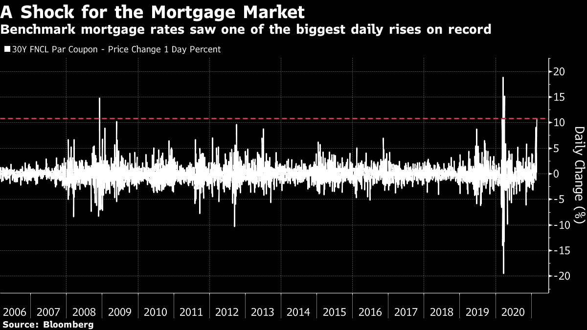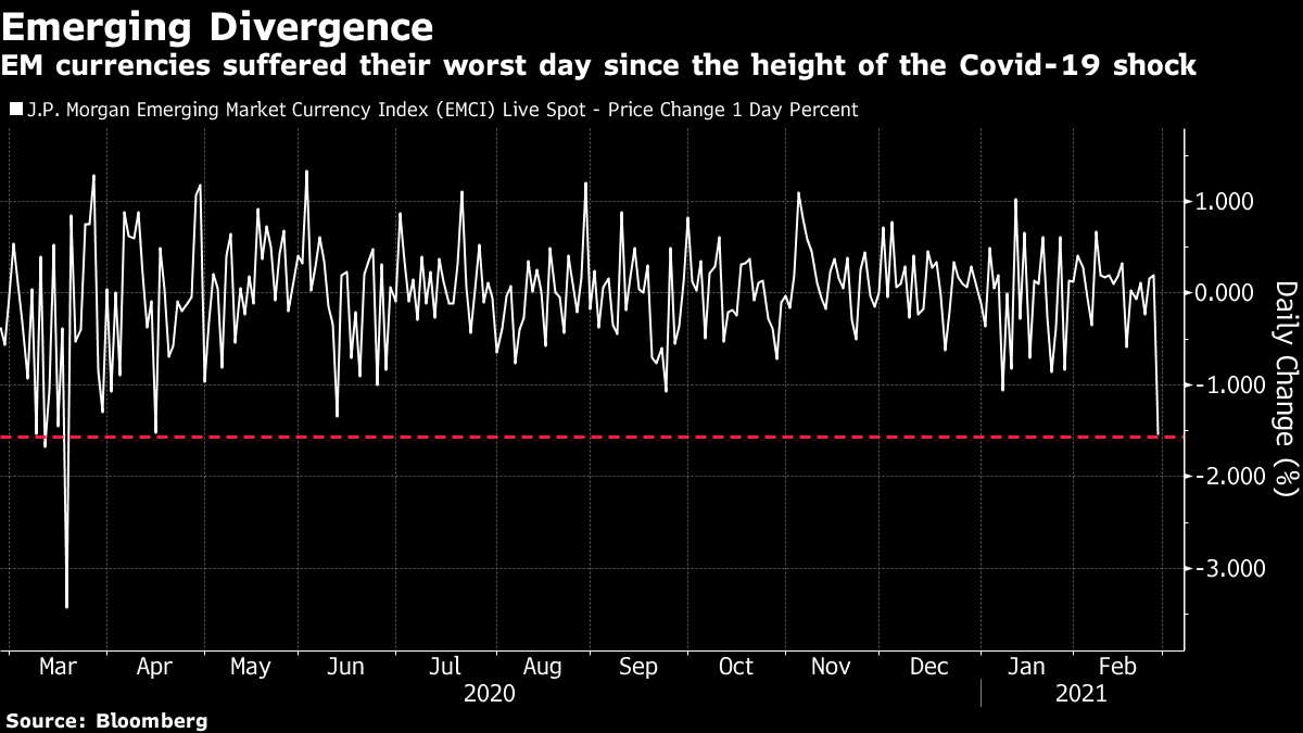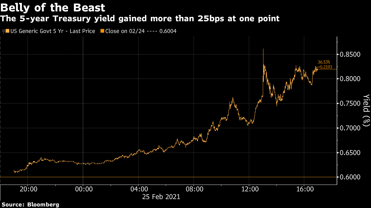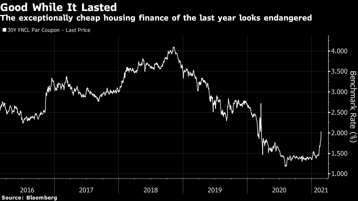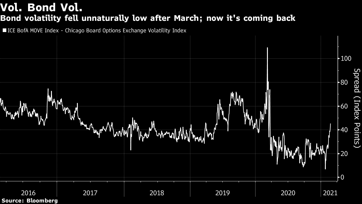 What Just Happened?Something big just happened in world markets. That I can prove. So I'll start with the easy part of going through the remarkable events of the week, culminating in Thursday's great drama, and showing that they're a big deal. Then will come the much harder questions of why they happened, what might happen next, and what we should all do about it. The bond market has been at the center of the drama. Yields are rising, especially in the often overlooked "belly" of the curve, between the closely observed two- and 10-year maturities. An unsuccessful auction of seven-year Treasuries certainly didn't help, but the trend through the day was inexorable. This is what happened to the five-year Treasury yield:  Beyond the belly, however, which saw most action on Thursday, there has been a move away from duration, the technical term for bonds whose returns are most sensitive to changes in interest rates. Austria's "century bond" issued in 2017 and not repaying its principal until 2117 is widely taken as the ultimate benchmark for duration; this is what has happened to its price:  While Treasuries, the world's biggest bond market, understandably command the most attention, this isn't just an American event. Before the market opened on Monday, Christine Lagarde of the European Central Bank stated that the bank was monitoring longer bond yields, causing them to fall sharply. That reversal didn't last long. German bund yields are now higher than they were before she intervened (although as they remain negative it's still a little hard to see why a central banker would feel they were too high):  Serious moves are afoot, then. But it's worth pointing out that there have been big falls in bond prices before during the post-crisis era. The following chart comes from Albert Edwards of Societe Generale SA:  This is a significant move for the bond market. It needn't in its own right be anything unprecedented or game-changing. Volatility Bond volatility is also back. Following the brief but terrifying financial crisis that accompanied the onset of the pandemic in March last year, central banks succeeded in effectively anaesthetizing the bond market while measures of stock market volatility remained elevated. This shows up clearly in the spread of the CBOE VIX index of stock volatility over the MOVE index of bond volatility:  It isn't evident that central banks need be too uncomfortable with yields at current levels, which remain low. But their success in quashing seemingly all activity in the bond market seems to be over. Mortgages Why does this matter? There are a number of reasons. First, the bond market is central to setting interest rates for Americans' mortgages. In proportionate terms, the shock to the Fannie Mae 30-year mortgage generally used as a benchmark for U.S. home loans was truly historic. Outside of one day during the worst of the 2008 crisis, and two days during the Covid shock last spring, it was the biggest percentage rise in mortgage rates on record:  To be clear, the sharp proportionate increase is enabled by the current low rates, although these have been the norm for a while. The rise could still endanger the U.S. housing recovery, a critical reason for optimism about the economy, if it continues:  Currencies Higher U.S. rates are generally held to be bad news for emerging markets, as they attract flows away from the sector, and also tend to strengthen the dollar. That in turn can weaken emerging markets that are particularly reliant on dollar-denominated debt. Emerging market currencies had been enjoying a resurgence of late — until Thursday, when rising yields in the U.S. triggered their worst fall since March last year, according to JPMorgan Chase & Co.'s widely used benchmark:  Stocks Last, and deliberately so, we come to stocks. As a whole, taking in all global stock markets, this isn't yet much of a deal. MSCI's index of global stocks excluding the U.S. actually rose slightly on Thursday. Even tech stocks, which are under undoubted pressure, are still up for 2021 so far after a great 2020:  Of all the main asset classes, stocks are the least scathed thus far. They've still commanded plenty of attention. That is because they matter most to politicians, and the Fed is (in perception at least) ultimately dedicated to making sure they don't suffer a big fall. This was put beautifully by my late colleague Richard Breslow in the last column he wrote for Bloomberg in October last year: As far as equities are concerned, they are the golden child. It's really the only market the authorities care about. It pains me to admit, but they must be your first priority. Ugh.
