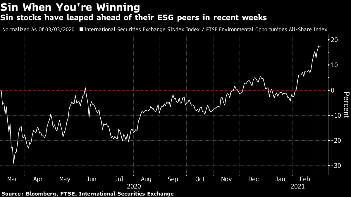 | Traders brace for a stock selloff. Asia's richest are jumping on the SPAC bandwagon. Everything you need to know about China's biggest meeting of the year. Here's what people in markets are talking about today. Asia traders brace for a renewed bout of stock and bond volatility after a surge in Treasury yields once more dragged down U.S. shares. The dollar strengthened. Futures in Japan, Hong Kong and Australia pointed lower after the Nasdaq 100 slumped to a two-month low and the S&P 500 extended its slide into a second day. A selloff in high-flying giants such as Apple and Amazon outweighed gains in banks and energy producers. Australian bonds slumped after benchmark Treasury yields approached 1.5%, and a market gauge of inflation expectations over the next five years hit its highest level since 2008. Oil surged. Asia's richest are jumping on the SPAC bandwagon, investing in the blank-check companies that have made a name for themselves across global markets. Family offices are piling into special purpose acquisition companies to generate better returns as near-zero interest rates prompt them to seek alternative channels of investment. SPAC bosses, from Softbank's Masayoshi Son to Silicon Valley investor Vinod Khosla, are pushing for tougher deal terms as the craze takes off. SPACs raise money from investors and then look to acquire another business, usually a private one, within two years. If they fail to find a target, investors may choose to get their stake back at the IPO price by exercising their redemption right. Here's why they're one of Wall Street's hottest products right now. China kicks off its biggest political meeting of the year Friday, laying out plans that could propel the economy to become the world's biggest this decade. After powering its way out of the pandemic last year, policy makers must engineer an exit from the monetary and fiscal stimulus that fueled that recovery, without destabilizing growth and spooking investors already wary of corporate defaults. It's growth target, focus on tech and overhaul of Hong Kong's election rules are just three things under the microscope. Here's what to watch for in the week-long meeting. And here's more on China's move toward global economic dominance. Outbreaks of African Swine Fever in China's pig herds have fueled a surge in U.S. hog prices, amid fears China will encounter meat-supply problems. China's hog herd, the biggest globally, has been struggling to eradicate the disease since the 2018 outbreak. The country claimed herd numbers would be fully restored by mid 2021, but this now looks unlikely, amid fears the disease may continue to spread. Scientists have found new strains of the virus that are further threatening China's target. Users of unlicensed streaming websites or viewers who download their shows and movies from illegal file-sharing apps are proving to be a very expensive headache for Netflix, Disney+, and Chinese streaming giants Tencent and IQiyi, which are waging an intense contest for subscribers in Southeast Asia. Thousands of illegal websites cribbing content from legitimate services cater to viewers from Vietnam to the Philippines, while other operators sell cheap hardware that allows access to pirated content. Piracy will cost TV and movie providers almost $52 billion in revenue worldwide in 2022, but it's the rising demand in Southeast Asia, home to more than twice the population of the U.S., that's raising warning flags. What We've Been ReadingThis is what's caught our eye over the past 24 hours: And finally, here's what Cormac's interested in todayDon't tell the vicar, but betting on bad is proving a much better investment strategy than voting with your conscience so far this year. A strong performance in February has catapulted a gauge of "vice" shares including casinos, distillers and cigarette makers into a commanding lead over a worldwide index of environmental-related stocks. The ISE SINdex Index is now up 17% year-to-date, compared to just a 1% rise in the FTSE Environmental Opportunities All-Share Index which itself is lagging the global stocks benchmark by over 2 percentage points. As my colleague Moxy Ying points out, fears of higher interest rates have turned environmental shares from investor darlings into has-beens in recent weeks. Their outperformance last year and nosebleed valuations for many prominent ESG shares has left them vulnerable to the period of underperformance in growth shares that many strategists are calling for.  Conversely, the alcohol, tobacco, and gaming brigade are getting a boost from reopening economies and the ongoing vaccine rollout. The sin stocks underperformed their environmental peers for much of last year, and socially-conscious investors will hope that trend can soon reassert itself. But while key sections of the ESG universe are primed to benefit from the stimulus-driven boost to green technologies, for the time being at least, the most successful investors are breaking bad. Cormac Mullen is a Cross-Asset reporter and editor for Bloomberg News in Tokyo. |