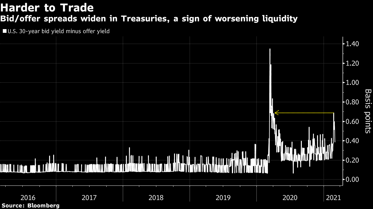 | Dovish Powell disappoints the bond market. China moves to limit Hong Kong opposition's ability to win public office. Bitcoin could reach $1 million, crypto exchange CEO says. Here's what people in markets are talking about today. Federal Reserve Chair Jerome Powell sounded a gentle word of caution to the bond market on Thursday that he's watching the jump higher in long-term interest rates, but stopped well short of trying to rein them in. Ten-year Treasuries extended losses and U.S. stocks sold off after he spoke, and futures in Asia were in the red. Bond yields have climbed in recent weeks; trading has been turbulent at times and higher yields have also unsettled the stock market. Powell reassured markets that the Fed was nowhere close to pulling back on its massive support for the economy. "We will be patient," he said. "We're still a long way from our goals." As the leader of crypto exchange Kraken, Jesse Powell is bound to be bullish on Bitcoin. Even so, his vision is a disruptive one. Powell thinks Bitcoin could reach $1 million in the next decade, saying that "The true believers will tell you that it's going all the way to the moon, to Mars and eventually, will be the world's currency." In a a separate interview, long-time crypto proponent Mike Novogratz said digital coins have become "an institutional asset class" and banks are "frantically" trying to get in on the action. Still, Bitcoin slumped along with other risk assets in Thursday trading. China is pushing ahead with a controversial plan to limit the Hong Kong opposition's ability to win public office, according to the official Xinhua News Agency. A draft resolution on "improving Hong Kong's electoral system" will be reviewed as part of the biggest Chinese political meeting of the year, the National People's Congress, which kicks off in Beijing today. The action is the latest step by President Xi Jinping's government to curb dissent in the former British colony. Meanwhile, Americans continue to support a tough stance on China, but are doubtful Biden will be able to adopt a hardline approach to the world's second largest economy. Saudi Arabia and its OPEC+ allies shocked the oil market with a decision to keep supply in check, sending prices surging and adding inflationary pressure to the global economy as it emerges from the pandemic. One year on from the outbreak of a bitter price war that sent crude below zero, the kingdom showed that its priority is preserving the hard-won oil recovery rather than worrying about tightening the market too much. Meanwhile China's fuel demand is going from strength to strength, leaving the capital blanketed in smog despite concerns a virus resurgence prior to Lunar New Year would derail the robust rebound. Last year may have been the worst in history for the airline industry, but for Nicolas Maduro's ragtag Venezuelan airline, business boomed. Somehow, operations jumped 85% in 2020, making it one of few carriers to post any growth during the pandemic. Meanwhile, Boeing is seeking a new $4 billion safety net from a group of banks, as it prepares to ride out the possibly lengthy slowdown of global aircraft demand. If you're wondering what all this says about where the industry is headed, here's what two airline titans have to say about it. What We've Been ReadingThis is what's caught our eye over the past 24 hours: And finally, here's what Tracy's interested in todaySo Jerome Powell reaffirmed the Fed's commitment to easy money in an interview and markets ... sold off? One way to view the surprisingly negative market reaction to the Fed Chair's interview with the Wall Street Journal is through the prism of market structure. As I've written in this space before, the smooth functioning of the U.S. Treasury market has effectively become a policy consideration for the Fed in a way it's never been before. The market is growing ever larger as U.S. deficits balloon, while the clash between monetary policy and post-financial crisis regulation has created an environment where Treasury blow-ups happen a couple of times a year.  Obviously the Fed has always looked at the Treasury market insofar as it feeds into financial conditions and transmits monetary policy to the wider economy. Or as Powell put it in his interview: "As it relates to the bond market, I'd be concerned by disorderly conditions in markets or by a persistent tightening in financial conditions broadly that threatens the achievement of our goals." But the market now seems to be expecting something else: that the Fed not only maintain its pledge to keep benchmark rates low, but that it publicly and seriously commit to backstopping the smooth functioning of the $21 trillion market. You can follow Tracy Alloway on Twitter at @tracyalloway.. |