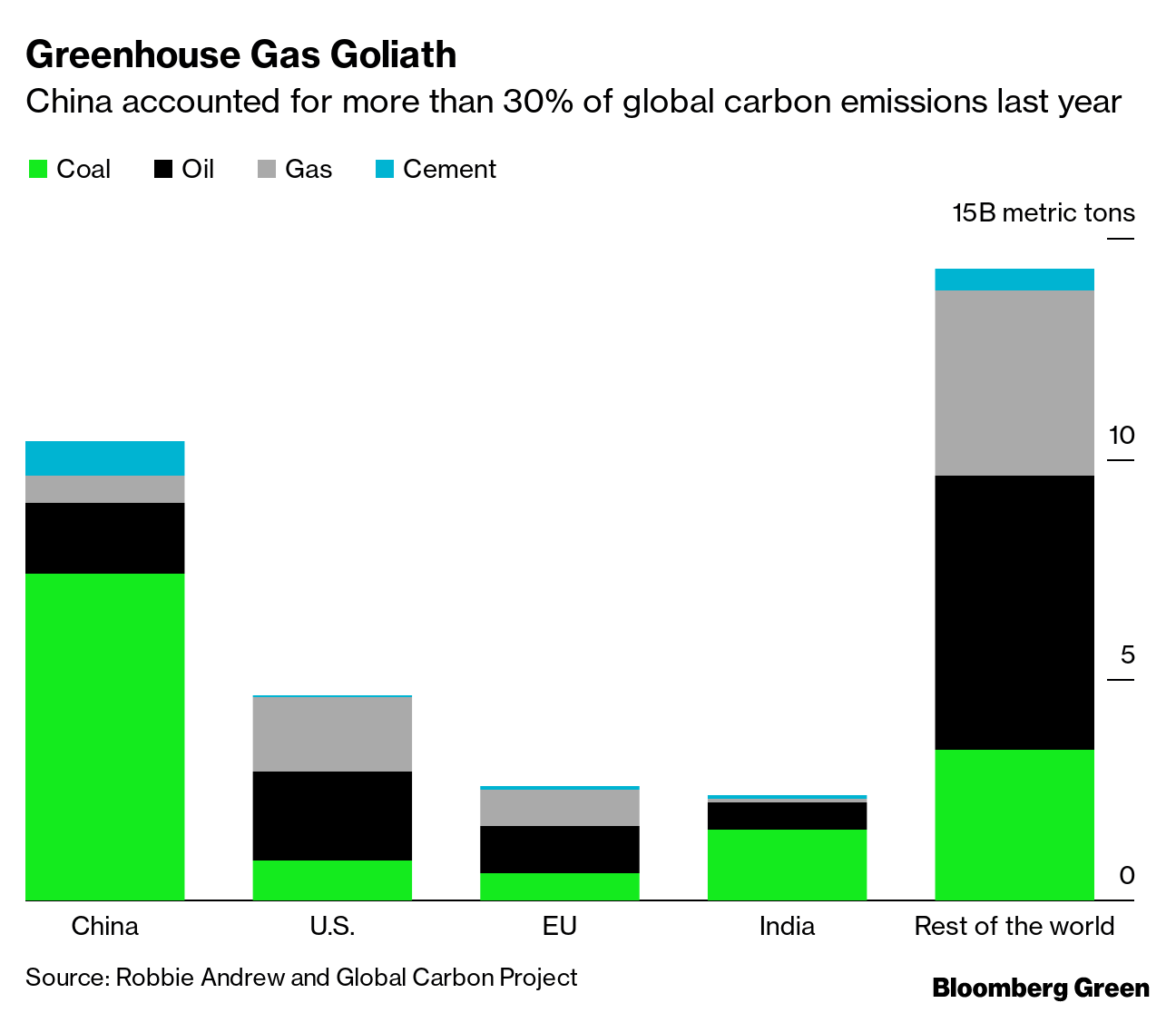 China has so far resisted setting an absolute limit on emissions, choosing instead to set targets as a share of growth. After all, it's still growing at multiple times the rate of developed countries such as the U.S., and emissions will probably continue to rise considerably. China was the only major economy to grow in 2020 after quickly containing the coronavirus outbreak, and accounts for about 30% of global emissions.