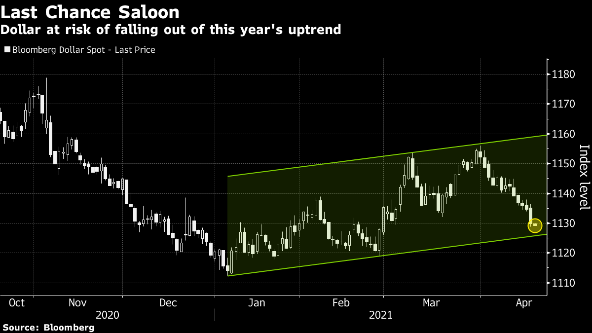 | Want the lowdown on what's moving European markets in your inbox every morning? Sign up here. Good morning. UEFA fights back, Laschet fights on and blood clot worries rise over J&J's vaccine. Here's what's moving markets. J&J Vaccine WorriesU.S. drug maker Emergent BioSolutions was told by regulators to stop producing Johnson & Johnson's vaccine at a plant where 15 million doses worth of a key ingredient had to be discarded, adding to roadblocks preventing wider use of the single-dose shot. Use of J&J's vaccine has been paused in the U.S. since last week as health officials probe a possible link to life-threatening blood clots. Greece has suspended its roll-out of the shot just as first doses are reaching Europe. Meanwhile, the EU exercised its option for a further 100 million doses of Pfizer and BioNTech's Covid vaccine, boosting its order from the companies to 600 million doses. UEFA's DefenseThe umbrella organization for European soccer won't let its Champions League tournament go down without a fight. UEFA is in talks with Centricus Asset Management over a 6 billion-euro financing package to overhaul its flagship soccer tournament and stop plans for a new breakaway Super League, according to people familiar with the matter. UEFA has branded the breakaway proposal a "spit in the face" for soccer supporters, vowing to take all measures necessary—from turning to the courts to banning teams and players from international soccer tournaments—to stop the move. Long GrindThe fight to succeed Angela Merkel as the German conservatives' candidate for chancellor is dragging on, after a vote among party leaders breathed fresh life into the campaign of Armin Laschet. The head of the CDU won the backing of 31 out of 46 members of his party's top committee, according to a person familiar with the outcome. His rival, Bavarian State Premier Markus Soeder, won just nine votes with six abstentions, a result that may give 60-year-old Laschet the edge in their contest. While Laschet has lost significant support since the committee gave him unanimous backing a week ago, Soeder said yesterday that he would accept a clear CDU vote in favor of Laschet. Tesla's TroublesJust as Tesla CEO Elon Musk defended his company after a deadly Texas crash where he said no autopilot was enabled, media reported that police will serve search warrants on Tesla to secure data on the incident. The knocks kept coming elsewhere, with the carmaker singled out in a piece from China's state-run Xinhua news agency that said the quality of its vehicles must meet market expectations in order to win consumers' trust, citing brake failure and fire risks. Yesterday, it had an embarrassing moment at the Shanghai Auto Show when an angry protester climbed on top of one of its display vehicles shouting that her car's brakes had lost control. Coming Up…European stocks were set to track Asian markets lower, after U.S. equities fell from their all-time peaks. The U.K. reports unemployment figures, and Associated British Foods is among firms reporting earnings. It's a tech-heavy day in the U.S. where Apple will unveil its first new products this year and Netflix reports earnings, with the streaming giant expected to struggle to top its record from a year ago. Also in the U.S., Abbott Laboratories, P&G, Philip Morris and Lockheed Martin are among the bluechips set to report, along with Johnson & Johnson whose Covid-19 vaccine is still being scrutinized by regulators. And today has been termed "Dogeday" by Dogecoin fans, with the meme-themed cryptocurrency continuing to gain throughout the day. What We've Been ReadingThis is what's caught our eye over the past 24 hours. And finally, here's what Cormac Mullen is interested in this morningCurrency contrarians are close to being on the receiving end of a massive "I told you so" from dollar bears. This year's rally in the U.S. currency -- in the face of a near-consensus call for dollar weakness -- is close to being snuffed out. The Bloomberg Dollar Spot Index has fallen over 2% from its late-March high and is at risk of falling out of the uptrend in place since early January. The contrarians are still in with a shot though. The recent dollar weakness has tracked the surprise retreat in U.S. yields, which as discussed previously looks more technical than fundamental. A rebound higher in Treasury yields and a re-ignition of the reflation trade would likely give the greenback a fresh boost too. The narrative that justified a dollar rebound -- at least a short-term one -- remains intact with U.S. economic data continuing to surprise on the upside and vaccinations continuing apace. And there are enough geopolitical concerns that could yet trigger a renewed interest in haven assets. The dollar rally isn't dead yet but it is on life support.  Cormac Mullen is a cross-asset reporter and editor for Bloomberg News in Tokyo. Like Bloomberg's Five Things? Subscribe for unlimited access to trusted, data-based journalism in 120 countries around the world and gain expert analysis from exclusive daily newsletters, The Bloomberg Open and The Bloomberg Close. |