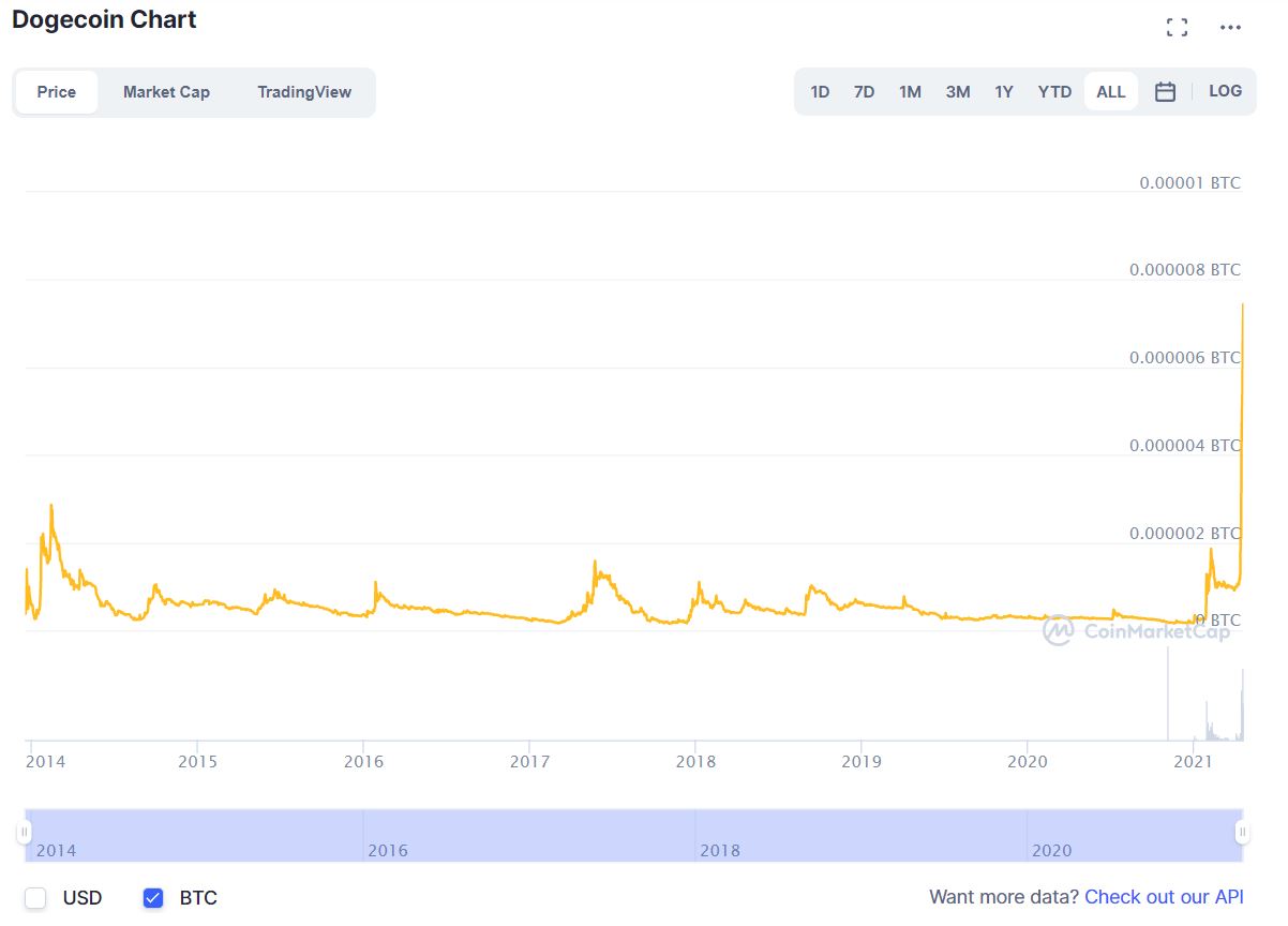 And to be crystal clear, Dogecoin has been a better investment than Bitcoin for its entire existence. Here's a chart, again from CoinMarketCap, of Dogecoin priced in Bitcoin. Doge/BTC is at all-time highs. What this means -- just so there's no ambiguity -- is that at every step of the way if you bought Bitcoin, you should have bought Dogecoin instead in retrospect. That's not cherry picking or a chart crime or anything. It's just a fact that at any time over the last seven years, buying Dogecoin was the better move than buying Bitcoin.  Joe Weisenthal is an editor at Bloomberg Like Bloomberg's Five Things? Subscribe for unlimited access to trusted, data-based journalism in 120 countries around the world and gain expert analysis from exclusive daily newsletters, The Bloomberg Open and The Bloomberg Close. |