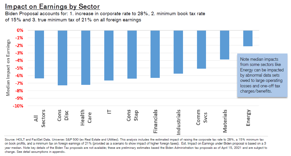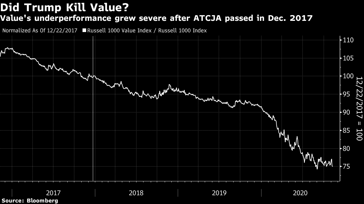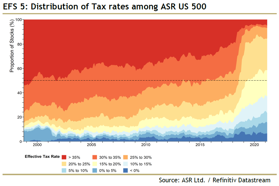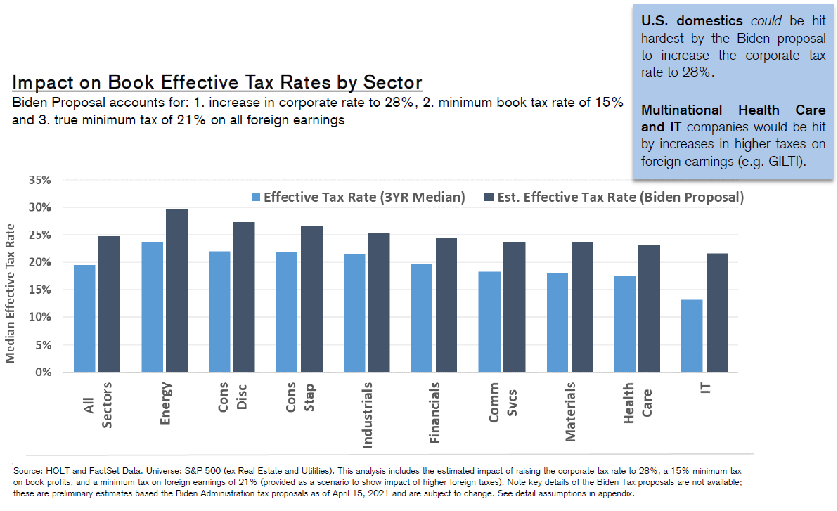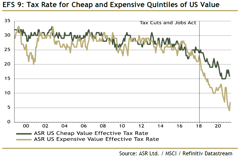 For more, read the administration's "opening bid" in The Made In America Tax Plan. There is more to the issue than a standard presidential negotiation with Congress, as the Biden team is hoping to deal with international taxation issues through a "Global Minimum Tax" deal with the Organization for Economic Cooperation and Development. Such an agreement would stop countries from undercutting others, but probably at the cost of raising less tax than the Biden team currently hopes. The parts of this plan that can pass muster with Senator Manchin (who has already made clear that he prefers 25% to 28%) will probably become law. For investors, there isn't much point combing through the proposals as they currently stand. That doesn't mean the issue can be ignored though. Is it priced in? The Trump tax cut, which in hindsight appeared inevitable, only really began to seem plausible in about September 2017, when other early priorities, such as repealing Obamacare, had fallen by the wayside. It didn't pass into law until the week before Christmas. At that point, as this chart from BCA Research showed, estimates for earnings per share for 2018 and 2019 suddenly increased; analysts waited for confirmation before making any changes:  Companies with the highest effective tax rates only began to outperform in a big way once the deal had been done. Logically, these companies stand to do worst from a reversal of the Trump tax cut, but so far, they are outperforming again under Biden:  Despite great interest and speculation, then, it is fair to say that so far any Biden tax changes haven't been priced in at all. As any tax rises would take effect before much of the money they raised could be spent, it is also fair to expect them to have a negative effect on the stock market (and a positive one, at the margin, on bonds). Is there a case for further reform? Years of congressional dealmaking have rendered a complicated tax code that treats companies very unequally. The gap between the effective corporate tax rate and the official statutory tax rate has narrowed, but it still exists. Companies pay less on average than the statutory rate, as illustrated here by Charles Cara of Absolute Strategy Research Ltd. of London:  The range also remains wide, although the number that pay the highest rates has reduced considerably since 2018. The changing patterns of tax rates, as shown in this heat map from Cara, show that any reform is going to have an effect on companies' relative performance:  Meanwhile, there are reasons why higher taxes could be good politics. Corporate tax as a proportion of GDP has fallen steadily, even as profits have increased:  Over a longer time scale, revenues from corporate taxation begin to look shockingly low. They have fallen to barely 1%, from more than 7% after the war. With populism in the air, it shouldn't be difficult to sell some kind of hike:  One further reason for reform is that the tax cut didn't have the hoped-for effect. There was no obvious boom in capital expenditures or research and development. What did happen was a startling rise in buybacks, almost entirely by companies with lowered tax rates.  Given all of these circumstances, it would be surprising if some meaningful tax hike could not be passed. What effect would a tax hike have on factors? It's just possible that President Trump destroyed the value factor, and a reversal of his corporate tax cut could aid a revival. The following chart from Cara of Absolute Strategy shows the effective tax rates paid by the cheapest and most expensive U.S. large-cap stocks. The cheapest saw a much smaller reduction than the most expensive. Over the preceding decade, cheap and expensive stocks paid tax at much the same rate. Judging by this chart, the Trump cut may have had much to do with the subsequent collapse of value stocks:  Correlation doesn't imply causation, but the way effective tax rates parted company just as value started to underperform is mightily suggestive:  A tax hike might just be the catalyst for a value revival. What effect will this have on sectors? More or less any reform that passes will have a bigger negative impact on information technology and healthcare than other sectors. That is because these companies have relatively large foreign profits, and a relatively low effective tax rate on them, as this chart from Credit Suisse Group AG shows:  Credit Suissse also crunched the numbers on the assumption of a hawkish tax hike, in which the rate rose to 28% with a minimum of 15%.Tech would still enjoy the lowest rates, but endure by far the sharpest increase:  Using the same assumptions, consumer discretionary, healthcare and tech companies would take the biggest hit to earnings, while materials and energy would be least affected:  This is ironic, because in the past when energy earnings have boomed, during the oil spikes of the late 1970s and again in 2008, politicians were keen to recommend imposing special taxes on their profits. Now Credit Suisse shows that tech profits look similarly distended, and therefore a similarly tempting political target:  There's no need to get out tax calculators yet, as it's months before any increase can become law. But some effects are already clear. As negotiations continue, expect the issue to gain in importance. Investors don't want to be late, like they were last time. More on InflationThe inflation debate rages on. This is your reminder that I will be discussing the issue with my Bloomberg Opinion colleague Mohamed El-Erian, who also these days runs Queens College, Cambridge, at 1:30 p.m. New York time, at TLIV <GO> on the terminal. Send questions to my colleague Kriti Gupta at kgupta129@bloomberg.net. Before that, one brief observation on the "reflation trade," and a further pearl of wisdom from my interview with Emi Nakamura, an economist who's taken a lead in the empirical study of inflation. Several correspondents pointed out that the retreat from the reflation trade appe