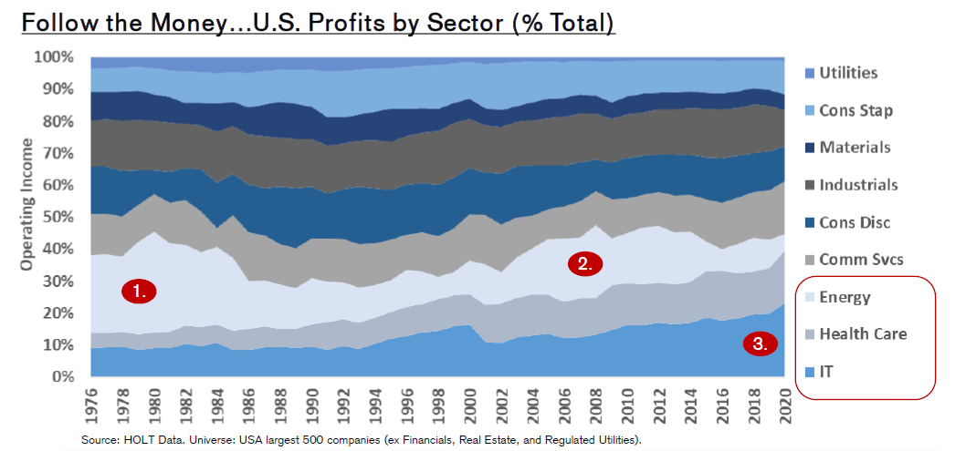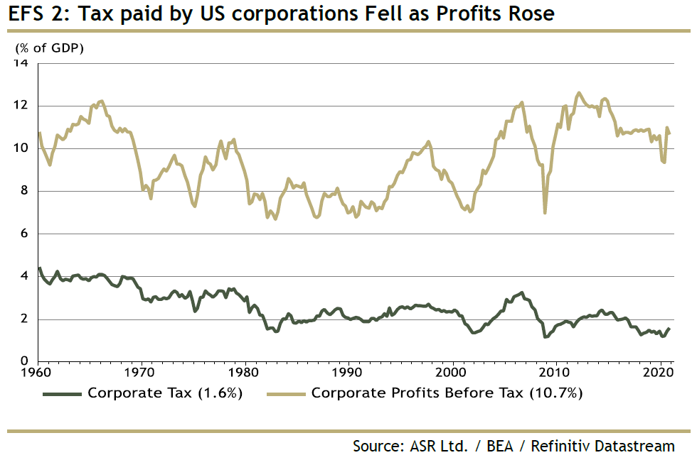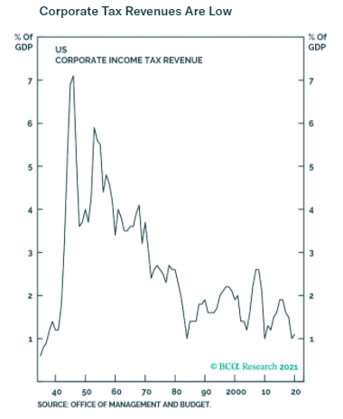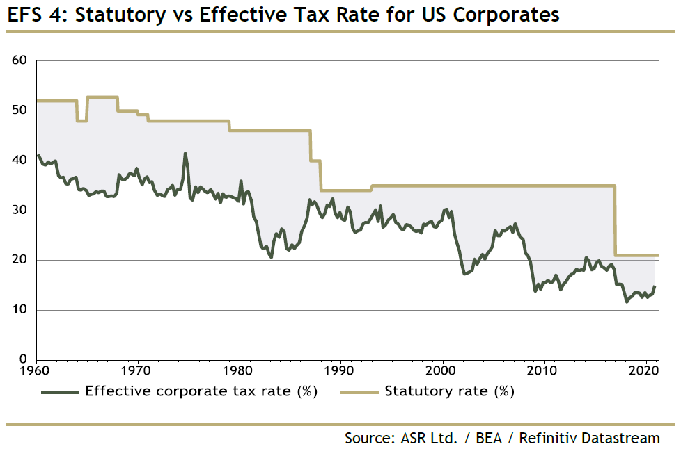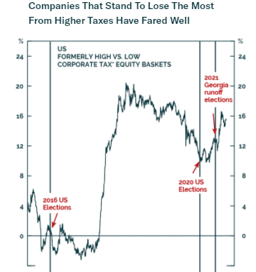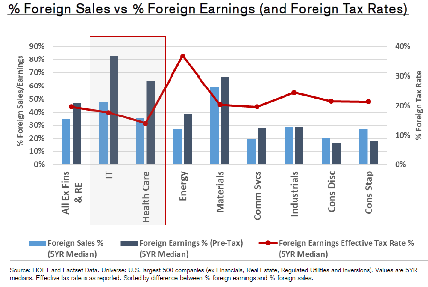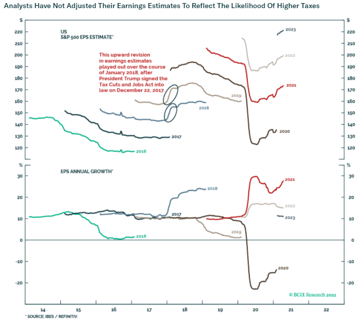 For more, read the administration's "opening bid" in The Made In America Tax Plan. There is more to the issue than a standard presidential negotiation with Congress, as the Biden team is hoping to deal with international taxation issues through a "Global Minimum Tax" deal with the Organization for Economic Cooperation and Development. Such an agreement would stop countries from undercutting others, but probably at the cost of raising less tax than the Biden team currently hopes. The parts of this plan that can pass muster with Senator Manchin (who has already made clear that he prefers 25% to 28%) will probably become law. For investors, there isn't much point combing through the proposals as they currently stand. That doesn't mean the issue can be ignored though. Is it priced in? The Trump tax cut, which in hindsight appeared inevitable, only really began to seem plausible in about September 2017, when other early priorities, such as repealing Obamacare, had fallen by the wayside. It didn't pass into law until the week before Christmas. At that point, as this chart from BCA Research showed, estimates for earnings per share for 2018 and 2019 suddenly increased; analysts waited for confirmation before making any changes:  Companies with the highest effective tax rates only began to outperform in a big way once the deal had been done. Logically, these companies stand to do worst from a reversal of the Trump tax cut, but so far, they are outperforming again under Biden:  Despite great interest and speculation, then, it is fair to say that so far any Biden tax changes haven't been priced in at all. As any tax rises would take effect before much of the money they raised could be spent, it is also fair to expect them to have a negative effect on the stock market (and a positive one, at the margin, on bonds). Is there a case for further reform? Years of congressional dealmaking have rendered a complicated tax code that treats companies very unequally. The gap between the effective corporate tax rate and the official statutory tax rate has narrowed, but it still exists. Companies pay less on average than the statutory rate, as illustrated here by Charles Cara of Absolute Strategy Research Ltd. of London:  The range also remains wide, although the number that pay the highest rates has reduced considerably since 2018. The changing patterns of tax rates, as shown in this heat map from Cara, show that any reform is going to have an effect on companies' relative performance:  Meanwhile, there are reasons why higher taxes could be good politics. Corporate tax as a proportion of GDP has fallen steadily, even as profits have increased:  Over a longer time scale, revenues from corporate taxation begin to look shockingly low. They have fallen to barely 1%, from more than 7% after the war. With populism in the air, it shouldn't be difficult to sell some kind of hike:  One further reason for reform is that the tax cut didn't have the hoped-for effect. There was no obvious boom in capital expenditures or research and development. What did happen was a startling rise in buybacks, almost entirely by companies with lowered tax rates.  Given all of these circumstances, it would be surprising if some meaningful tax hike could not be passed. What effect would a tax hike have on factors? It's just possible that President Trump destroyed the value factor, and a reversal of his corporate tax cut could aid a revival. The following chart from Cara of Absolute Strategy shows the effective tax rates paid by the cheapest and most expensive U.S. large-cap stocks. The cheapest saw a much smaller reduction than the most expensive. Over the preceding decade, cheap and expensive stocks paid tax at much the same rate. Judging by this chart, the Trump cut may have had much to do with the subsequent collapse of value stocks:  Correlation doesn't imply causation, but the way effective tax rates parted company just as value started to underperform is mightily suggestive:  A tax hike might just be the catalyst for a value revival. What effect will this have on sectors? More or less any reform that passes will have a bigger negative impact on information technology and healthcare than other sectors. That is because these companies have relatively large foreign profits, and a relatively low effective tax rate on them, as this chart from Credit Suisse Group AG shows:  Credit Suissse also crunched the numbers on the assumption of a hawkish tax hike, in which the rate rose to 28% with a minimum of 15%.Tech would still enjoy the lowest rates, but endure by far the sharpest increase:  Using the same assumptions, consumer discretionary, healthcare and tech companies would take the biggest hit to earnings, while materials and energy would be least affected:  This is ironic, because in the past when energy earnings have boomed, during the oil spikes of the late 1970s and again in 2008, politicians were keen to recommend imposing special taxes on their profits. Now Credit Suisse shows that tech profits look similarly distended, and therefore a similarly tempting political target:  There's no need to get out tax calculators yet, as it's months before any increase can become law. But some effects are already clear. As negotiations continue, expect the issue to gain in importance. Investors don't want to be late, like they were last time. More on InflationThe inflation debate rages on. This is your reminder that I will be discussing the issue with my Bloomberg Opinion colleague Mohamed El-Erian, who also these days runs Queens College, Cambridge, at 1:30 p.m. New York time, at TLIV <GO> on the terminal. Send questions to my colleague Kriti Gupta at kgupta129@bloomberg.net. Before that, one brief observation on the "reflation trade," and a further pearl of wisdom from my interview with Emi Nakamura, an economist who's taken a lead in the empirical study of inflation. Several correspondents pointed out that the retreat from the reflation trade appe