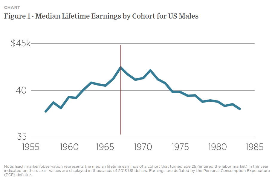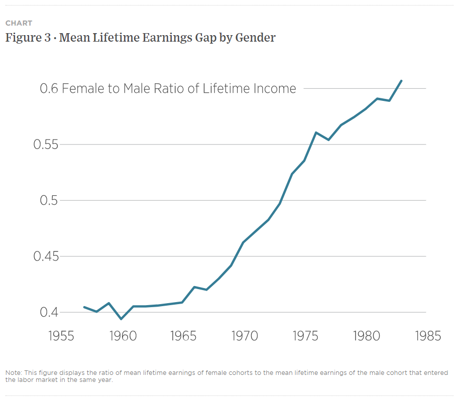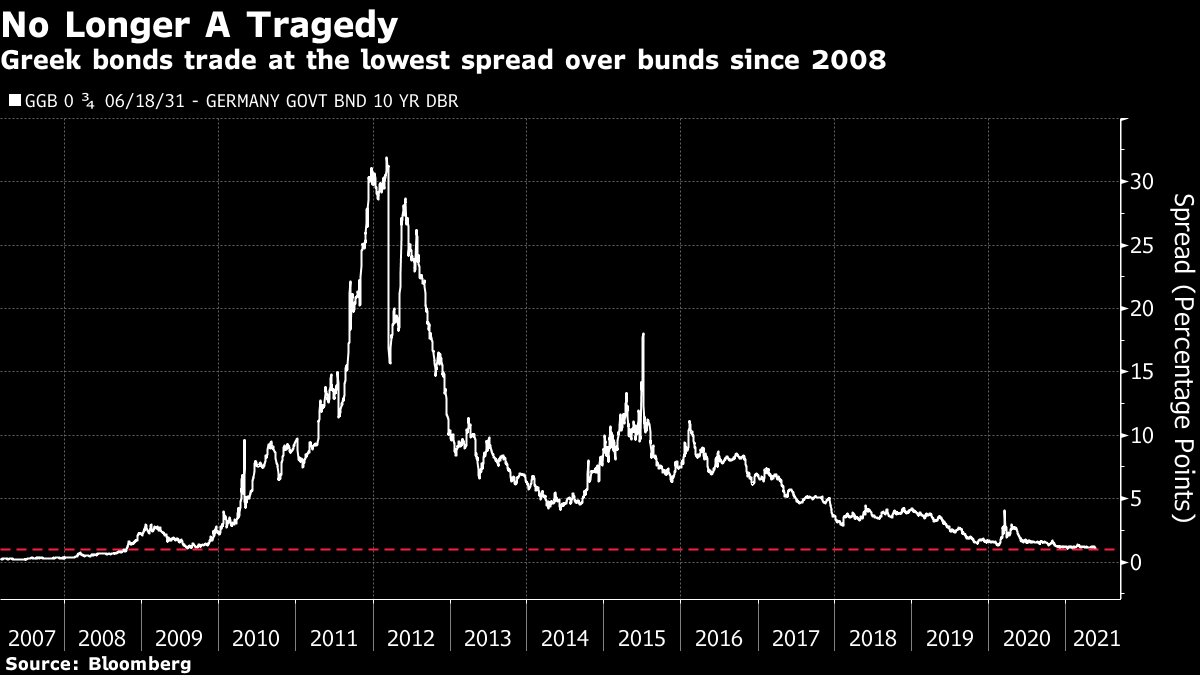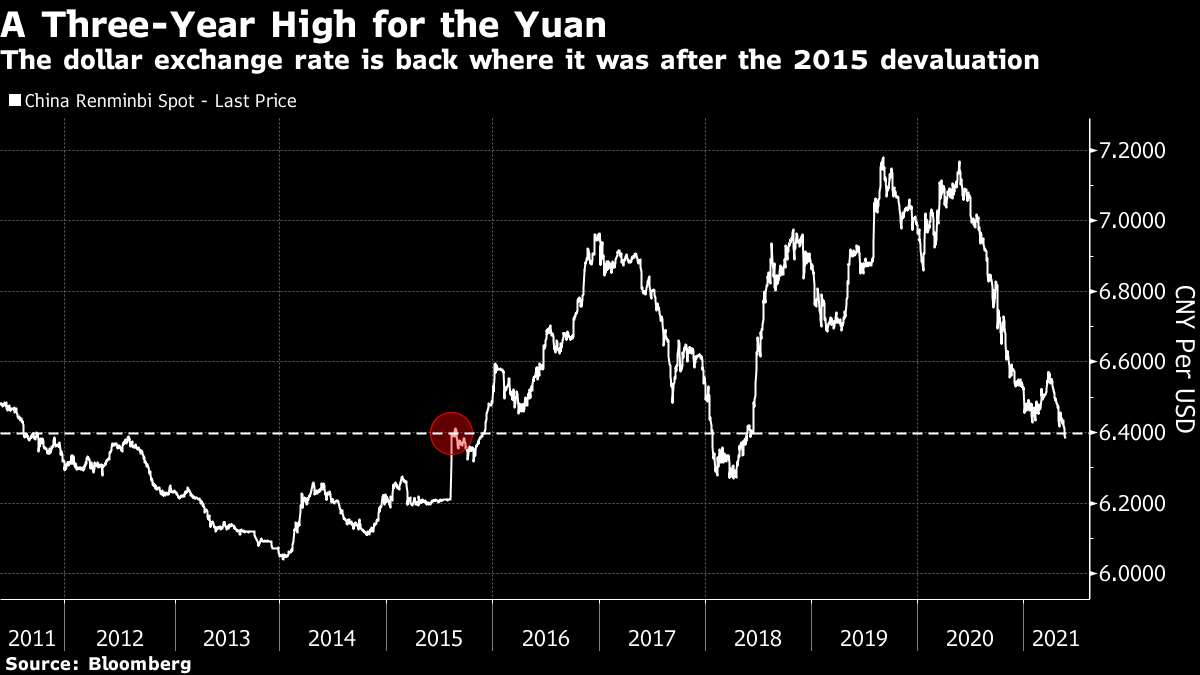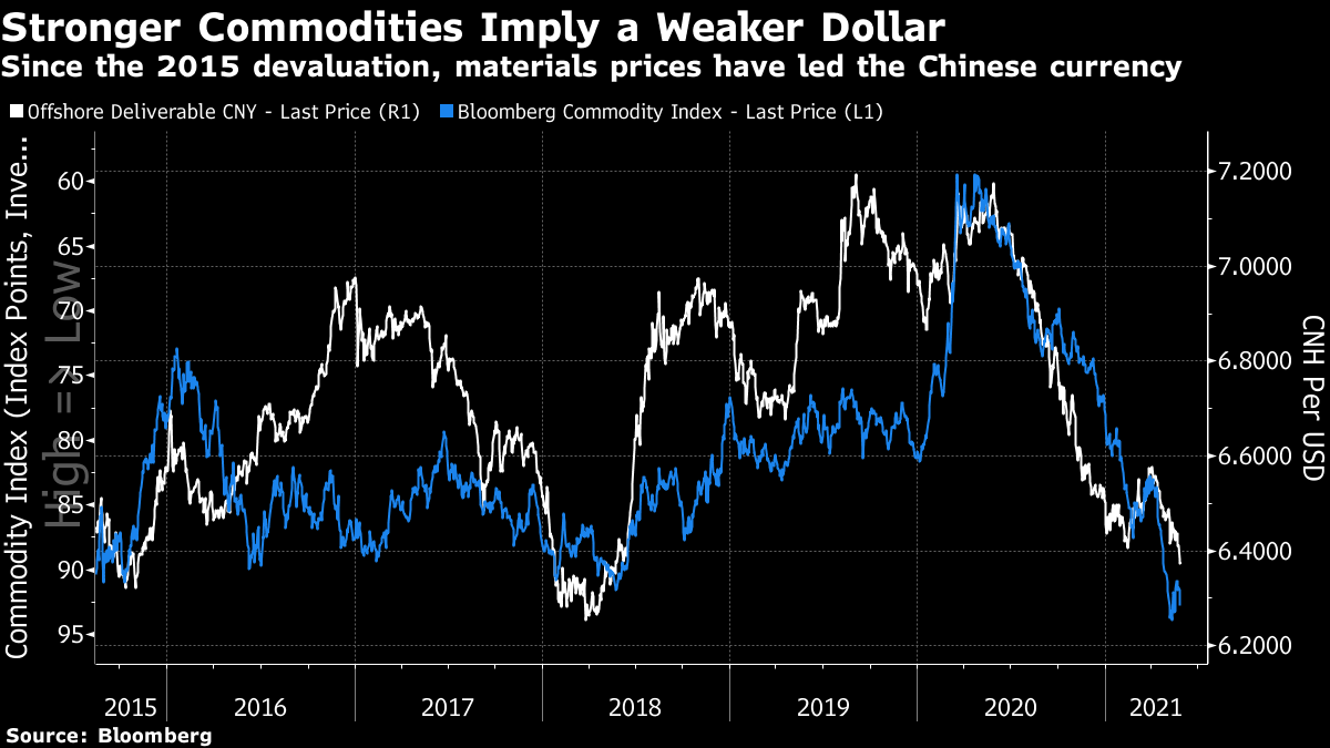 Then there is China's influence. All unnoticed, the Chinese yuan has appreciated significantly, and has now regained all the ground it lost amid the "trade war" tariffs of late 2018. With the exception of a brief period in early 2018, it hasn't been this strong since the infamous devaluation of August 2015, marked in the chart. With investors increasingly looking to China for the cue while the Western world seems becalmed, further strength for the yuan would translate into broader weakness for the dollar:  Another way to put the relationship between China and the dollar involves the commodity market. When China is booming, demand for raw materials tends to be higher, and so a strong yuan and strong commodity prices tend to go together. Since the 2015 devaluation, the following chart shows that the yuan has very much followed resource prices:  The recent rally in metals is widely regarded as evidence of a strong cyclical recovery. If investors believe in that story, the impact on the Chinese and U.S. currencies is another way in which global reflation could translate into a weaker dollar. Will investors have the appetite to take the dollar lower? It looks to be one of the critical questions to answer in June. On balance, we should prepare for a major period of dollar weakness — unless the next raft of data shows that inflation really does take off in the U.S. and forces the Fed into tightening earlier than it wants. Good News from GreeceIt hasn't been much heralded, but Greece seems to have regained the trust of international investors. That is another way of saying that the euro zone is deemed more likely to survive. What follows is a chart of a relationship that many of us grew accustomed to scanning anxiously every day for years at the beginning of the last decade: the spread of Greek over German government 10-year bond yields. This basic measure of country risk exploded higher in the early years of the European Union's sovereign debt crisis, and spiked again during the Greek government's disastrous attempt to call the EU's bluff over further bailouts in 2015. Having topped an incredible 30 percentage points at the end of 2011, the spread is now down to only one percentage point. After much excruciating and unnecessary pain, Greece has righted its ship:  The tragedy of the Greek economy over the last decade has been intense. Everyone (not just Philhellenes like me) should be glad about this recovery. But if there is one cause for concern, it is that the euro zone has more political heat ahead of it. With Mario Draghi, the European Central Bank chairman who virtually saved the euro singlehandedly, now installed as Italy's premier, the greatest political risks of a split have abated. But you never want to rely on Italian political stability. And the politics of the two nations at the center of Europe are uncertain. Germany chooses a chancellor not named Merkel later this year, and France decides whether to give Emmanuel Macron another term early next year. Investors may be a little too relaxed about the prospects for the European project. Why Americans Are So AngryA fascinating report from the University of Chicago's Becker Friedman Institute includes some terrifying data on gender and generational inequality in the U.S. The ugly political environment grows easy to understand. This is what has happened to median lifetime earnings, in real terms, for American men over the last 65 years. By the late 1960s, those entering the workforce could expect to earn considerably more over their career than those who started a decade earlier. But after that, it was downhill. Those who started work in the early 1980s, and might now be hoping to retire, made no more in real terms than those 30 years older:  This isn't good. The decline in male earnings is is in part because of the entry of women to the workforce. This has had the effect of drastically narrowing the gender gap (intensifying male disaffection), while still leaving a huge imbalance in their favor (which will understandably leave women still feeling the victims of injustice):  The report is worth reading in full, and not only because it shows the scale of the discontent in the U.S., even though its macroeconomy seems to have grown steadily over the years. Interestingly it also shows that much of the increase in inequality of recent years, and the decline in opportunities for men, can be traced to inequalities when they enter the workforce. Education matters. That leads to another important issue that it's been easy to ignore. A report just out from the ratings agency Standard & Poor's shows that demand for U.S. university education dropped sharply in the academic year that is now ending. Of course, the pandemic will have had huge effects that may well prove to be transitory, but the numbers are stark:  Many institutions, particularly in the private sector, saw a sharp fall in the number of students enrolling. With demand declining, as I have covered recently, universities have also moderated increases in tuition fees, which have dropped below 1% on an annual basis for the first time in decades. This adds up to a nasty economic problem for U.S. higher education. The higher-rated (in terms of their credit) institutions tended to maintain enrollments relatively better, according to S&P, implying that plenty of lower-rated colleges and universities face financial difficulties. This isn't great, and shows the difficulties of managing a university's finances. Add to this the difficulties for the many endowments that have a heavy investment in real estate, and don't have the usual rental income this year to help them through, and this could be a troubling time for universities. That in turn doesn't augur well for efforts to turn back inequality. Survival TipsAs a long weekend beckons, it might be a good time to catch up on podcasts. One I'd like to recommend is this one from the Cautionary Tales podcast by my former colleague Tim Harford. It tel