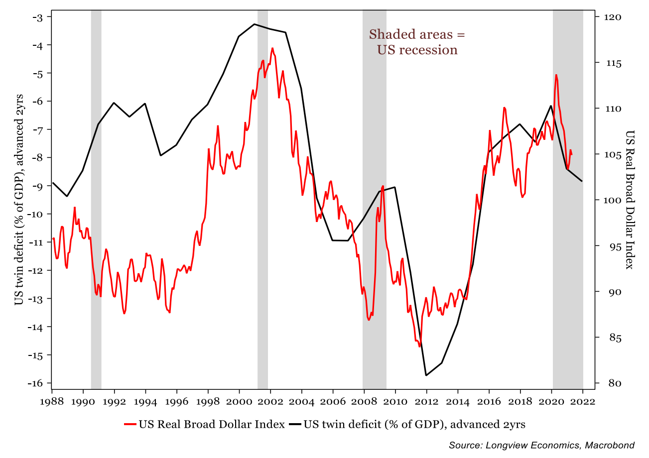 A bet on bond weakness (with higher yields) would also be a bet on a stronger dollar. At present, investors seem reluctant to place such a wager, which could point to protracted dollar weakness. Another factor is the strength of the recovery in the U.S. It matters whether this is inflationary. It also matters whether the recovery is stronger than in other countries, which at present seems likely. If so, then it is fair to expect the returning U.S. consumer to demand more imports. That would widen the U.S. trade deficit and require net sales of dollars for importing currencies, meaning it would weaken the dollar, all else equal. This chart from Longview Economics Ltd. of London shows the closeness of the relationship:  In the long term, a deepening deficit would help cyclical sectors of the stock market, while the weakening dollar would in itself be inflationary (by increasing the dollar price of imports) That would mean growing inflationary pressure in the U.S., and would tend to prompt capital to go elsewhere. An unbalanced international recovery could end up weakening the dollar. This is Longview Economics' view: Our view is that the cyclical/value reflationary sectors of the global stock market will outperform over coming years. That sector rotation should be driven by rising bond yields as markets price in growing inflationary pressures in the US economy. As such, capital will favour non-US markets, and drive a sustained phase of dollar weakness.