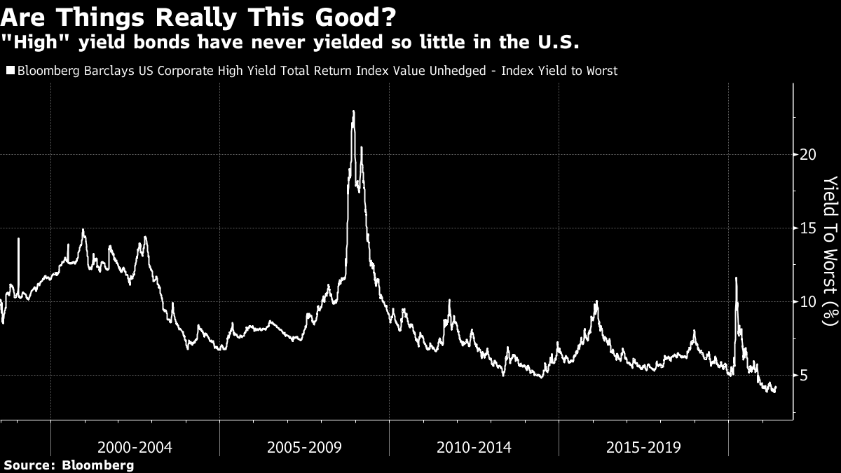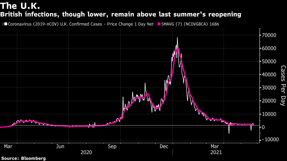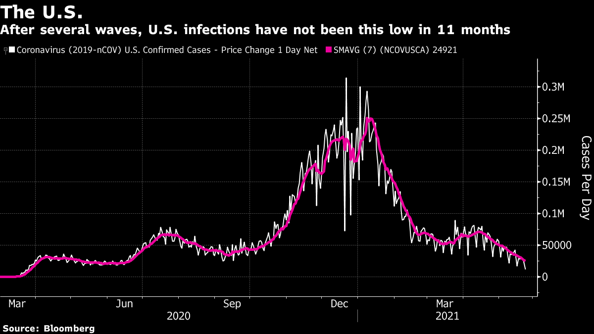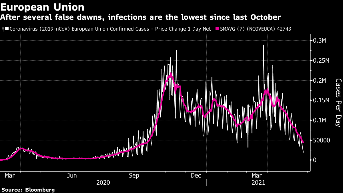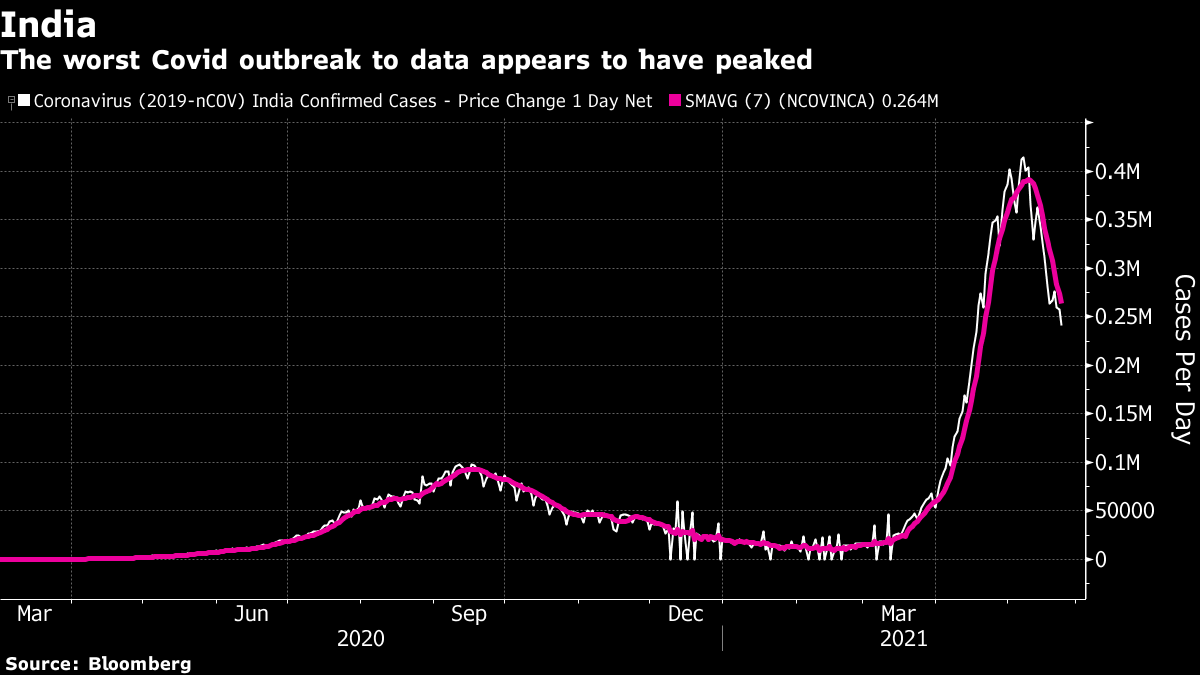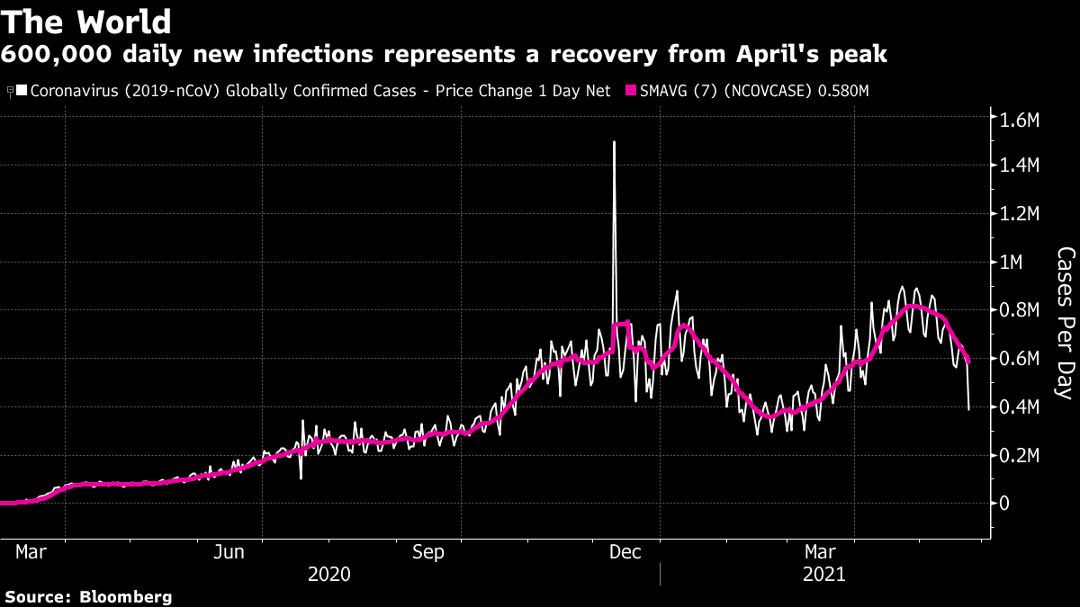Once we concede that the state of the world is indeed truly lamentable, we can then move on swiftly to a plethora of data that suggest things are getting better all the time. Most important, of course, is the coronavirus. Newly reported cases give us good leading indicators. And globally, they have fallen since a terrifying peak last month. It is too soon to declare victory, but the current trend is encouraging:  Meanwhile, the developed world's laggard is catching up. The European Union suffered a nasty new wave of cases in early spring. The trend is now emphatically lower as its vaccine rollout gathers pace:  In India, gripped by the worst Covid outbreak to have happened anywhere, the latest trend is very encouraging. It looks as though that outbreak has peaked, even if the number of people falling ill remains appallingly high:  As for the U.S., the trend in new infections remains clearly downward, even if the disease is still far from being eradicated:  Britain, hit by the first significant variant of Covid but then the first big country to roll out the vaccine into the population, the disease also appears to be under control (although it hasn't been eradicated):  For one discordant note, Taiwan is in the grip of its first outbreak. That said, note the scale on this chart; its worst day to date has seen 700 new cases, a tiny number compared to the pain endured in other countries:  These charts give rise to continuing caution. There have been plenty of unpleasant surprises from the pandemic already. For two great accounts of how swiftly countries can move from appearing to have the answer to suffering a dreadful outbreak, try pieces by Niall Ferguson for Bloomberg Opinion and Morgan Stanley Inc.'s Ruchir Sharma for the Financial Times. But there's still no denying that the news is on balance good. For investors, this raises the question of price. Is too much recovery and too much good news already in the prices of assets most affected? In the case of some companies with most to gain from economic reopening, it doesn't look as though the market is ahead of itself. The S&P 1500 hotels, cruise lines and resorts and airlines sectors remain 30% behind the market since the end of 2019, and have given ground in the last few weeks. From the point of view of whether the market has come too far, this is good news:  Against this, I would be remiss if I didn't reprint the standard reminder that the stock market is absurdly expensive in historical terms, and very dependent on continuing low bond yields. The following chart is from the website of Yale University's Robert Shiller and shows his latest calculation for the cyclically adjusted price-earnings multiple, which compares prices to average real earnings over the previous 10 years. At 37, it is now far more expensive than at any time other than the top months of the dot-com bubble. As for long-term interest rates, they are at historically very low levels, but have come up in the last few months. Even when compared to bonds, this market no longer looks particularly cheap:  Beyond the stock market, what of credit? Last spring, it made sense to fear a broad solvency crisis, as companies went into bankruptcy. The exceptionally aggressive action by central banks, followed now by a steady recovery from the pandemic, has put those concerns to rest. But if we look at Bloomberg's index of the yields on U.S. "high"-yield debt (a dubious term these days) we find them at stunning historic lows:  That is alarming. It also appears to be well ahead of reality on the ground. The following charts are from Credit Benchmark, which culls opinions from 40,000 different analysts. For U.S. industrials, credit quality is improving for the third month in a row:  U.K. industrials have also seen a sharp upgrade in credit quality — indeed, this is perceived by credit analysts as their most positive month since the Brexit referendum, almost five years ago:  Meanwhile, in the EU, credit opinion was exactly neutral according to Credit Benchmark's survey last month. This in itself is an improvement:  In credit as in stocks, the good news from the fight against the virus has created a level of justified optimism. The current direction of travel seems to be justified. What remains far harder to discern is whether the incredible valuations of both credit and equity can possibly sustained if central bank support were to be removed. That issue doesn't go away. But the issue of disease is, indeed, getting better, and for that we can all be thankful. A Bitcoin WeekendIf you haven't been paying attention to the world of cryptocurrency over the weekend, then in a sense you didn't have to. At the time of writing, bitcoin's price in dollars is much where it was on Friday evening. But you would have missed a 19% dive, and a 14% rally from the bottom:  It continues to be hard to see how volatility on this scale can be consistent with the claim of bitcoin supporters that it is an asset ready to supplant fiat currencies. It's conceivable such a moment could come, but it plainly hasn't arrived yet. As the job of replacing fiat currency is naturally going to be a long one, if even possible, it might be fairer to ask whether the cryptocurrency infrastructure has shown itself capable of dealing with an eruption of volatility like this one. Bitcoin's distributed technology, with no weight falling on any central exchange, is after all one of its great appeals. The fact that it suffered a flash crash, of the kind experienced a few times in recent years by established exchanges, and never — on this scale — in the foreign-exchange markets, is a bad sign. The fact that some well-known trading platforms offering to trade bitcoin suffered outages during the heaviest selling is an even worse sign. Against this, there is the argument from Bloomberg Opinion colleague Jim Bianco that the crash was a big win for cryptocurrencies. This is counterintuitve, to put it mildly, but he bases his argument on 