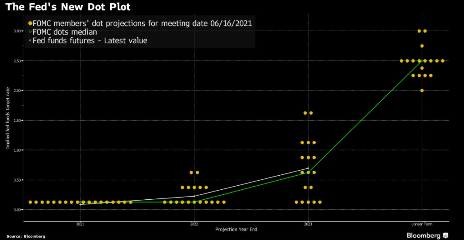 | Inflation trade unwinds, travel reopens, and the sudden arrival of Juneteenth. Narrowing The Treasury yield curve has seen its biggest two-day tightening of spreads since March last year in the wake of the latest Federal Reserve decision. The yield on the 30-year instrument dropped to 2.07%, with investors pulling back their inflation bets after Fed projections signaled two rate hikes by the end of 2023. Shorter-term indicators show that markets are back in sync with the Fed's insistence that inflation will be transitory, with two-year breakeven rates sliding back to March levels. As well as Fed projections, investors can also look to the price of raw materials for reassurance on inflation as much of the commodity rally this year has already been wiped out. Non-essential The European Union added the U.S. to its so-called "white list" meaning Americans can travel to the region without facing restrictions on arrival. European leaders are hoping that President Joe Biden will reciprocate by lifting the ban on travel to the U.S. from Europe. Even as holiday trips rapidly scale up in Europe, British travelers remain mostly grounded amid a surge in infections from the delta variant of Covid-19. Russia is also seeing a surge in cases linked to that variant, with Moscow introducing new restrictions to contain the outbreak. New holiday Speaking of time off, the sudden arrival of Juneteenth as a federal holiday is causing something of a headache for government administrators and private businesses. While some private companies had already put arrangements in place to treat the day as a holiday, the federal mandate means more employees will likely ask for the day off in future. Wall Street banks and financial exchanges are also trying to figure out how to deal with the change at such short notice, with the decision on whether to make it a market holiday set to be taken after this year's occurrence. Markets quietGlobal equities are relatively quiet so far today, with some volatility possible later due to triple-witching when options and futures on indexes and equities expire. Overnight the MSCI Asia Pacific Index slipped 0.1% while Japan's Topix index closed 0.9% lower. In Europe the Stoxx 600 Index was down 0.1% by 5:50 a.m. Eastern Time with banks among the biggest losers. S&P 500 futures pointed to a move higher at the open, oil eased and gold remained under $1,800 an ounce. Coming up... As is appropriate for a holiday, there is very little on the calendar for today. The latest Baker Hughes rig count at 1:00 p.m. could be interesting as the U.S. shale sector is finally back to making money again. The oil market may be more concerned about the election in Iran today, with the result likely to have a bearing on the chances of a rapid return of the country's crude to global markets. What we've been readingHere's what caught our eye over the last 24 hours. And finally, here's what Emily's interested in this morningThe question on a lot of minds this week was, what's with the dots? The main surprise in the Fed's pivot (we won't call it hawkish, because, well, an openness to talking about trimming $120 billion of bond purchases a month, and lifting rates off zero in two years' time isn't exactly raptor-ish stuff) was the opening it chose. An earlier-than-expected signal on asset purchases was within the realms of possibilities, but few had anticipated a stronger signal on hikes. After all, it's well understood that the Fed aims to move first to trim its bond buying program before taking any action on interest rates. Now, sure, Powell actually did say to take the dots with a large grain of salt (then why publish them? Do we need them?), as they're not forecasts or signals of intent, and they're not governed by any kind of consensus across the members of the committee. The signaling on rates may well reflect a divergence in the thinking of the central bank's top and lower-rung officials.  In any case, the benefits of this back-to-front approach — intended or not — are showing in the market. The Fed's continued ambiguity on the taper, while pulling forward its projections for lift-off, appears to have kept long-end rates in check, and focused the selloff in the belly of the curve. Meanwhile, the dot furore has made things slightly harder for the Street's readers of the taper tea leaves. Pimco economists Tiffany Wilding and Allison Boxer worked backward from the revised projections for a possible first hike in 2023, to conclude that the Fed could announce the first pullback in asset purchases as soon as September. They're at the more aggressive end of the spectrum, while Goldman is sticking to its view that a formal notification will come in December, with the process getting under way early next year, "though the risks lean toward an earlier start." And the debate over what happens to long-end yields when it does all kick off is likely to get hotter from here. There's a decent case to say yields struggle to rise in the second half of the year. So far, we've few signs of a tantrum. Some market watchers have posed the theory that perhaps the yield surge at the start of the year was the real dummy-spit, and the market is now more sensitive to fiscal than monetary stimulus. According to Columbia Threadneedle's Ed Al-Hussainy: "I think about what it would take to get the 10-year sustainably above 2% and I suspect we will need another fiscal push. The Fed alone will struggle to do it."