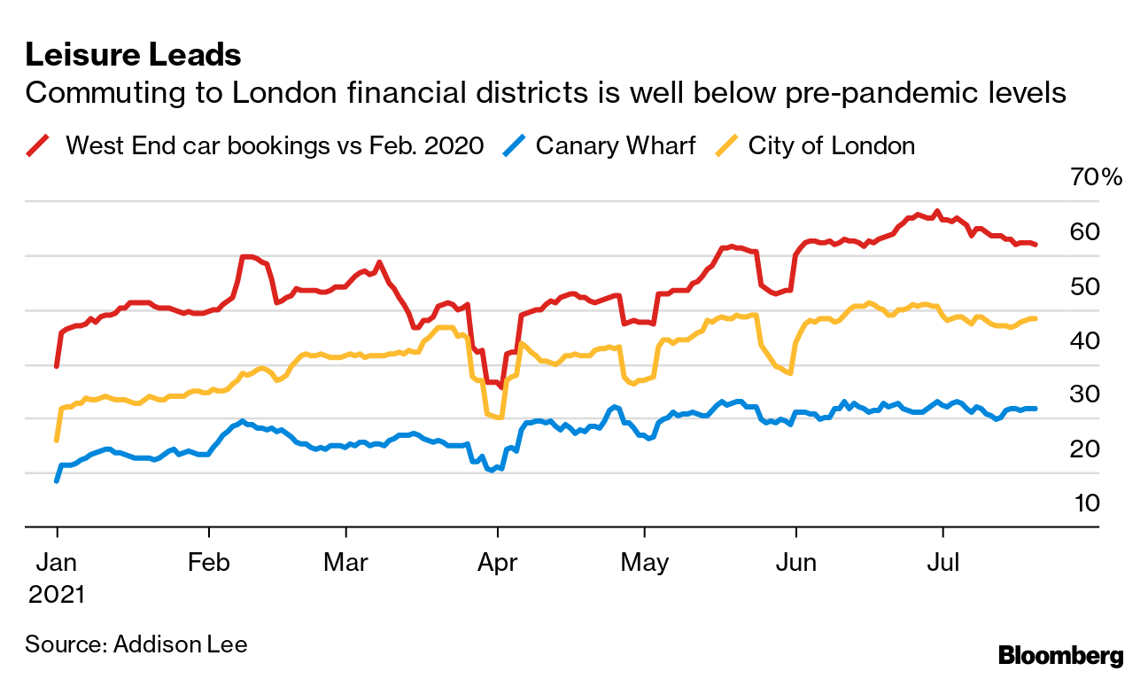| What's happening? The European Union rowed back on a threat of legal action over the Northern Ireland protocol, and Britain will scrap a piece of planned red tape on wine imports. The EU has backed off a threat of imminent legal action against the U.K. over breaches of the Northern Ireland protocol of the Brexit agreement as the two sides try to work through their differences. Officials from Brussels and London will talk through the summer to find technical solutions, though it's unlikely all the issues will be solved, and the EU won't let Britain renegotiate the deal it signed, a person familiar with the matter told Alberto Nardelli and John Follain. Brussels' pertinacity renewed skittishness among investors bullish on the U.K. pound. China's slowdown, together with a surge in Britain's coronavirus infection rate, hasn't helped. Sterling is on course for its first back-to-back monthly declines versus the dollar since March 2020 — when the coronavirus became a pandemic and spurred turbulence in markets worldwide — and only its second month of losses versus the euro in almost a year.  Brexit red tape could deprive Northern Ireland consumers of more than 2,000 generic medicines made in Great Britain, the British Generic Manufacturers Association said. The U.K. and EU have been locked in a series of arguments about how products can flow between Britain and Northern Ireland since the separation from the political bloc at the start of the year. Still, many businesses see the protocol as an opportunity that could boost jobs and growth because it leaves Northern Ireland the only part of the U.K. able to trade with the bloc as before. Bottoms up! The U.K. government said it would scrap a piece of planned red tape on wine imports, a move it said would save 10 pence ($0.14) on each bottle imported into Britain. It also won't require the same certification for wine imports from non-EU countries, including Australia, New Zealand and South Africa. Together, that'll save wine importers about 100 million pounds annually, according to the Wine and Spirit Trade Association. Despite the Brexit tensions between them, France and the U.K. agreed to keep cooperating on "new security challenges," including cyber, the Indo-Pacific region and the fight against terrorism in Africa. Defense is a long-time area of partnership between the two countries, though they have adopted different strategies for the longer term, with the U.K. focusing more on cyberdefense and France maintaining a more traditional approach to military threats. Graduates of top global universities will no longer need a job offer in order to secure a visa to work in the U.K., under a government plan to boost innovation. The move is part of a wider plan to overhaul rules and regulations facing industry as the government seeks to increase the country's competitiveness after Brexit in everything from financial services to technology. —Lizzy Burden We aim to keep you up to date on how the U.K. navigates the world after Brexit. Got tips or feedback? Email us at beyondbrexit@bloomberg.net  Londoners appear far more interested in getting back to shops and restaurants in the West End than they are in returning to the office, and even England's much-vaunted "Freedom Day" earlier this month had little impact on shifting workers. Despite the lifting of coronavirus restrictions on July 19, minicab and courier company Addison Lee says that passenger bookings to and from the capital's financial hubs recovered less than expected. "A damp squib," was the blunt description of Freedom Day from chief operating officer Patrick Gallagher. "In Canary Wharf, the lack of a return to the office is stark." You can follow us @Brexit on Twitter, and listen to Bloomberg Westminster every weekday. Share Beyond Brexit: Colleagues, friends and family can sign up here. For full EU coverage, try the Brussels Edition. You can find all of our newsletters here, but here are some we think you'd particularly enjoy: Bloomberg is also tracking the progress of coronavirus vaccines and mapping the pandemic. Sign up here for our Coronavirus Daily newsletter and here for our podcast. Subscribe to Bloomberg.com for unlimited access to trusted, data-driven journalism and expert analysis. |