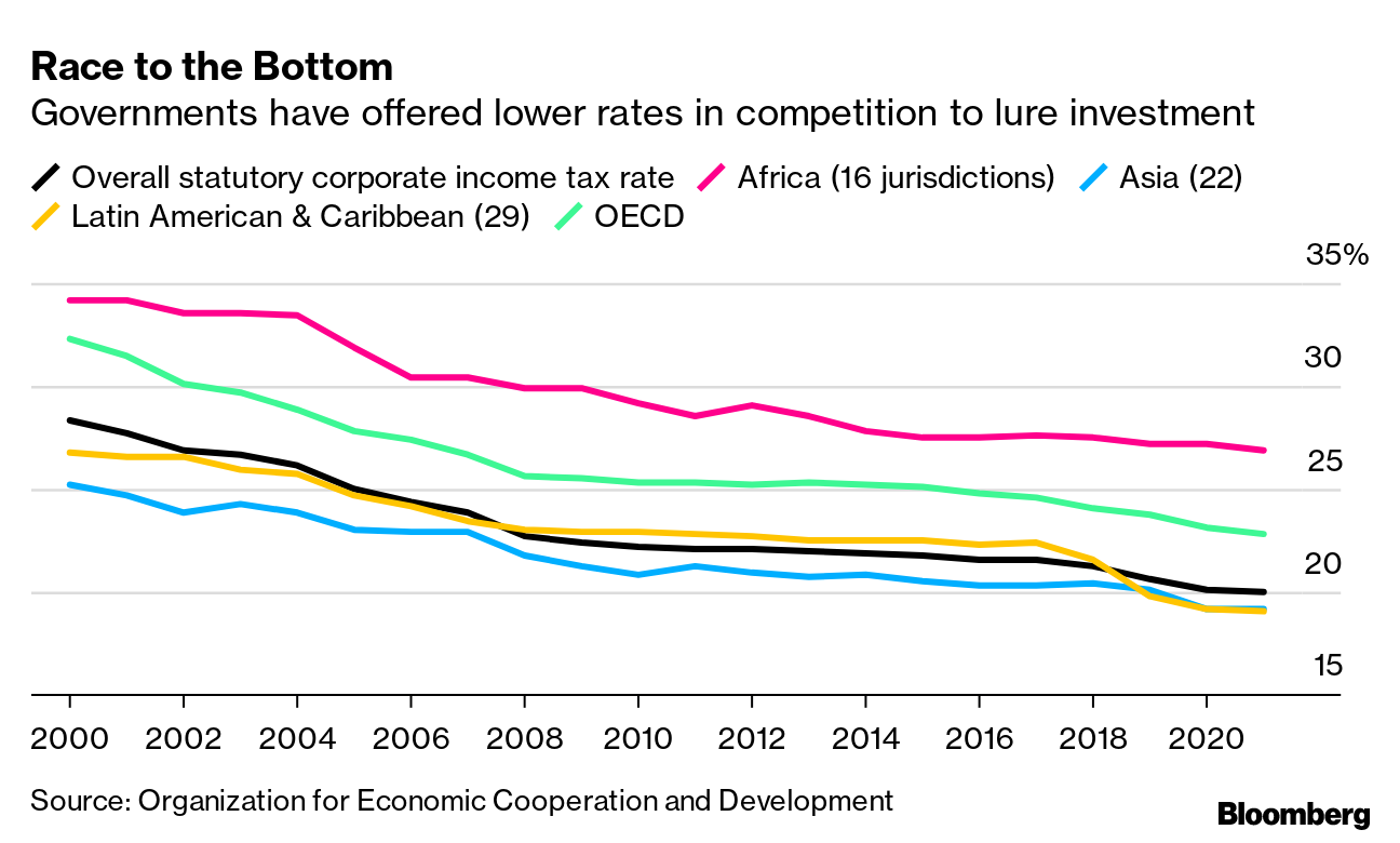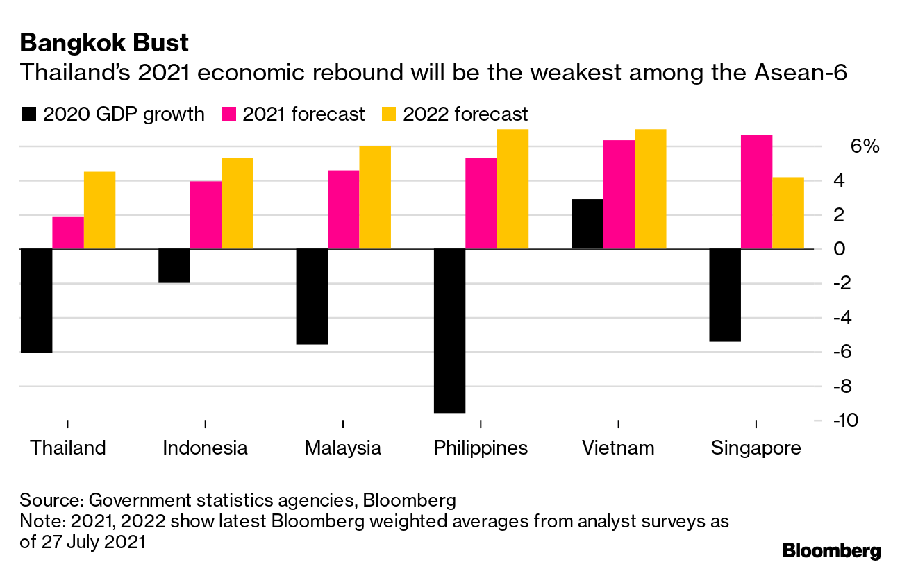 | Hello. Today we look at the latest numbers on global taxes, who is lagging in Southeast Asia and how supply constraints are putting pressure on inflation. U.S. President James Madison had a message that is troubling the world's richest nations two centuries after he left office: "The power of taxing people and their property is essential to the very existence of government." In a world where multinationals with capital dwarfing the size of most economies can shift profits around the globe to minimize their bills, governments are losing that power. Their fear of impotence has now proven great enough for them to overcome the economic antagonism of recent years and cooperate on new rules that would create a global minimum tax and force companies to pay more where they operate. A report by the OECD on Thursday showed just how governments have steadily lost control, in part as they raced to offer lower taxes to lure the investment of large corporations.  According to the research, corporate rates in the last 20 years have fallen in 94 of the 111 countries and territories the Paris-based organization monitors. Over the period, the average statutory rate fell to 20% from 28.3%. Meanwhile, an initiative to crack down on tax avoidance after the financial crisis had another worrying message: The OECD report shows that companies are still parking their profits in places where they have little real presence in terms of staff or tangible assets. More than 130 countries negotiating the new tax rules have given themselves until October to clinch a deal that could change to how much tax companies pay and where as soon as 2023. "Evidence of continuing base erosion and profit shifting behaviors as well as the persistent downward trend in statutory corporate tax rates reinforce the need to finalize agreement and begin implementation," the OECD said. — William Horobin  Thailand will likely be the worst economic performer in Southeast Asia this year, with economists continuing to slash the country's growth forecast amid surging Covid-19 infections, mounting political tensions and fading hopes for a tourism revival. Gross domestic product is expected to grow 1.8%, according to the latest weighted average of 36 economists surveyed by Bloomberg. That's particularly weak after last year's contraction of 6.1%, the most in more than two decades. - Taper talk | Fed officials inched closer to when they can start reducing massive support for the economy. Meantime, Bloomberg Businessweek also takes a look at Powell's reappointment chances.