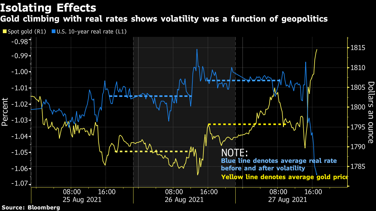 | Good morning. Hurricane Ida, Israel and U.S. on Iran strategy, attack in Afghanistan, booster shots. Here's what's moving markets. Hurricane Ida pummeled New Orleans and the Louisiana coast overnight with lashing rain and ferocious gusts, leaving much of the region without electricity and bracing for widespread floods and devastation. U.S. gasoline futures jumped and oil was steady after the hurricane barreled ashore in Louisiana. This week, traders will weigh the fallout from Ida, as well as the likelihood that OPEC and its allies will go ahead with an increase in output when it meets on Sept. 1. Israel and the U.S. have agreed to pursue a joint strategy to halt Iran's nuclear program, Prime Minister Naftali Bennett said. Bennett, who met with President Joe Biden on Friday, said Israel had made "significant headway" in equipping its military and had also made progress on its bid for visa-free entry for its citizens to the U.S. Following the meeting, Biden said with regard to Iran that the U.S. is "putting diplomacy first and seeing where that takes us." A U.S. drone blew up a vehicle heading for Kabul airport that officials say was carrying several suicide bombers, according to U.S. Central Command, which said it's still assessing results of the strike following reports of civilian casualties. The attack came shortly after U.S. National Security Adviser Jake Sullivan said there was still "serious danger" in Kabul, where a suicide bomber last week killed at least 88 people. Joe Biden's chief medical adviser Anthony Fauci said the door is open to administering booster shots in the U.S. sooner than eight months after a completed Covid-19 vaccination. Israel is also expanding its coronavirus booster drive to all residents age 12 and above, while Abu Dhabi has made booster doses mandatory for people who were inoculated with the Sinopharm vaccine. European stocks are steady ahead of the open, as traders weigh Jerome Powell's signal that Fed support will be withdrawn cautiously. With U.K. markets closed for a bank holiday, Gazprom and Immofinanz are among the biggest names reporting during European hours, while pandemic-era favorite Zoom gives results in the U.S. Most of the day's biggest earnings are coming out of China, where food-delivery giant Meituan reports with investors looking for its efforts to comply with a Chinese regulatory probe. Agricultural Bank of China and Bank of China also report. Meanwhile, the U.S. CDC is set to meet to discuss Covid booster shots. This is what's caught our eye over the past 24 hours. Delta, inflation and central bank policy have dominated the trading narrative in recent sessions. So much so that the steadily growing drumbeat of geopolitical risk in the background had largely been ignored. Until Thursday, that is. Explosions outside Kabul's airport led to some selling in equities and a bid for the dollar. The effect could be isolated from background noise of Federal Reserve speakers who made hawkish noises in the same time frame, and from the Chair Jerome Powell's speech for the Jackson Hole symposium that came after, by the price moves in gold.  See, bullion has an interesting reaction function in these circumstances. As a metal with a proven ability to protect against inflation over millennia, it does poorly when the general pace of price increases falls. At the same time, holding metal in a vault pays no interest, in fact, it carries a small negative yield in the form of storage costs. That means that the investor forgoes income they could earn on bonds if interest rates are high. Or to put it another way, rising real rates increase the opportunity cost of owning gold.