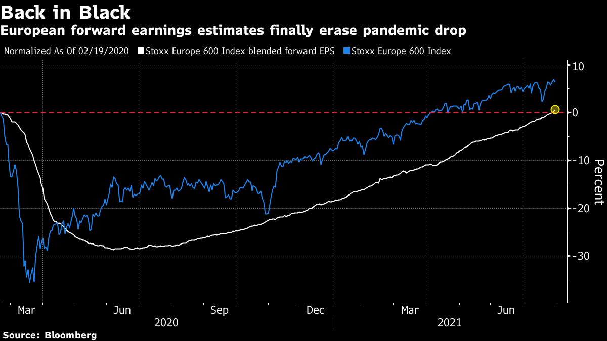 | Good morning. Another tanker is targeted off Oman, Roche has a big new investor and a new study makes the delta variant look even tougher. Here's what's moving markets. Vaccines targeting the highly transmissible delta variant may now be needed, given its ability to infect people with fading immunity and potentially increased severity, researchers leading a large English study of Covid shots said. A third wave of English cases has been driven by the delta strain among both unvaccinated people -- especially those aged 12 to 24 -- as well as some people who had received Covid shots. The effectiveness of vaccines at stopping infection during the study period fell to 49%, the researchers estimated, down from 64% a month earlier. Still, the Covid shots are extremely good, though not perfect, at protecting against hospitalization and death. SoftBank has quietly built a $5 billion stake in Roche, placing a bet on the pharmaceutical company's strategy of using data to develop drugs, according to people familiar with the matter. This makes Softbank one of the largest investors in the Swiss health-care giant, which has experienced a boost by offering Covid-19 test kits. SoftBank believes Roche's Genentech division, which focuses on data-based drug discovery and development, is highly undervalued, one of the people said. Earlier, this year, Bloomberg reported that Softbank plans to expand its investments in the biotech and health-care sector, opening up a new front in its growing asset management strategy. Less than a week after an Israeli-linked tanker was targeted in a suspected drone attack that Israel, the U.S. and the U.K. have blamed on Iran, British maritime officials announced a potential hijack situation, also in the Gulf of Oman. Sky News has since reported that a group of eight or nine armed individuals, backed by Iran, are believed to have boarded the Panama-flagged tanker Asphalt Princess. Iran's Revolutionary Guards denied that its forces or allies were involved in any incident, claiming the allegations were a pretext for "hostile action" against Tehran, state television said on its website. The U.K. is considering blocking the $40 billion takeover of SoftBank's Arm Ltd. by Nvidia due to potential risks to national security, according to people familiar with the discussions. Cambridge-based Arm owns the most widely-used set of standards and designs in the $400-billion chip industry. It is unclear how Arm's change from Japanese to American ownership will affect U.K. national security. However, since SoftBank's 2016 acquisition of Arm, semiconductor technology has become a new focus for politicians. European stocks are headed higher following another record overnight for the S&P 500. In Asia, equities were also in the green as Chinese media tempered their surprise attack on the videogame industry, though sneaker makers were among the beneficiaries as the government advocated exercise as an alternative. Today, earnings season continues in high gear with Intesa Sanpaolo, Commerzbank, Ferrexpo, Hugo Boss, Legal & General, SES and Wolters Kluwer among the reports in Europe. Sony reports in Japan, following on Toyota's heels. In the U.S., CVS, GM, Roku, Uber, Kraft Heinz and Electronic Arts are among the biggest firms to provide updates. This is what's caught our eye over the past 24 hours. As Europe's strong earnings season rolls on, analysts have finally pushed forward estimates back above pre-pandemic levels. As my colleague Michael Msika noted this week, the 12-month forward earnings-per-share forecast for the Stoxx 600 Index has crept about 1% higher than where it was in mid-February 2020. Over 63% of index members have reported quarterly earnings above expectations, with 69% beating on sales, according to data compiled by Bloomberg. Still, the average share price reaction on results day has been a modest decline of 0.3% indicating much of that good news was priced in. Anecdotally, many investors are still reluctant to go all in on the recovery trade, preferring a barbell strategy of holding both economically-sensitive and defensive names. That approach also makes sense from an earnings standpoint. The defensive technology sector made the biggest contribution to 2021 global earnings revisions last month, which climbed by about 5%, according to SocGen. But it was closely followed by the cyclical banks, basic resources and energy sectors, strategists at the French bank said.  Cormac Mullen is a cross-asset reporter and editor for Bloomberg News in Tokyo. Like Bloomberg's Five Things? Subscribe for unlimited access to trusted, data-based journalism in 120 countries around the world and gain expert analysis from exclusive daily newsletters, The Bloomberg Open and The Bloomberg Close. |