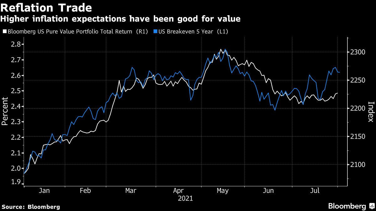 Last Friday Christopher Harvey at Wells Fargo posed an interesting question on whether the equity market will be influenced by nominal rates or inflation expectations. Since the Powell press conference last Wednesday, we've seen real yields collapse to the lowest ever. Nominal Treasury yields moved just a bit lower while breakeven rates rose. Harvey's question is interesting because there are a few ways to think about the relationship between rates and the value trade. One is that with real yields crashing and nominal rates staying put, the longer-term cash flows of growth stocks are discounted at lower rates. Or to put it another way, value is essentially a duration trade. That's why a lot of people also try to take cues from the yield curve -- which has been flattening -- in divining the value-growth outlook.  Another way of looking at this: Investors are expecting the Fed's commitment to accommodative policy to aid economic growth and fuel higher inflation. This could be good for value stocks, which are typically more cyclical in nature. Since that yield move last week, the second reading seems to be panning out, with a market-neutral value index bouncing back. It's a common view these days that stock-market internals are increasingly swayed by the bond market. But last week's moves show that it isn't always straightforward. Follow Bloomberg's Justina Lee on Twitter at @justinaknope Like Bloomberg's Five Things? Subscribe for unlimited access to trusted, data-based journalism in 120 countries around the world and gain expert analysis from exclusive daily newsletters, The Bloomberg Open and The Bloomberg Close. |