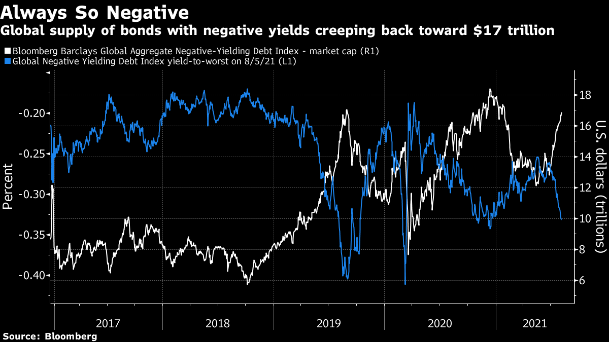 | Good morning & Happy Friday. Jobs data, terrorist financing allegations and bad news for FC Barcelona. Here's what's moving markets. In the U.S. nonfarm payrolls report for July, economists are forecasting 858,000 additions, the most since last August, while the latest "whisper number" among traders points to 897,000 additions. The jump may be distorted by unusually low school-related layoffs amid hybrid and remote learning situations, Bloomberg economists say. As a result, the composition of the July gain across private services, goods and government payrolls will be of more interest than usual. Federal Reserve officials will scour the report as they look for the right time to taper quantitative easing. Another Chinese tech sector has been hit by state media calls for regulation. This time, a People's Daily editorial called for tighter regulation of video services. Shares of Kuaishou, the owner of a Chinese app seeking to rival TikTok, extended their declines in Hong Kong after the editorial's publication. Kuaishou has been battered by a retreat from the U.S., where it's decided to shut down its TikTok clone Zynn. TikTok owner ByteDance is not listed, having put its IPO plans on hold amid the regulatory heat. Superstar player Lionel Messi will not stay with FC Barcelona, according to a statement from the team. The Argentine soccer virtuoso first admitted a year ago that he's been wanting to leave the club ``all year,'' but was eventually forced to stay due to contractual terms. Messi isn't planning to challenge the club's decision in court and drag out a legal dispute, he said. There's fresh U.S. legal trouble for European banks. Deutsche Bank, Standard Chartered and Danske were sued by the families of Americans killed and wounded during the war in Afghanistan who claim they "knowingly facilitated transfers of millions" of dollars that provided aid to terrorists in the region. The banks and two money transmitters functioned as "laundromats," allowing terrorist financiers to secretly move money and evade detection, according to the lawsuit. Deutsche Bank and Standard Chartered declined to comment. A call to Danske Bank after business hours wasn't immediately returned. European stock futures are pointing down as Asian stocks fell amid fresh outbreaks of Covid-19, as China imposed new travel restrictions. It's another busy day of earnings in Europe, where Maersk, Allianz, Covestro, ING and LSE are among the highlights on Friday. It's a quieter day in the U.S., with Dominion Energy among the biggest firms reporting. Of more interest will be the U.S. jobs report for July, which is expected to show another strong month hiring. And the Olympics enters the home stretch ahead of the closing ceremony on Sunday. The spectator-free event has largely passed without major disruption from the pandemic, despite rising cases in host city Tokyo. This is what's caught our eye over the past 24 hours. The world's stockpile of negative-yielding debt is swelling again in a sign that demand for havens is just as intense as that for riskier assets. The market value of the Bloomberg Barclays Global Negative Yielding Debt Index was just under $17 trillion on Friday, up from a low of $12 trillion in May. The yield-to-worst on the gauge has fallen to minus 0.33%, its lowest this year. This week, Japan's benchmark 10-year yield fell to zero for the first time in 2021 after the central bank's debt-purchase operation signaled there was strong demand for the bonds from investors. With inflation also set to drop below zero again, investors aren't likely to face any hawkish action from the Bank of Japan any time soon. Elsewhere, worries about the global economic recovery and concern about the relentless spread of the delta variant has boosted investor interest in haven assets. The record size of the negative-yielding gauge is $18.4 trillion in December.  Cormac Mullen is a cross-asset reporter and editor for Bloomberg News in Tokyo. Like Bloomberg's Five Things? Subscribe for unlimited access to trusted, data-based journalism in 120 countries around the world and gain expert analysis from exclusive daily newsletters, The Bloomberg Open and The Bloomberg Close. |