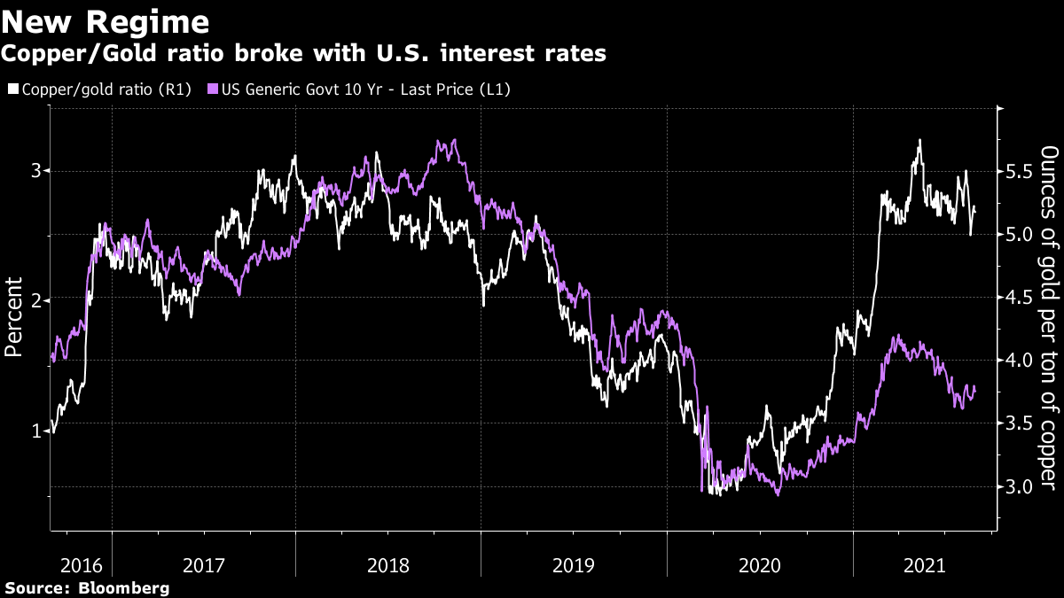 | Good morning. Travel across the Atlantic is getting harder again, the U.S. completed its planned pullout from Afghanistan, and New Orleans is assessing its storm damage. Here's what's moving markets. European Union countries voted to subject the U.S. to fresh restrictions on nonessential travel amid a surge in new coronavirus cases, dealing a blow to the tourism industry. A qualified majority of ambassadors voted to reintroduce the curbs, which had been lifted in June, according to an EU statement Monday evening. The change appears most likely to affect unvaccinated Americans. Around the same time, the U.S. State Department raised its travel advisory for Germany one notch to Level 3, saying Americans should reconsider travel due to Covid-19. The U.S. officially ended its military presence in Afghanistan last night when the final C-17 Globemaster took off at exactly 11:59pm Kabul time, meeting President Joe Biden's deadline and concluding two decades of American involvement. A rushed withdrawal of more than 123,000 people followed the Taliban advance to Kabul, and the killing of 13 U.S. service members in a suicide bombing outside the capital city's airport last week. Those deaths come on top of the loss of about 2,400 Americans and tens of thousands of Afghans, and about $1 trillion in U.S. spending since the conflict began. While the second-most intense hurricane to ever hit Louisiana is now weakening as it travels inland, more than a million homes and businesses around the U.S. Gulf Coast remain without power. The impact on oil and refining industries is still being tallied, though gasoline prices look set to hit the highest level on a Labor Day holiday since 2014. As Ida slowly travels north, it may unleash as much as two feet of rain, a level that could yet prove catastrophic. Analysts estimate that the storm could cost insurers at least $15 billion. Apple plans to add satellite functions on future iPhones that can send SOS texts out of cellular range, a person familiar told Bloomberg. Analyst Ming-Chi Kuo said the phone will probably work with Globalstar, whose shares surged. Separately, the iPhone maker bought classical-music streaming service Primephonic and plans to launch an app dedicated to the genre. Apple shares climbed to a record on Monday, topping $2.5 trillion in value. Earlier reports have led to conjecture that the iPhone will become something akin to a satellite phone, freeing users from having to rely on cell networks, but Apple's plan seems to be more limited in scope for now. European stocks are set for a flat open, after Chinese PMI data indicated the economy took a hit from the delta variant outbreak. The most significant earnings of the day are also in China, where beleaguered Evergrande reports as it aims to stave off a cash crunch. Bunzl, EMS-Chemie and Ackermans & van Haaren are among the bigger firms reporting in Europe. Elsewhere in the continent, ECB Governing Council members Robert Holzmann and Klaas Knot are among the speakers at a conference in Alpbach, Austria. In the U.S., cybersecurity firm CrowdStrike and Chinese gaming giant NetEase are among firms reporting, amid China's latest crackdown on how long kids can play online each week. This is what's caught our eye over the past 24 hours. If you want to sound well informed about markets, there are few things that will build your street cred faster than dropping references to a strong cross-asset correlation. Discover and promote a little-known relationship between seemingly disparate assets – particularly one that can be explained by plausible economic fundamentals – and they may just name it after you. Enter the Gundlach Ratio – named for DoubleLine Capital's Jeffrey Gundlach who pointed at the relative price of copper and gold as a tool for forecasting Treasury yields. Since copper is a cyclical commodity, and gold a perceived inflation hedge, a ratio of their prices should react to similar drivers as nominal 10-year yields. And statistically, it works. The ratio and yields registering 0.5 correlation on a weekly basis over the past five years.  Then, in the six months that spanned the calendar turn to 2021, the pair suddenly decoupled, with the copper-gold ratio suggesting yields should double. But what simplistic analysis misses is that it's not the absolute level that matters. Copper jumped in price relative to the fundamental drivers it has in common with the other two assets, thanks to optimism over its use in electric vehicles and supply-chain constraints. In other words, there was what statisticians call a regime shift in the data. The copper-gold ratio isn't broken, it's just that we need to look at the direction of travel, rather than the level, for clues on changes in interest rates. Eddie van der Walt is a Markets Live reporter and editor for Bloomberg News in London. @ EdVanDerWalt Like Bloomberg's Five Things? Subscribe for unlimited access to trusted, data-based journalism in 120 countries around the world and gain expert analysis from exclusive daily newsletters, The Bloomberg Open and The Bloomberg Close. |