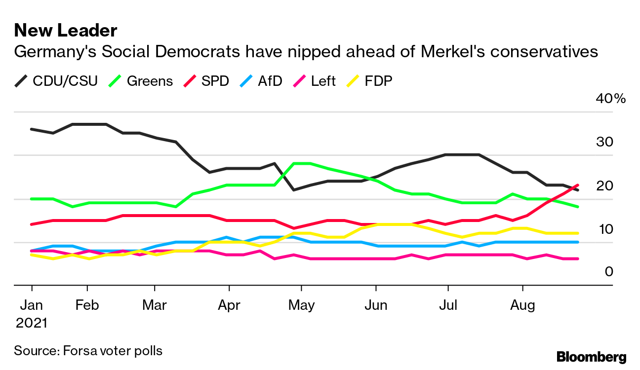 Losing grip | Chancellor Angela Merkel's conservative bloc is on the offensive as polls show its years-long lead over the Social Democratic Party evaporating less than five weeks before Germany's federal elections. In a Bloomberg webinar yesterday, Markus Soeder, who heads the Bavarian faction of Merkel's bloc, claimed a Social Democratic-led government would abandon balanced budgets and introduce "massive" tax increases after the party called for looser fiscal policy and new taxes on the rich.  Border clash | A divided U.S. Supreme Court rejected the Biden administration's rescinding of a Trump-era immigration policy concerning asylum seekers entering from the border with Mexico. The court left in force a ruling requiring the resumption of a process, halted in June, that has forced almost 70,000 people to remain in Mexico while their applications are processed. Best of Bloomberg OpinionDangerous leaks | Invisible plumes of methane, which has more than 80 times the warming power of carbon, are escaping from sites in Romania, one of the European Union's top producers of oil and gas, according to the nonprofit Clean Air Task Force. The leaks highlight a challenge for European policy makers who proposed sweeping measures to decarbonize the EU's economy but have yet to pass laws to tackle methane. - Brazilian President Jair Bolsonaro has no plans to interfere with the central bank despite his growing unease about inflation in the run-up to general elections next year.