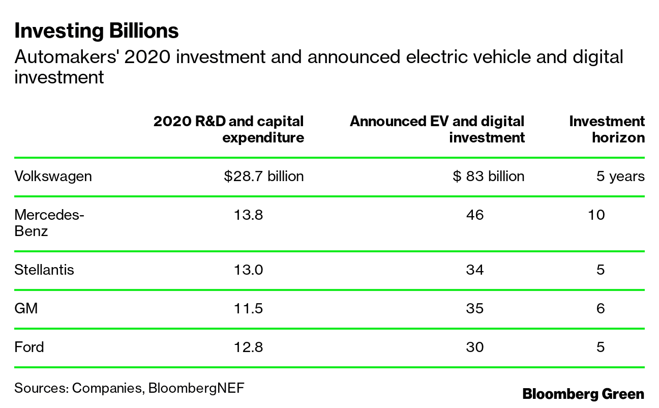 BloombergNEF closely tracks automakers' investment in electrification, as well as in digital initiatives such as smart vehicles and autonomous driving programs. The five biggest U.S. and European automakers have all committed tens of billions of dollars to EVs and digital initiatives.