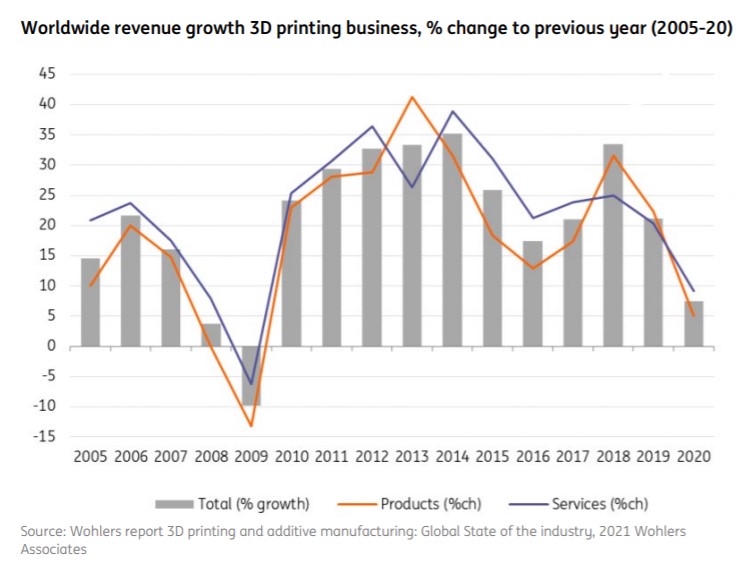 3-D printing — celebrated half a decade ago as a means to revolutionize production — had global revenue of just $12.8 billion in 2020, which is 0.1% of the global value-added of manufacturing, ING's Head of International Trade Analysis Raoul Leering wrote in a report. While it's the dominant production technique in some niche markets — dentistry, medical devices and hearing aids — it's currently too expensive to become a widely used method in manufacturing. Leering says that there currently is no sign of further technological breakthroughs that would bring down costs.