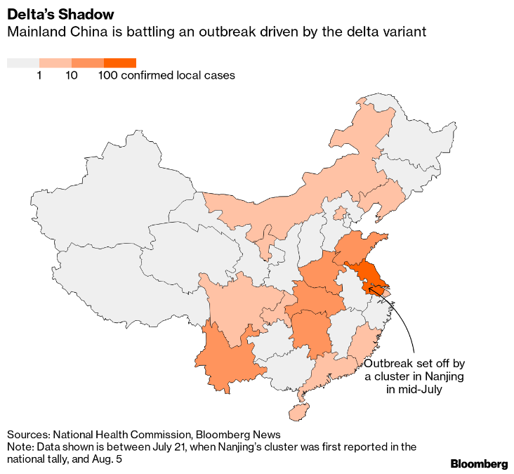 Already, there are signs the U.S. economy is starting to feel the effect too as events are cancelled and some consumers start to fret. --Malcolm Scott  Unlike the U.S., where anti-vaccine fringe groups have fueled resistance to Covid shots, Hong Kong is facing a different challenge. Most of the city's elderly are reluctant to get inoculated, and some point to an unlikely source for the hesitancy: their doctors. Almost half a year into the territory's vaccination program with freely available shots, seniors are still staying away, due in part to advice from ultra-cautious doctors to defer vaccination if they have chronic conditions not yet under control. - Coming up | The U.S. payrolls report for July is out today with the median forecast of economists surveyed by Bloomberg anticipating a 850,000 advance in jobs.