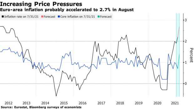 —Chris Anstey The euro zone saw its fastest inflation since 2012 this month with a reading of 2.7%, according to the median forecast of economists, as supply bottlenecks and loosened lockdowns stoked prices. Meanwhile the strengthening recovery is likely to have pushed unemployment to a full percentage point below its crisis peak of 8.6% seen last year. Those statistics on Tuesday and Wednesday will focus the minds of European Central Bank policy makers who are trying to assess the quality of the rebound from the pandemic and the sustainability of inflation, as they prepare for a significant monetary decision the following Thursday on whether to keep up an elevated pace of stimulus. Elsewhere, gross domestic product reports in Canada, Australia and India, China's purchasing managers indexes, and a possible interest-rate increase in Chile will all feature among the other big economic reports in the next days. For a full rundown of the week ahead, click here. - Hurricane devastation | Hurricane Ida pummeled New Orleans and the Louisiana coast overnight with lashing rain and ferocious gusts, leaving much of the region without electricity and bracing for widespread floods and devastation. New Orleans may be without power and air conditioning for more than three weeks in the wake of the hurricane, the city's port has halted container terminal and break-bulk operations and U.S. motorists should start bracing for higher costs at the pump.