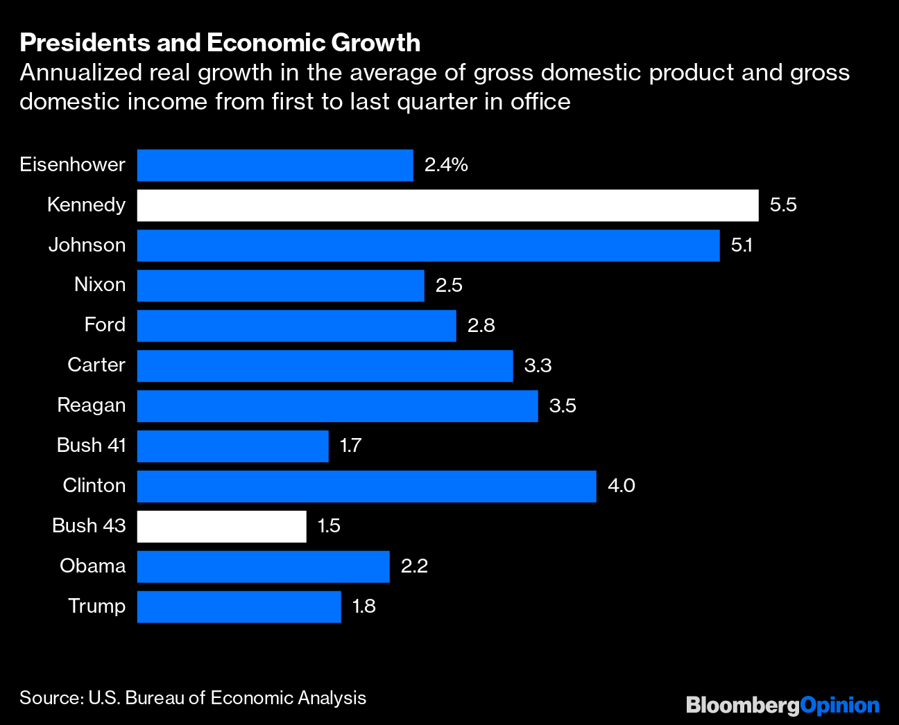 It was the whopping-yet-still-disappointing 6.5% annualized growth number for the second quarter that got most of the attention when the U.S. gross domestic product report came out last week. But the data release from the Commerce Department's Bureau of Economic Analysis also included revisions to GDP and related measures back to 1999, making this an opportune time to take another look at economic growth under Donald Trump and his predecessors. This is, let's be clear from the start, not a perfect way of measuring presidential economic performance. There are lots of things that determine economic growth rates other than who is in the White House, and when a president does make a difference the results may be felt long after he's left Washington. Still, it's a widely used metric and Trump was downright obsessed with it, so here goes. OK, maybe that GDP obsession didn't work out so well for Trump.