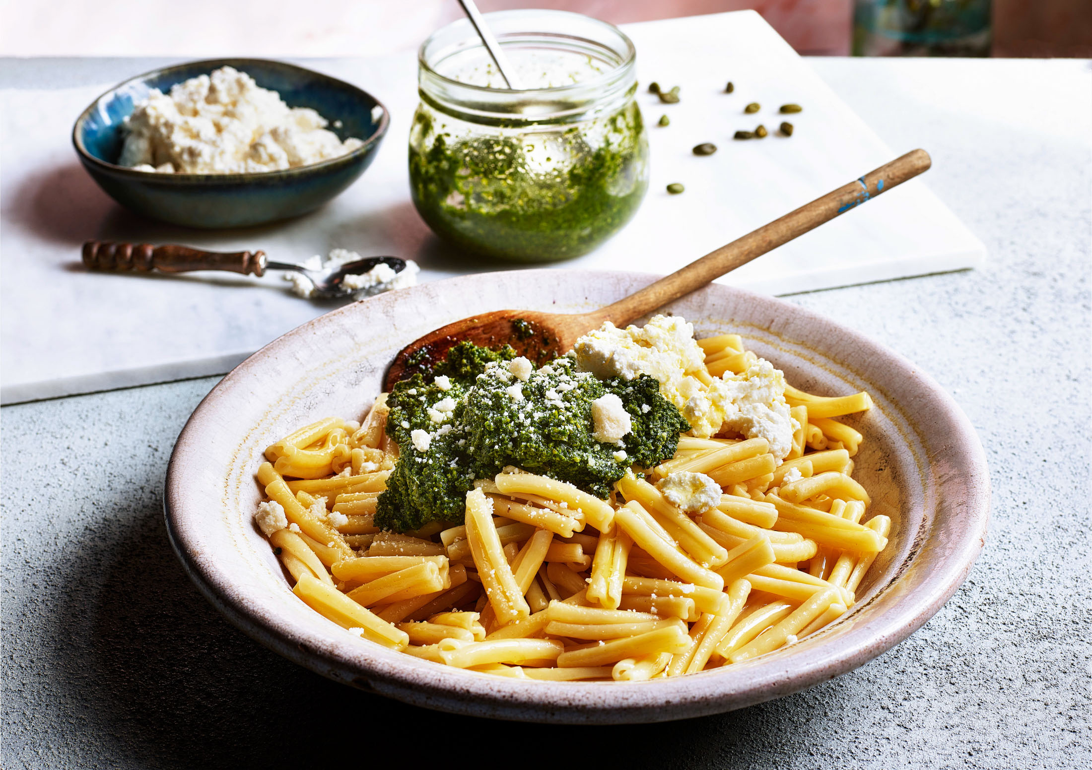 In a large pot, cook the pasta in boiling salted water according to package directions. Drain, reserving a little of the pasta cooking water. In the pot, mix the pasta with a splash of olive oil, a little of the pasta cooking water, and about half the pesto. Stir in the Parmesan and check consistency; it should be saucy. If necessary, add more pesto. Off the heat, stir in the ricotta.