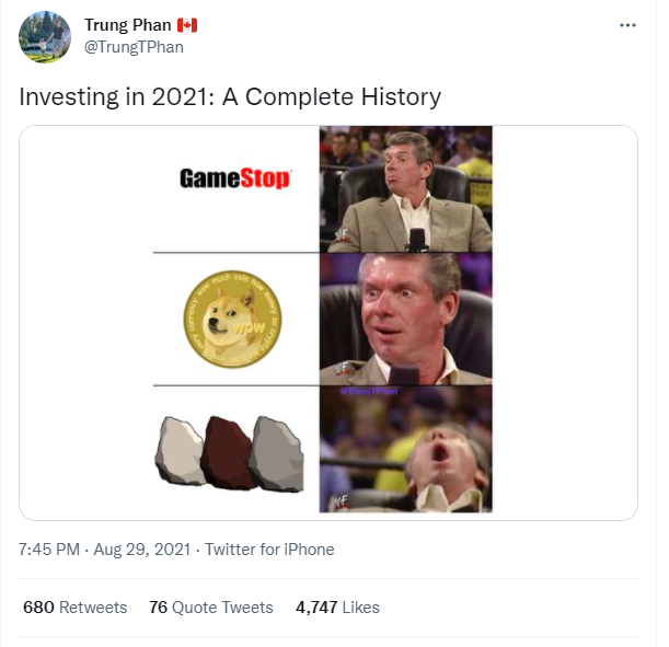 | Caution on U.S. stocks, China debate heats up, and Bitcoin nurses losses. Morgan Stanley, Citigroup Inc. and Credit Suisse Group AG are all cautioning investors on the outlook for U.S. equities. Citing "outsize risks" to growth through October, Morgan Stanley slashed American stocks to underweight and global equites to equal-weight. With the Delta variant continuing to slow the return to normal, and policy debates in Washington getting bogged down, the bull case is getting harder to make. Citigroup said that bullish positions in U.S. stocks currently outnumber bearish ones by 10 to 1, meaning that any correction could quickly become amplified. The debate on Wall Street over investments in China is heating up, with billionaire investor Ray Dalio saying the opportunities in the nation cannot be neglected. His comments come the day after George Soros criticized BlackRock Inc.'s push into the country as both a risk to clients' money and U.S. security interests. Meanwhile, government mouthpiece publication The People's Daily ran a front page editorial trying to ease foreign investor concerns that President Xi Jinping's regulatory crackdown would hurt them. One unusual thing that Xi's polices are causing is a robust public debate within China, something rarely allowed under Communist Party rule. El Salvador's official adoption of Bitcoin as legal tender did not go as well as might have been hoped, with the introduction marred by technical problems and a 17% plunge in the digital token. While the worst of the selloff was recovered yesterday, Bitcoin is falling again today and was trading at $46,200 by 5:50 a.m. Eastern Time. For El Salvador, the new currency might work for retail payments, but there are increasing signs the bond market is becoming nervous about the country's prospects with its entire yield curve now inverted. With the outlook for growth coming under increasing pressure, global equity investors are busy taking some risk off the table. Overnight the MSCI Asia Pacific Index slipped 0.1% while Japan's Topix index closed 0.8% higher, with the rally driven by Japanese Prime Minister Yoshihide Suga's decision to effectively step down. In Europe, the Stoxx 600 Index had dropped 0.9% by 5:50 a.m. as traders remained cautious ahead of tomorrow's ECB decision. S&P 500 futures pointed to a move lower at the open, the 10-year Treasury yield was at 1.355%, oil rose and gold was slightly higher. U.S. job openings data for July is at 10:00 a.m. The Bank of Canada is expected to hold policy unchanged when it announces its latest monetary policy decision, also at 10:00 a.m. The U.S. sells $38 billion of 10-year notes at 1:00 p.m. The Fed Beige Book is at 2:00 p.m. and consumer credit for July is at 3:00 p.m. Lululemon Athletica Inc., SentinelOne Inc. and retail-investor favorite GameStop Corp. are among the companies reporting results today. Here's what caught our eye over the last 24 hours. Remember GameStop? Back in January it surged about 17x in a matter of two weeks and was the poster-child of retail mania. Everything that seemed crazy about the market seemed to be encapsulated in that name. Well, people don't talk about it as much, but the stock is still trading at $199 compared with about $10 a year ago. Of course, by today's standards, GameStop almost seems like a boring old blue chip. There's actually a story there with Ryan Cohen and the new management and the plans to turn it all around. Compared with newer things like AMC, various crypto currencies, and NFTs of drawings of rocks, GameStop is boring. Back in January, I argued that you never know where in a mania you are in real time. What can feel like a "this is the top" moment, may turn out to just be the beginning. It's impossible to say, except in retrospect. This meme I saw yesterday basically nailed it. Bloomberg Bloomberg Follow Bloomberg's Joe Weisenthal on Twitter at @TheStalwart Like Bloomberg's Five Things? Subscribe for unlimited access to trusted, data-based journalism in 120 countries around the world and gain expert analysis from exclusive daily newsletters, The Bloomberg Open and The Bloomberg Close. |