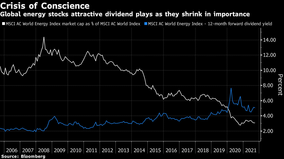 | Good morning. The ECB slows the pace of bond purchases, the U.S. adds to the vaccine push, equity concerns grow and China intervenes in the oil market. Here's what's moving markets. The European Central Bank has decided to slow the pace of purchases under a giant emergency program it unleashed in the wake of the coronavirus pandemic. President Christine Lagarde was careful not to call it a tapering but a "recalibration" amid a stronger near-term outlook for prices and growth. And bond purchases may still end up lasting for years as conditions for a rate rise are unlikely to be met, according to a Pimco money manager. U.S. President Joe Biden will ask federal employees, contractors and health-care workers to get vaccinated against the coronavirus, adding to government efforts around the world to deal with unprotected parts of the population. The decision follows a rise in delta variant infections that triggers fresh concerns about the pandemic. Meanwhile, researchers are warning that the proliferation of Covid-19 variants in Africa, partly attributed to a low vaccination rate, could lead to vaccine-evading mutations. Deutsche Bank analysts are adding to concerns about high stock valuations, flagging growing risks of a "hard" valuation correction. Five-year forward returns have tended to be negative on average when stocks trade at similar valuations to today. This follows recent warnings from Goldman Sachs, Morgan Stanley and Citi that equity gains in the U.S. are increasingly vulnerable to shocks, ranging from Covid-19 to the easing of central bank support. China is selling oil from its strategic reserves, explicitly to lower prices, in a major intervention from the world's largest oil importer. The government is combating rising raw materials costs and indicated it could release more reserves to balance the market. The move comes as factory-gate inflation has risen to a 13-year high, which puts pressure on consumer prices worldwide. It's looking like a good day for European stocks after equities rose across the board in Asia, with Japan resuming its Suga-free rally and Chinese tech shares rebounding. A phone call between President Joe Biden and China's Xi Jinping helped to lift the mood. Today, Russia is in focus with the central bank expected to deliver a fifth straight rate hike as prices continue to run hot. Elsewhere, ECB Governing Council Member Olli Rehn speaks at monetary policy conference, and the U.K. reports monthly GDP figures. GVS, El.En, Medacta report in Europe while in the U.S., retailer Kroger is among the reports in a quiet day. This is what's caught our eye over the past 24 hours. Harvard's declaration that it will no longer invest in fossil fuels comes at a time when global energy stocks are looking increasingly attractive to less environmentally-minded investors. The American university's endowment has no investments in companies that explore for or develop fossil fuels and "does not intend to make such investments in the future," according to a letter from President Larry Bacow on the Harvard website. The move echoes a trend of prominent investors shifting their energy holdings toward renewable names and green technologies. The market cap of the MSCI AC World Energy Index has shrunk to just 3% of the global stocks gauge, down from about 14% in 2008. Yet the exodus has made the energy cohort super cheap -- it trades on just 10 times forward earnings -- and it has an attractive 5% forward dividend yield, three percentage points above the global average. Of course, investors still have to wrestle with their own consciences -- a legitimate debate on a warming planet -- and quite possibly their fund mandates, if more asset managers take a stance like Harvard's. But it's notable that even ESG indexes contain old school energy stocks, so they have not yet reached uninvestable status.  Cormac Mullen is a cross-asset reporter and editor for Bloomberg News in Tokyo. Like Bloomberg's Five Things? Subscribe for unlimited access to trusted, data-based journalism in 120 countries around the world and gain expert analysis from exclusive daily newsletters, The Bloomberg Open and The Bloomberg Close. |