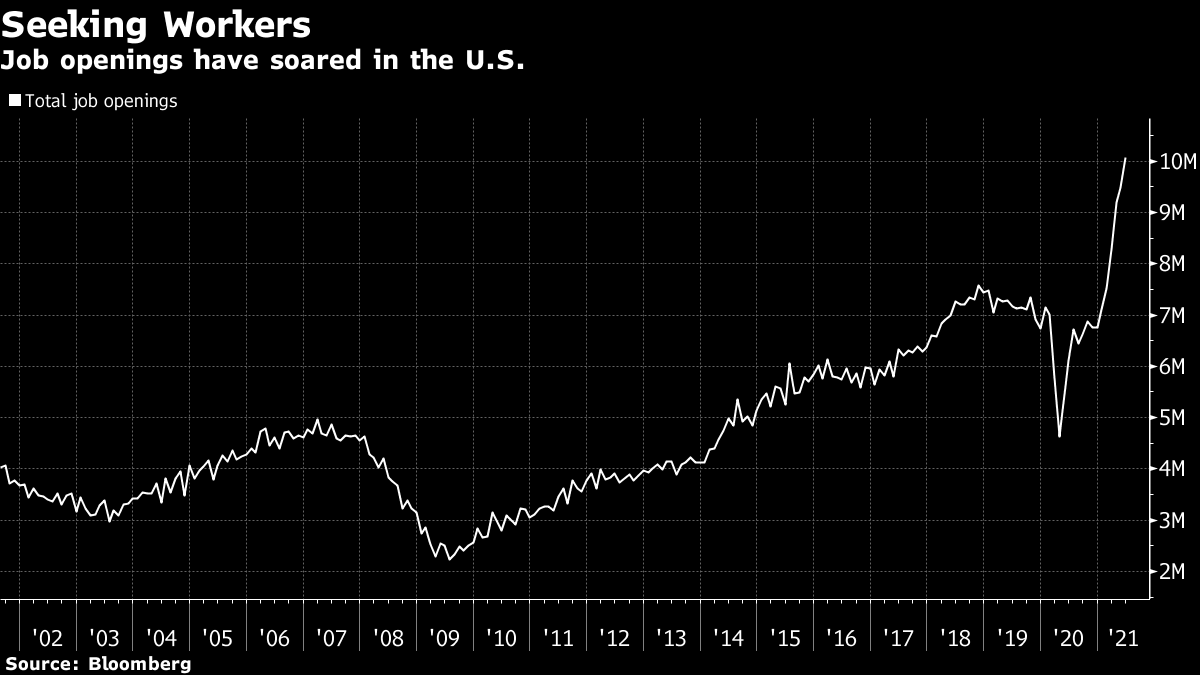 | Good morning. Bitcoin hit, U.K. tax grab, Taliban concerns, pet retailer pursued. Here's what's moving markets. Bitcoin is nursing losses after plunging amid El Salvador's troubled rollout of the cryptocurrency as legal tender. The virtual coin is down about 10% against the dollar since the start of yesterday's session, with the selloff also having swept across tokens such as Ether and Dogecoin. Some investors likely bought in anticipation of the Latin American nation implementing its new law and then went on to "sell the fact," one analyst said. The U.K. is set to raise taxes to help trim pandemic-related budget deficits, an issue that will probably dominate policy debate across the world in the coming years. A 12 billion-pound tax grab — via an increase to National Insurance — is due to be voted on later. If approved, Chancellor of the Exchequer Rishi Sunak, of the traditionally tax-cutting Conservative party, will preside over some of the highest levels of taxation in British history. The Taliban's new cabinet includes the leader of a U.S.-designated terrorist organization. Sirajuddin Haqqani -- the head of the Haqqani Network — will serve as acting interior minister, with the appointment potentially complicating any moves by the U.S. to cooperate with the Taliban. For now, the task of convincing the world that the Taliban has changed falls to Mullah Abdul Ghani Baradar, named as deputy prime minister. Three private equity giants are competing for German online pet food retailer Zooplus. It confirmed yesterday that it's in talks with buyout firms KKR and EQT over a potential counteroffer to the 2.8 billion-euro bid from Hellman & Friedman. The pet-care market has boomed over the past two years as stay-at-home workers adopt furry friends. European stock futures are pointing lower following a mixed session in Asia, while the U.S. session was weighed on by potential growth concerns. Retailer Halfords and shoemaker Tod's are among the firms updating. The Handelsblatt Banking Summit is kicking off, with Deutsche Bank boss Christian Sewing and Santander chair Ana Botin among speakers. In the U.S., so-called "apes" will watch for meme stock Gamestop's report, while opening statements are expected in the trial of former Theranos founder and onetime Silicon Valley darling Elizabeth Holmes. This is what's caught our eye over the past 24 hours. Traders have had time to digest disappointing U.S. jobs growth, but we're still no clearer on where that puts us in thebusiness cycle. Hiring slowed, but were companies simply struggling to attract workers? If so, the outlook for growth and inflation is more bullish. And that's certainly what recent job-openings data suggest.  One hold-over of global lockdowns is friction in the labor market. And it's natural to expect that challenges will emerge when Western economies are growing at rates unprecedented in modern times. Unemployment in many economies remains high while demand for workers is also elevated. The types of jobs that are open may not match the skills and aspirations of job seekers, or the openings may be in the geographically "wrong" place. A study of such frictions won Dale Mortensen the 2010 Nobel Memorial Prize. The sources of mismatches are hard to capture in numbers. Therefore, traders seeking to position for inflation expectations may find anecdotal data, like the Federal Reserve's Beige Book of economic conditions coming on Wednesday, to be better indicators. Eddie van der Walt is a Markets Live reporter and editor for Bloomberg News in London. @EdVanDerWalt Like Bloomberg's Five Things? Subscribe for unlimited access to trusted, data-based journalism in 120 countries around the world and gain expert analysis from exclusive daily newsletters, The Bloomberg Open and The Bloomberg Close. |