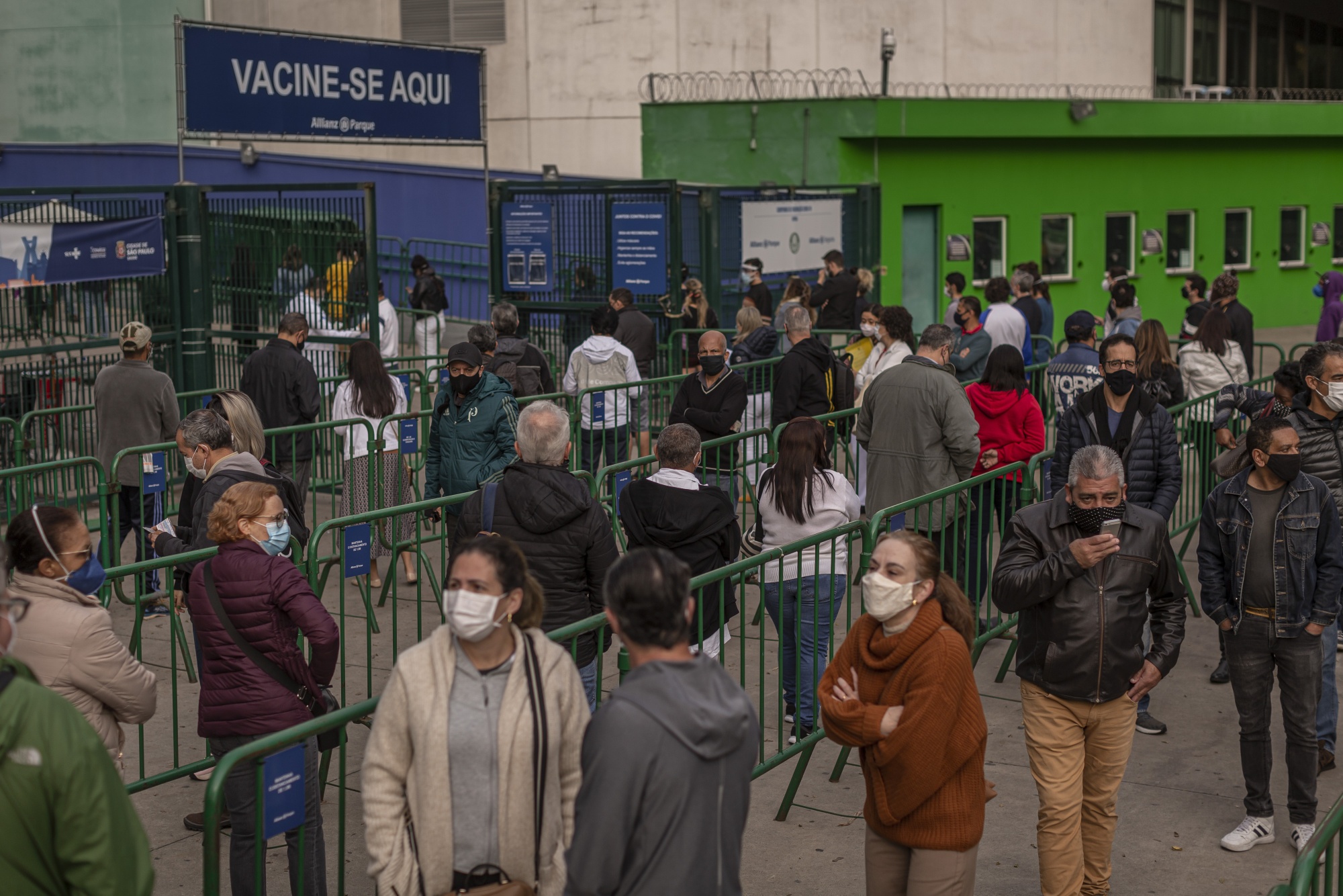 Residents wait in line to receive a dose of the Sinovac vaccine at the Allianz Parque Stadium in Sao Paulo in June. Brazilians no longer appear to be holding out for the Pfizer vaccine, which had delayed the nation's inoculation campaign.