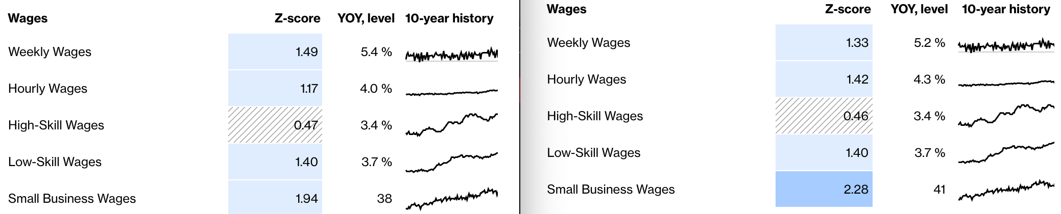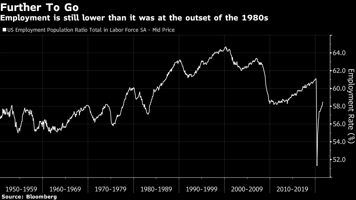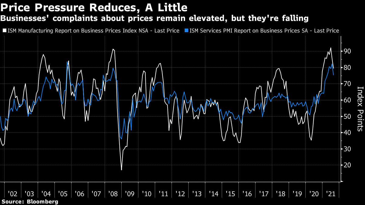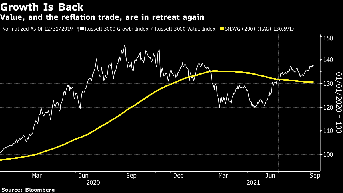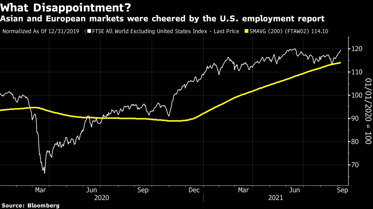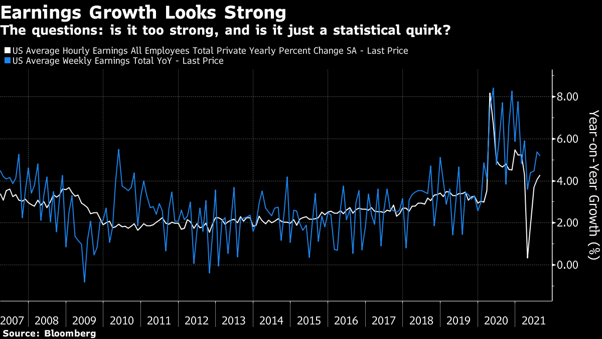 | Summer is ending with the annual celebration of labor, and it looks like labor may have a little to celebrate. Last week's non-farm payrolls data in the U.S. revealed that employment was growing rather disappointingly, but earnings growth was ticking up. This isn't a combination to cheer up anyone who is worried about stagflation, but it does continue to suggest that labor is beginning to gain greater negotiating power in its perpetual battle with capital. So, how seriously should we take this, and what effect will it have on markets? Thankfully, we are publishing the latest update of the regular inflation indicators today. You can find it here. The biggest shifts over the last few weeks have been in two categories — business surveys, which I'll come to, and the wage market. This is the latest version of the labor market indicators, on the right, with last week's on the left:  Average hourly earnings are now 1.42 standard deviations above their mean for the last decade, but weekly wage growth has reduced slightly. The two measures are a check on each other. If average hourly earnings are higher, but people are working fewer hours, there will not necessarily be much more inflationary pressure. So the effects are still ambiguous. If we look at the longer term, however, we can see that both hourly and weekly wages look elevated by recent standards. Excluding the first few months of the pandemic, hourly earnings are rising at the fastest pace since the series started in 2007:  Some of this reflects a compositional effect. In the big layoff of spring last year, the lower-paid bore the brunt. That meant that the average earnings of those left in work rose. It looks as though that compositional effect has now passed through the python. Labor statistics are still hard to trust, but on the face of it, this latest rise looks meaningful. Compared to two years ago, it looks as though wage growth is clearly trending upward. We also include indicators from the Atlanta Federal Reserve which look specifically at wages for different sectors, which aren't out for this month yet. These could help to confirm that significant wage growth is underway, or provide some reassurance that the market is still distorted by the pandemic. If the pattern of wages is on balance a little concerning, from the point of view of inflation, the latest editions of the ISM surveys of supply managers provided some cause for relief. For both manufacturing and services, the ISM numbers for prices paid, covering the inflation companies are experiencing, reduced last month. This is the heat map for those indicators:  Again, the latest numbers are on the right, and we can see businesses' anxiety is falling a little — although consumers remain braced for much higher prices. If we look at the ISMs, the change in the trend is clear:  The survey took place amid many angsty headlines about fresh supply blockages in China; it really does suggest that businesses in their day-to-day operations are seeing reasons to be less concerned about price pressure. The argument of inflation "bears" is that the pandemic will lead steadily to a wage price spiral, and the figures are consistent with that. The argument of inflation "bulls" is that the bottlenecks caused by the pandemic will prove transitory, and the figures are also consistent with that. If you want to stay rooted in empirical evidence, the debate will have to drag on. Where does that leave markets? Whatever the impact on inflation, the Fed is committed to caring about unemployment these days, and last week's data suggested that there is indeed a long way to go. This is the employment rate as a proportion of the total available population, and it is still barely any better than at the nadir of the last recession, even if it shows clear improvement over the last few months:  Belief in a genuine "reflation" trade, with people surging to spend more money, seems to be on the decline. That is a shame. But because of this, hopes that the Fed will take its time over tapering asset purchases, and then over raising interest rates, are rising. Judging by Monday's reaction in non-U.S. markets, this is deemed good news for stocks. The FTSE all-world excluding the U.S. index has rallied sharply:  The sad fact for now is that the rally is now less about the excitement of post-pandemic reflation, and more about a return to the low-rate Goldilocks pre-pandemic reality, in which investors kept buying stocks because low yields on bonds left them no choice. The relative fortunes of value (which does well when growth is plentiful) and growth stocks have shown the course of the reflation trade since the beginning of last year. For much of this year, the tide appeared to have turned decisively in favor of value and the reflation trade. No longer:  It's never wise to put too much weight on one month's data, particularly when so many figures are distorted by the pandemic. But the latest flow of statistics has led the market to position for more of the depressing post-crisis decade economy, and not for a strong and buoyant reflation. Happy Labor Day. It's time to return to the eternal debate over the Shiller CAPE. For the uninitiated, this is the cyclically adjusted price-earnings multiple, as popularized by the Yale University Nobel laureate economist Robert Shiller. Rather than compare share prices to last year's or this year's earnings, this multiple recognizes that valuations adjust for the point in the business cycle. When profits are likely to rise in future, the P/E will be higher than usual, and vice versa. To correct for this, Shiller compared prices to average inflation-adjusted earnings over the previous 10 years. This showed a series of long trends, and correctly suggested that the U.S. stock market had grown extreme before the great crashes of 1929 and 2000. Shiller publishes updates of his spreadsheet every month. The problem at present is that it suggests the market is far more expensive than 
