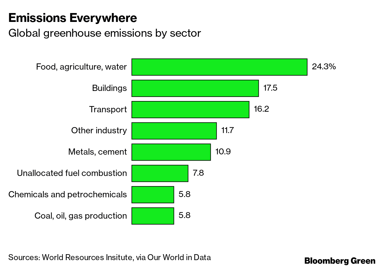 There's also now a pleasing alignment between the number of firms interested in climate tech sectors and those sectors' climate significance. Food and water is the single biggest category of emissions today; transport is third, only slightly behind the buildings sector, which consumes a great deal of both electricity and heat generated by fossil fuels.