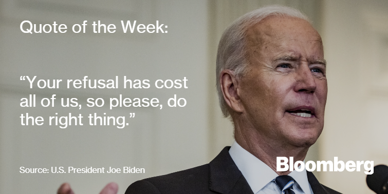 Biden Orders Shots for Millions, Calling Unvaccinated a Threat Biden said he's ordering millions of executive branch employees, federal contractors and health-care workers to receive Covid-19 vaccines. Josh Wingrove and Jenny Leonard write that he criticized the 25% of American adults who decided not to get inoculated, saying they're dragging out the pandemic that has claimed more than 650,000 lives in the U.S.  Biden-Xi Phone Call Raises Key Question: Who Will Blink First? Biden's frustration with months of little progress in U.S.-China relations led him to initiate a call with Xi in search of a breakthrough. Now the question is who will be first to take concrete action.