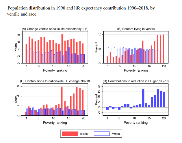 If improvements in mortality rates of White and Black Americans had continued at the 1990-2012 rate, the racial gap in life expectancy would have closed by 2036, according to new research published by the National Bureau of Economic Research. Although there is a large gap between Black and White American life expectancy, it fell 48.9% between 1990-2018, mainly due to mortality declines among Black Americans Instead, life expectancy for both Black and White Americans plateaued or slightly declined after 2012. The stalling was most evident among Black Americans even prior to the Covid-19 pandemic.