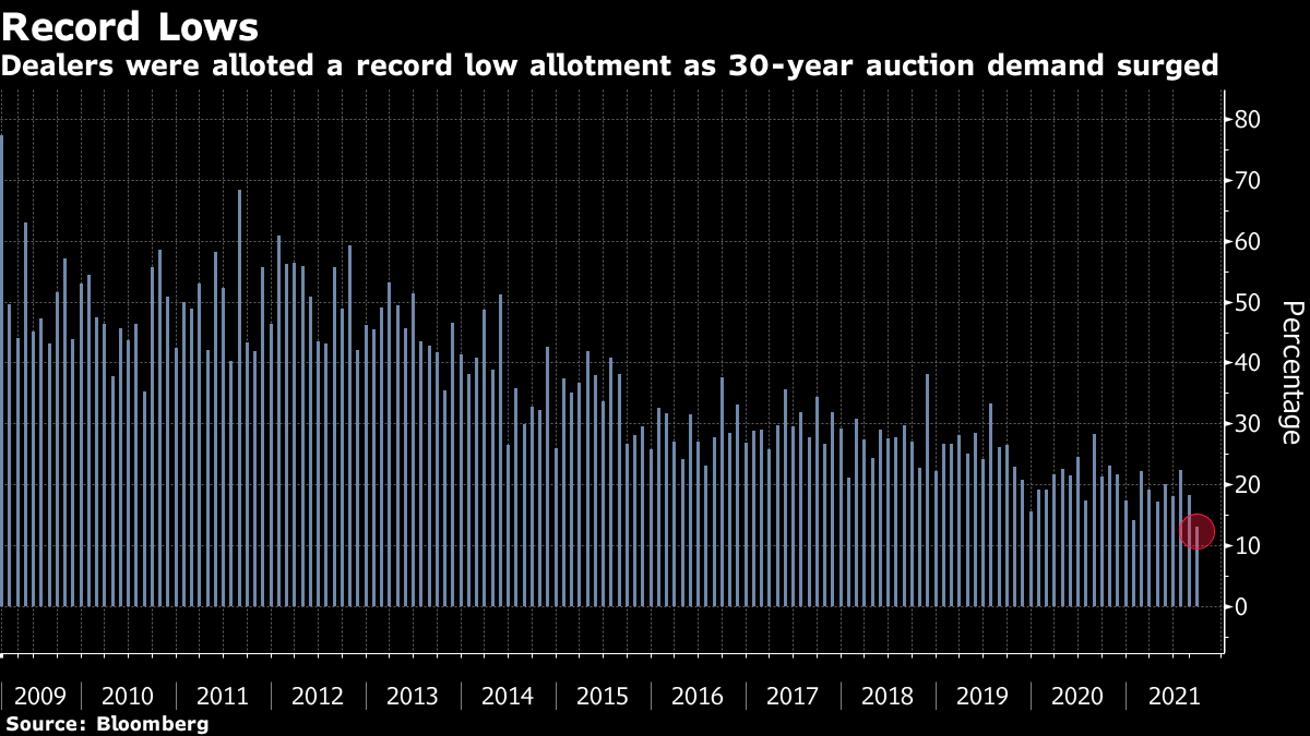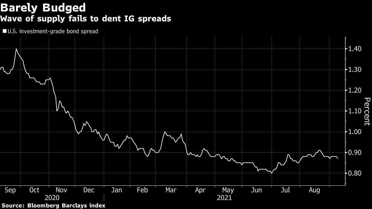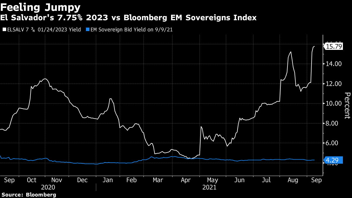 | Welcome to The Weekly Fix, where demand for blue-chip bonds is always insatiable. I'm cross-asset reporter Katie Greifeld. If there's a single takeaway from this week, it's that investors really, really want bonds right now. Luckily, they had plenty to pick from: in the span of 72 hours, 52 separate investment-grade credit deals hit the market. While the week after Labor Day tends to be busy, those three sessions rank among the busiest of all time. Wednesday's slate of sales saw order books three times covered on average, while deal execution has been orderly overall. Not to mention, IG spreads barely budged at all this week.  "Buyers have not been scared at all. We have not seen spreads back up or any deals struggle to get done," Matt Brill, head of U.S. investment-grade credit at Invesco Ltd., told Bloomberg's Jack Pitcher. "Us investors are saying 'Hey, keeping bringing more. We're not getting enough bonds." It was a similar story on the government debt side as the U.S. Treasury auctioned $120 billion worth of 3-, 10- and 30-year securities this week. All three sales stopped through, but Thursday's $24 billion 30-year offering was the real show-stopper. Not only did the sale draw a yield 2 basis points below the when-issued rate, but dealers -- who are obligated to bid -- were allotted just 13.1%, a historic low.  Taken together, all those superlatives point to insatiable demand for bonds, says Richard Bernstein Advisors's Michael Contopoulos. There is so much money out there and balance sheets are so strong and continue to improve, I think there is little at the moment that will upset the apple cart for credit. With regard to Treasuries, it's a similar story with regard to so much cash. Then throw in a payroll miss, the narrative of peak everything, and low global yields, and Treasuries at local highs seems to have made sense for a large cohort of investors. At the European Central Bank meeting Thursday, policy makers pledged to slow the pace of pandemic bond-buying in the final quarter of 2021, in a move that President Christine Lagarde insists is not tapering. "The lady isn't tapering," she told reporters in Frankfurt, which multiple colleagues have told me is a nod to Margaret Thatcher. Rather, the ECB's decision is "a recalibration of the pandemic emergency purchase program for the next three months." Alright, fine. That stirred some predictable snark on Twitter, with Janney Montgomery Scott's Guy LeBas quipping "Tapering is not tightening, and recalibrating is not tapering. Apparently. @ecb" Bespoke Investment Group's George Pearkes largely shared that sentiment, tweeting "If a central bank reduces accommodation while upgrading inflation forecasts, what exactly do we call that."  I followed up with Pearkes, who noted that yield curves flattened "like a banshee" all day Thursday. Sure enough, 10- and 30-year bund yields both dropped by about 3 basis points. Still, Invesco chief market strategist Kristina Hooper made the point on Bloomberg's " QuickTake Stock" that the while 'recalibration' could be taken as an extreme example of central-banker speak, it highlights how the ECB approaches quantitative easing: We can quibble over terms, I think they want to call it an adjustment, and I think it's probably fair to describe it that way. At least the way the ECB interprets asset purchases, it thinks of it more as a dial. So that this is some kind of recalibration, it can always be dialed up again. Whereas the Fed tends to take an approach that when we begin this we're looking to end it in the near future and we're not treating it as a dial. What was heralded as the biggest test ever for Bitcoin turned into a real bust for El Salvador bondholders. The nation became the first to accept the coin as legal tender on Tuesday -- a day when the price of Bitcoin plunged as much as 17% amid a glitch-riddled rollout. That's great for traders, maybe not so much for El Salvador's citizens and creditors. Bloomberg's Sebastian Boyd noted that the bid yield on the country's 7.75% bonds due 2023 spiked to a record high, while El Salvador's CDS moved to price in a 25% chance of default by March 2026. That spike inverted El Salvador's entire yield curve, a move that began in June -- when the law to adopt Bitcoin was initially passed, wrote Bloomberg's Tracy Alloway.  However, both Boyd and Alloway point out that the bond slump may have more to do with a ruling that El Salvador's sitting president -- in this case, the popular but unpredictable Nayib Bukele -- can run for a second term. Bukele has roiled the nation's debt market in the past, and this latest bout of volatility comes at a precarious time as the country neogiates with the International Monetary Fund for some much-needed support. But in the eyes of Ambrus Group co-chief investment officer Kris Sidial, the rocketing yields have more to do with debtholders fretting about Bitcoin rather than another Bukele term. "People are fearful that the currency will be too integrated with crypto and the debt could default if crypto gets hurt," Sidial said. "Realistically, foreign investors have been positive on Bukele. He seems to want to turn the country around, which is good for emerging-market investors. If I was a bond holder and Bukele did another term, I would probably be more inclined to have more bond exposure, not lighten it." It feels like everyone's a trader now, including Federal Reserve regional bank presidents. Boston Fed chief Eric Rosengren and Dallas Fed's Robert Kaplan came under fire this week after annual disclosures filed last month showed the pair engaged in active trading across a range of asset classes and investment vehicles. The disclosures showed that Rosengren -- who has warned repeatedly about overheating risks in the U.S. real estate market -- held stakes in four separate real estate investment trusts. He also bought and sold shares of Annaly Capital Management Inc., a REIT that holds agency mortgage-backed securities. The Fed