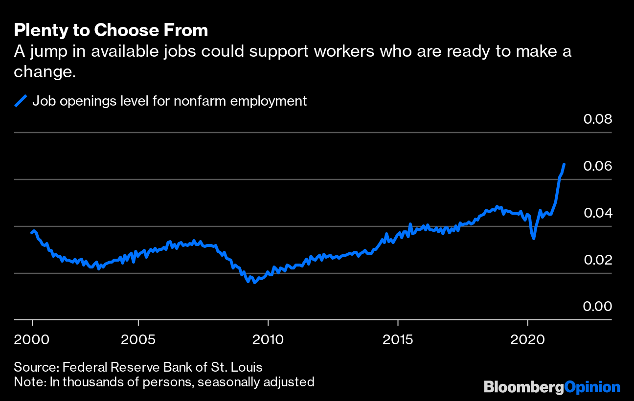 | This is Bloomberg Opinion Today, a symphonic journey through sonic vistas of Bloomberg Opinion's opinions. Sign up here.  Uh-oh. Photographer: OLIVIER DOULIERY/AFP/Getty Images Wall Street can sometimes be this weird Bizarro World where everything is topsy-turvy and good news is bad news. For example, normal humans like it when other humans get jobs. They tweet "OMG CONGRATS!" and click "like" on LinkedIn. But Wall Street humans don't like it when other humans get jobs. More jobs means less profit and higher wages and more inflation and less money printer go brrr. This holds on both the macro and micro level. For example, Fidelity plans to hire 9,000 people to handle the overwhelming retail demand for stonks. Normal humans might hear this and think, "Good for Fidelity" or "Good for those 9,000 people" or "Good for stonks." Wall Street humans hear this and think, "We're doomed." As Jared Dillian points out, "Wall Street hires on the highs, and fires on the lows." The addition of 9,000 souls to Fidelity's ranks is right up there with magazine covers and taxi-driver stock tips as a sign of dangerous market froth. At the same time, the job market is stuck in this super-weird flux period, where unemployment is still much higher than it was before the pandemic began, but job openings have yawned.  So does this mean the job market is good for the stock market, or bad? What matters to Wall Street is that the Fed is still focusing more on the high-unemployment side of things and keeping interest rates low. That could keep stocks high. At the same time, all of those job openings mean this could be a once-in-a-generation opportunity to change careers, as Conor Sen writes. We hear Fidelity is hiring. As a parent, when I heard China plans to limit kids to three hours of video games a week, my main reaction was envy. Sure, my house is also an authoritarian state, but there are limits; holding my kids to three hours a week would be just begging for revolution. But maybe China and I are thinking about this all wrong. Tae Kim writes video games these days aren't like the ones that drove Joe Lieberman to distraction back in the '90s. Games in my day at best prepared you to fight off alien invasion. Today's games teach kids critical social and technological skills that will help them in actual life, or so the kids say. We wrote yesterday about how China was its own worst enemy in the new Cold War. Raising a generation of game-starved kids might be another example. President Joe Biden wants to start rolling out Covid booster shots less than three weeks from now, but it's worth asking what, exactly, the rush is. Two leaders of the FDA's vaccine office recently quit over Biden pushing this idea without getting FDA approval first. And scientists keep casting doubt on whether boosters are necessary for all people, or at all. Even with the delta variant, vaccines are still highly effective at keeping most people out of the hospital, Max Nisen writes. We still need a lot more data before jumping into a mass booster program, especially when so many Americans haven't had even their first shot. Chasing away key FDA regulators in the middle of a pandemic won't help with that.  Booster shots will be good business for the pharma industry, writes David Fickling. But that could be bad news for public health, taking supply away from people who need it a lot more. India's huge GDP rebound masks deep-rooted problems that could mean years of lost potential, warns Andy Mukherjee.  Biden's Afghanistan speech was a misfire in some ways, but got one big thing right: It was time to go. — Jonathan Bernstein Biden is reviving the cruise-missile approach to fighting terrorism, which we know doesn't work. — Eli Lake It's time for Biden to intervene in Ethiopia's civil war by cracking down on Abiy. — Bobby Ghosh Ida is a reminder that food supply is growing more vulnerable to natural disasters as the planet warms. — Amanda Little Space junk has gotten to the point where it's a real threat, potentially making parts of Earth orbit unusable. — Adam Minter Atheists can be chaplains too. — Stephen Carter The Supreme Court didn't stop Texas from banning most abortions. U.S. Covid hospitalizations fell for the first time since June. Even mild Covid patients are at higher risk of kidney disease. The Diapers.com founder wants to build a utopian megacity. Area traffic patrol officer is an actual chicken. (h/t Ellen Kominers) For sale: the world's biggest triceratops. (h/t Mike Smedley) Area man can change his pupil size on command. Watch tardigrades walking.  Notes: Please send Old Bay and complaints to Mark Gongloff at mgongloff1@bloomberg.net. Sign up here and follow us on Twitter and Facebook. |